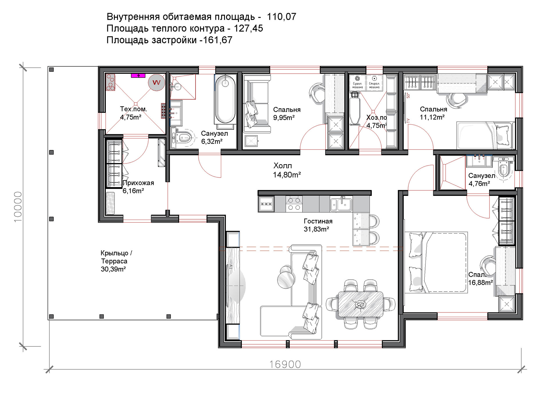Площадь внутренних помещений 110 кв.м. Площадь террасы 30 кв.м. Общая площадь (по выписке ЕГРН) 147,8 кв.м. В доме предусмотрен дополнительный отдельный санузел в спальне родителей, а также помещение, где может располагаться прачечная и гардеробная.