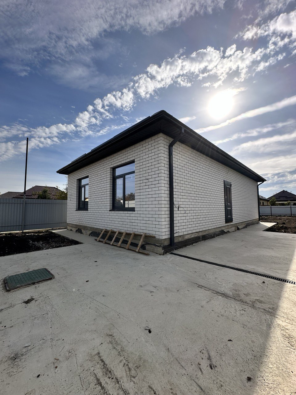 Ленточный фундамент, материал стен — газоблок, наружные стены —облицовочный кирпич, металлопластиковые окна с цветным профилем, кровля — металлочерепица. Дом общей площадью 80 кв. м современной планировки: холл, три изолированные спальни, кухня-гостиная с выходом на задний двор, раздельный санузел. Дом — в предчистовой отделке, теплые полы, радиаторы отопления, двухконтурный газовый котел. Коммуникации: свет, канализация — септик, вода — скважина 35 м, газ по меже Дом расположен на четырех сотках земли, назначения СНТ.