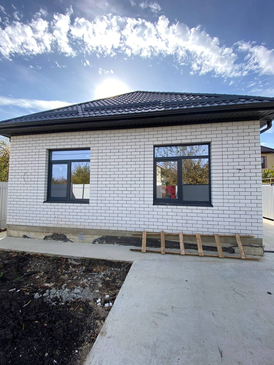 Продам новый кирпичный дом в районе Ейское шоссе, СНТ "Хуторок-2", Прикубанский округ Краснодара. Одноэтажный коттедж возведен в современном архитектурном стиле: ленточный фундамент, материал стен — газоблок, наружные стены —облицовочный кирпич, металлопластиковые окна с цветным профилем, кровля — металлочерепица. Дом общей площадью 80 кв. м современной планировки: холл, три изолированные спальни, кухня-гостиная с выходом на задний двор, раздельный санузел.