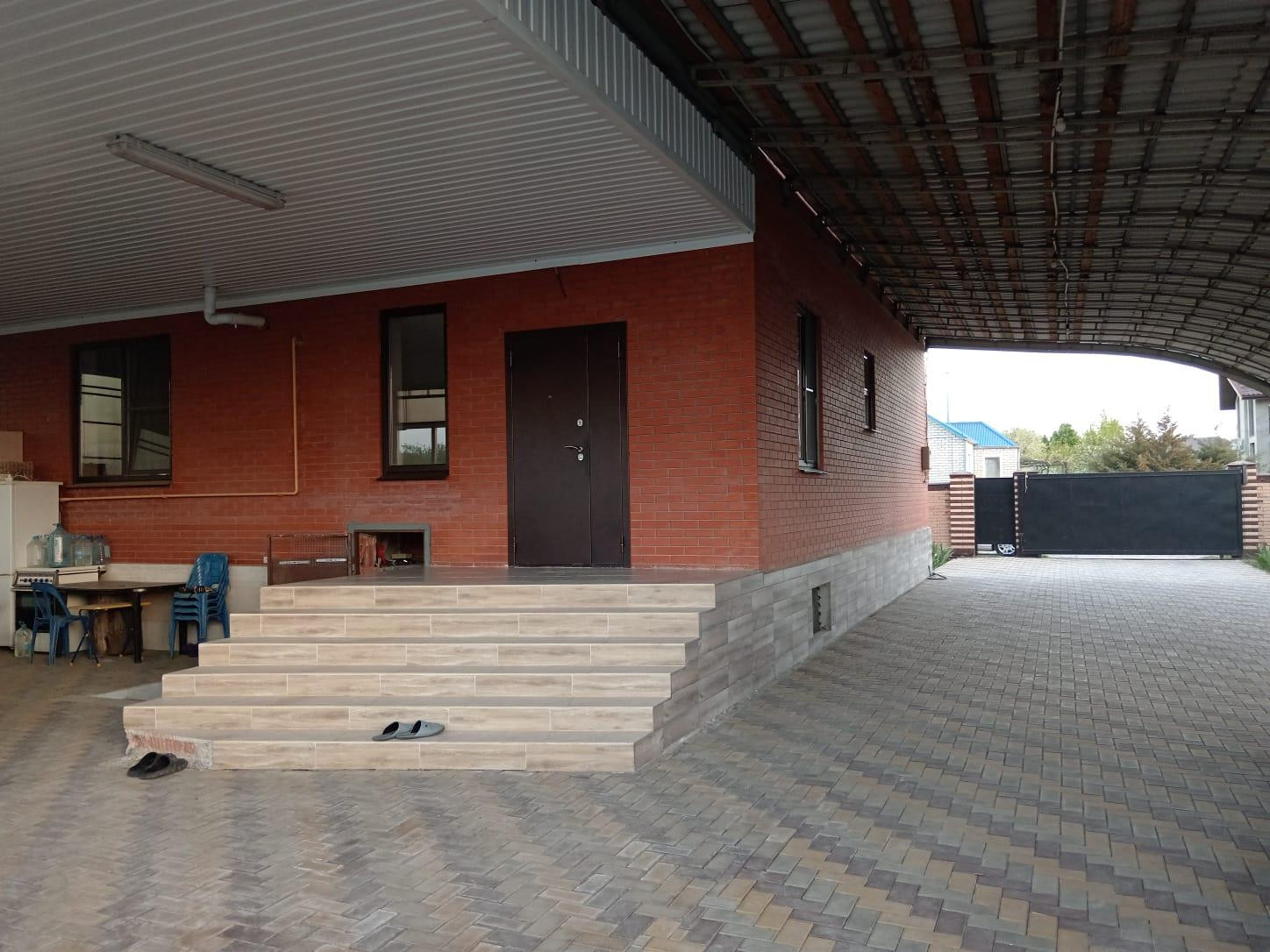 Вдоль всего дома сделан навес ,под которым можно разместить несколько автомобилей и теннисный стол.Есть место для цветочной клумбы или посадки малины,винограда,смородины.