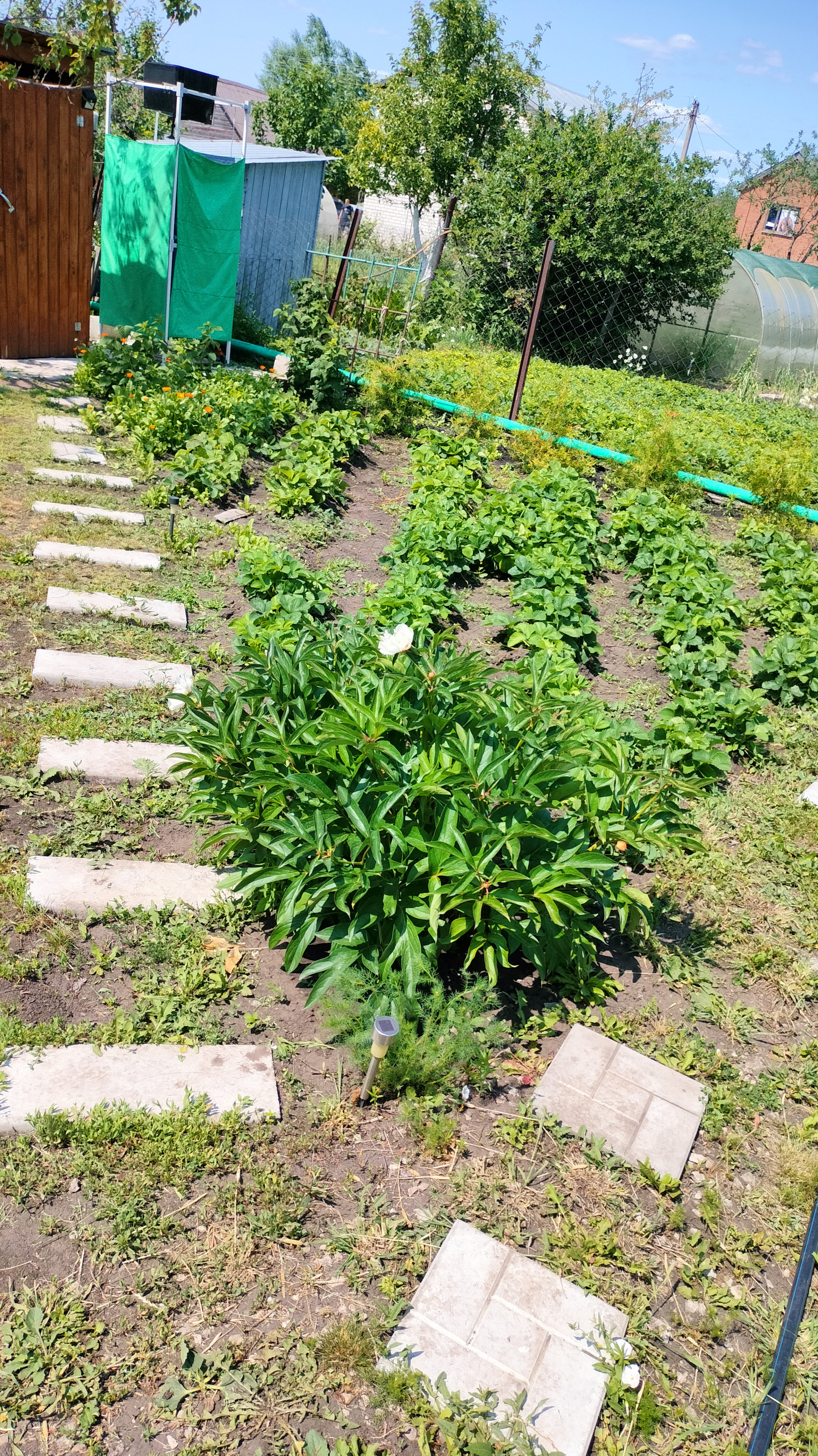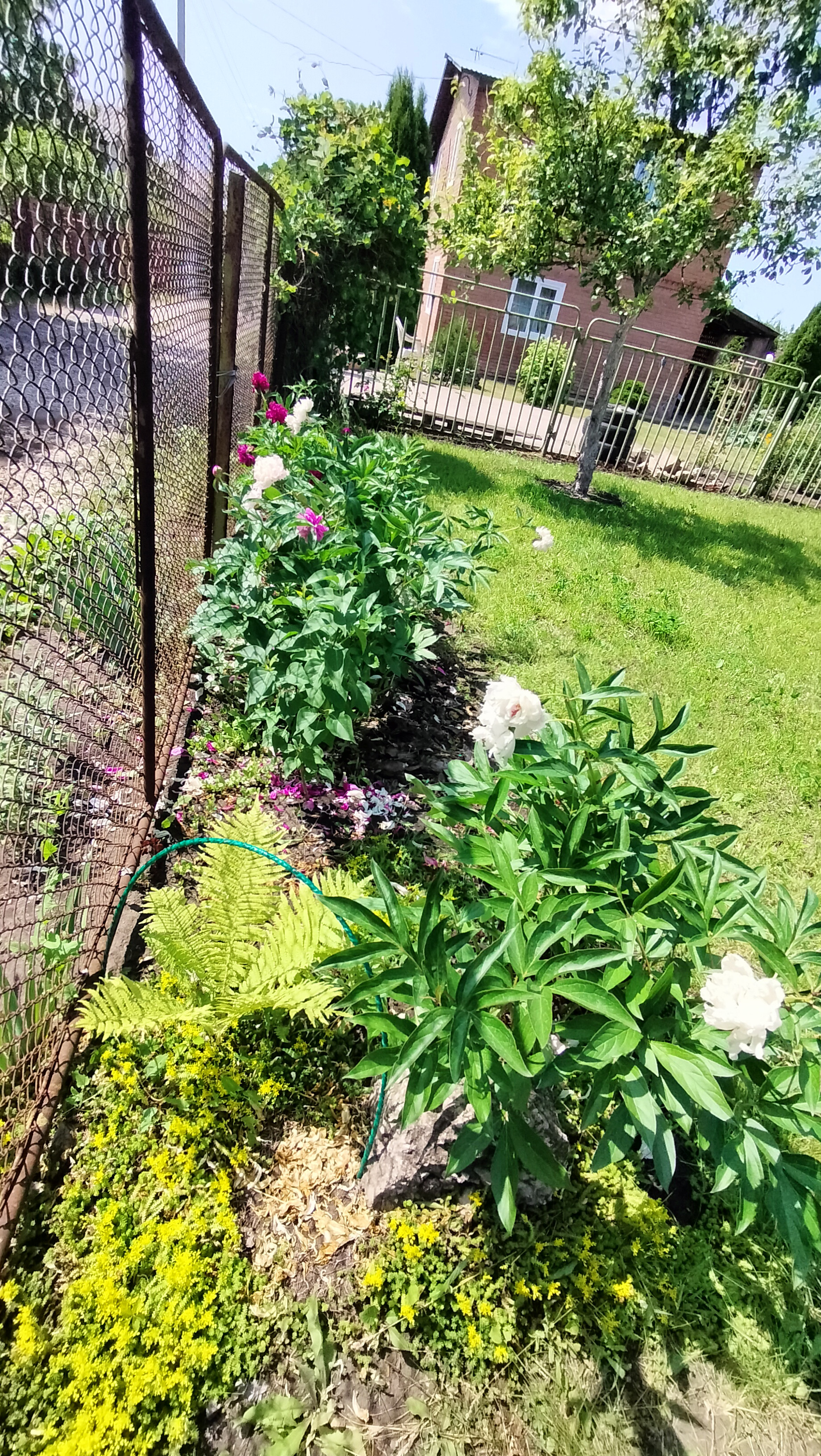 Большая площадь засеяна газоном, много цветов.