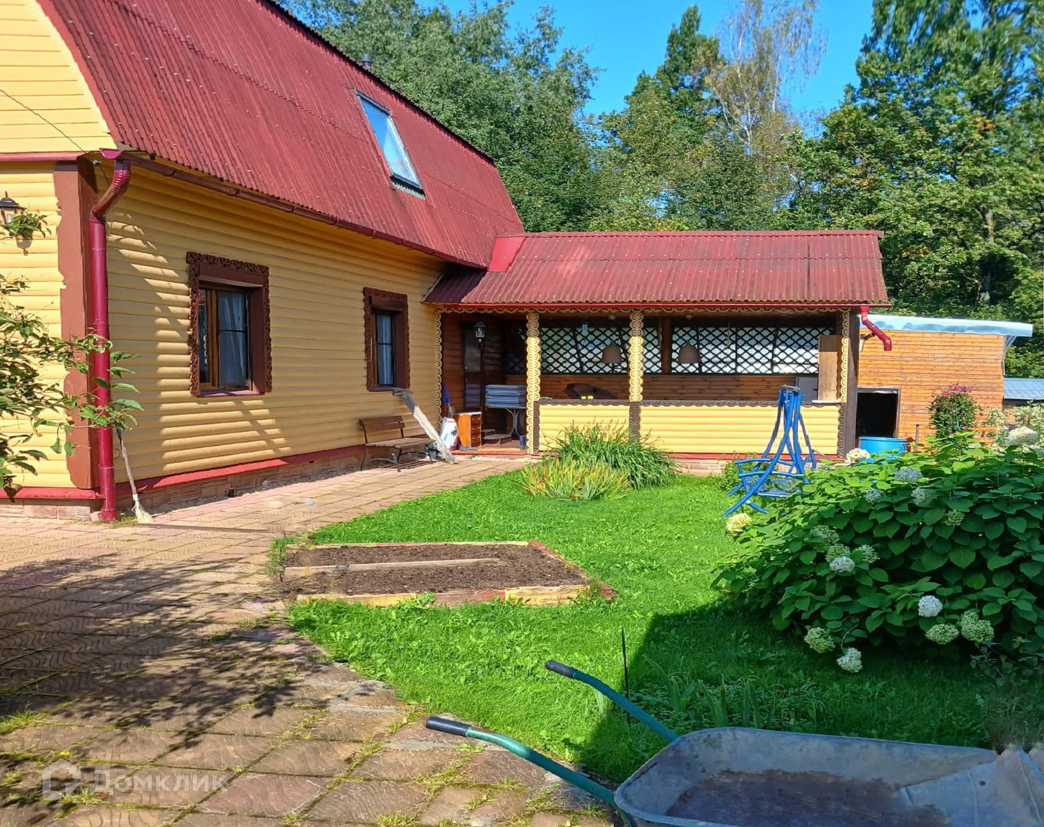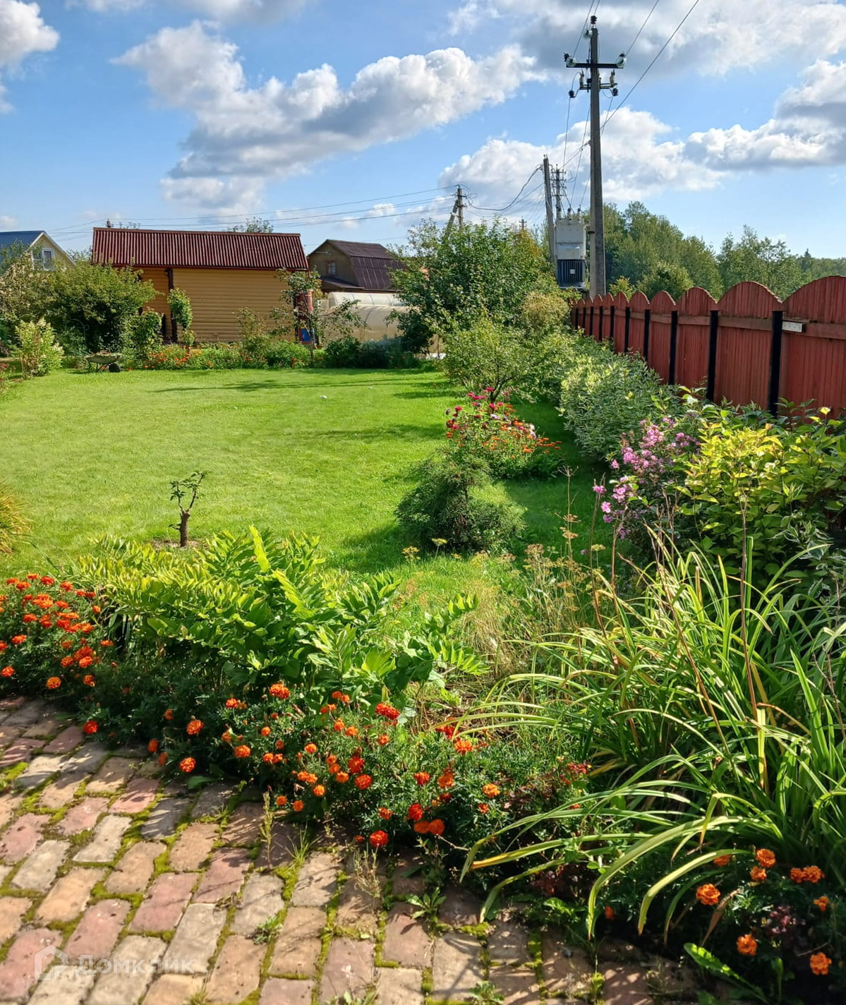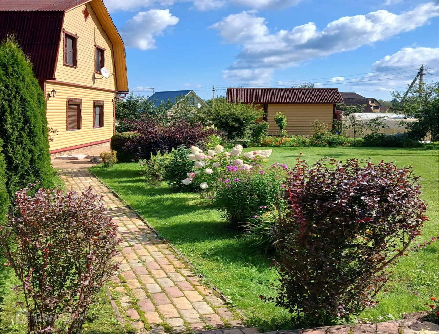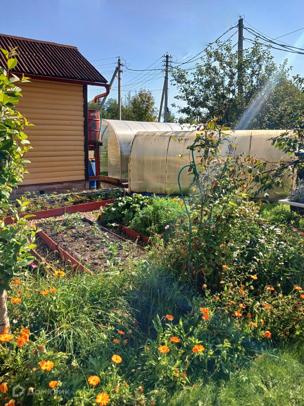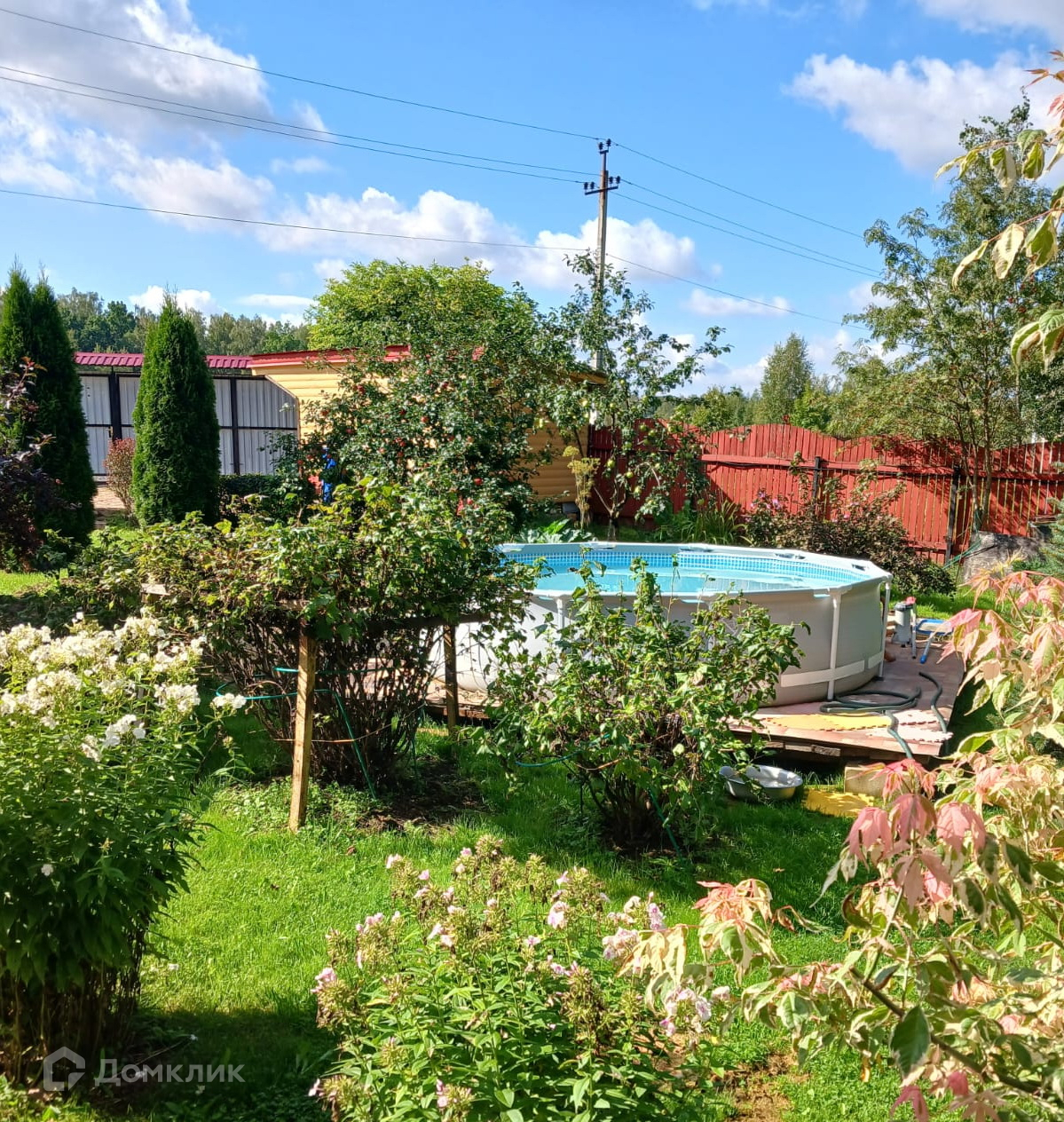 На ухоженном участке есть строения: Хозблок и мастерская 2×12 м. и всё для садоводства: 2 парника, клумбы, грядки, декоративные кустарники и растения, а для летнего отдыха в знойный день - бассейн!