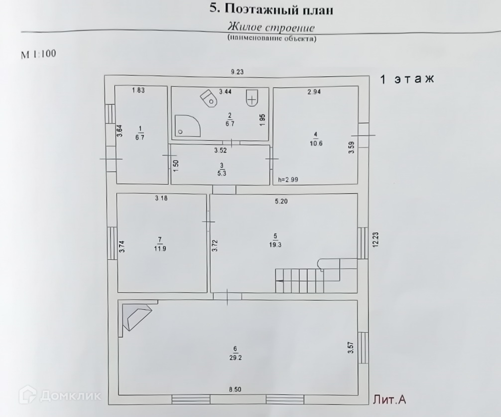 1 этаж: тамбур 6,7 м², коридор 5,3 м², котельная-топочная 10,6 м² с погребом (3х4 м, высотой 2 м) и выходом на веранду, с/у 6,7 м² с ванной и стиральной машиной, кухня 19,3 м², две комнаты: гостиная 29,2 м² и спальня 11,9 м².