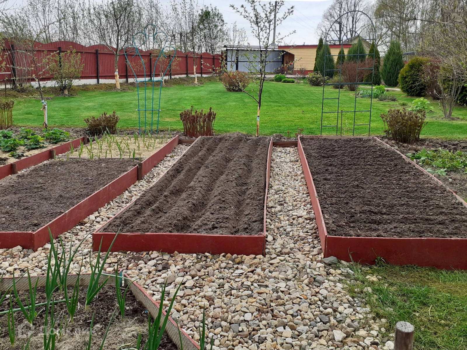 Забор: металлический штакетник.