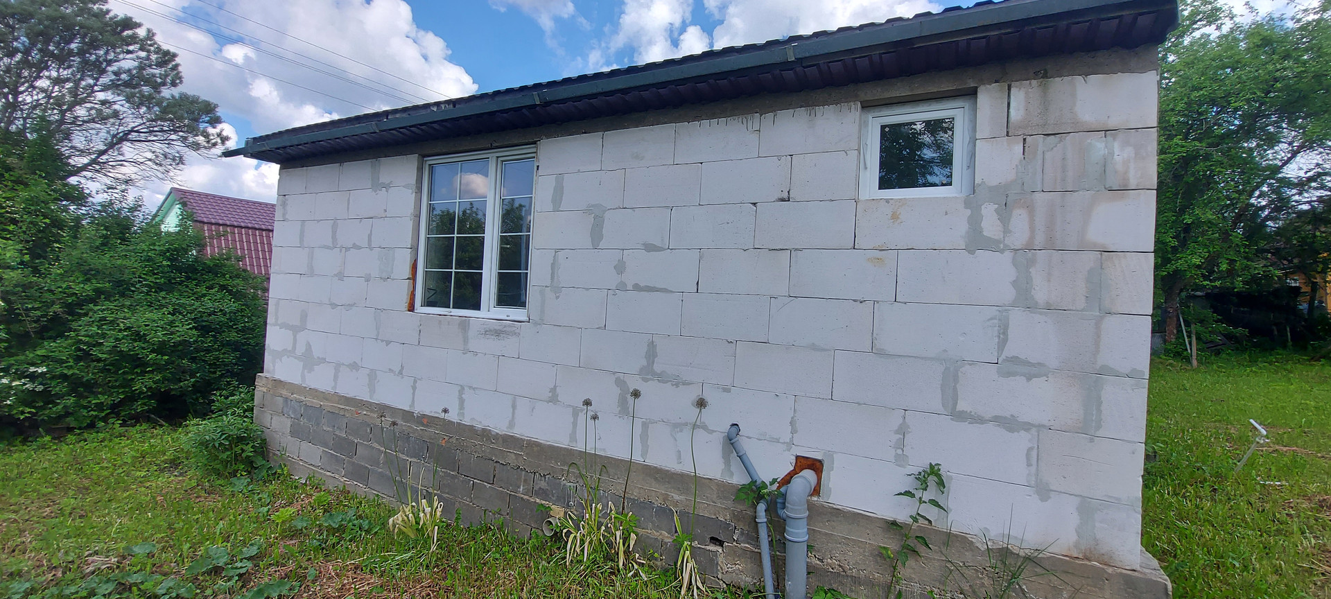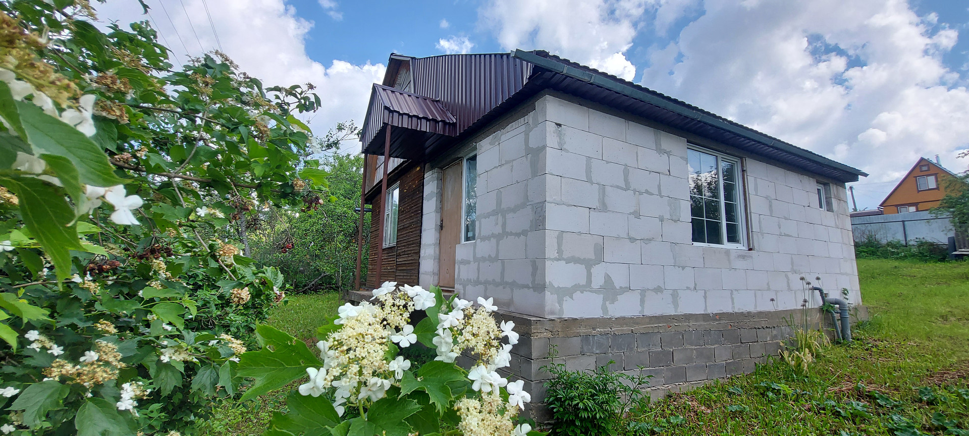 Дом теплый, стоит на ленточном фундаменте. Стены дома выполнены из блоков, обшиты деревом.