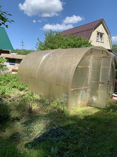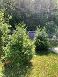 На участке растут плодовые деревья, туи. Есть парник.