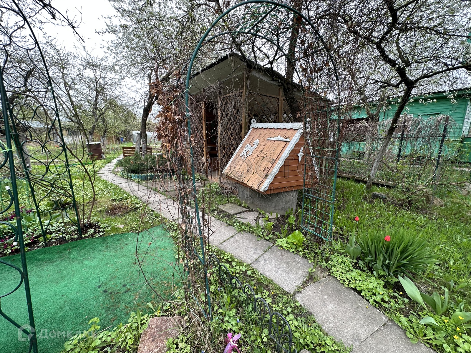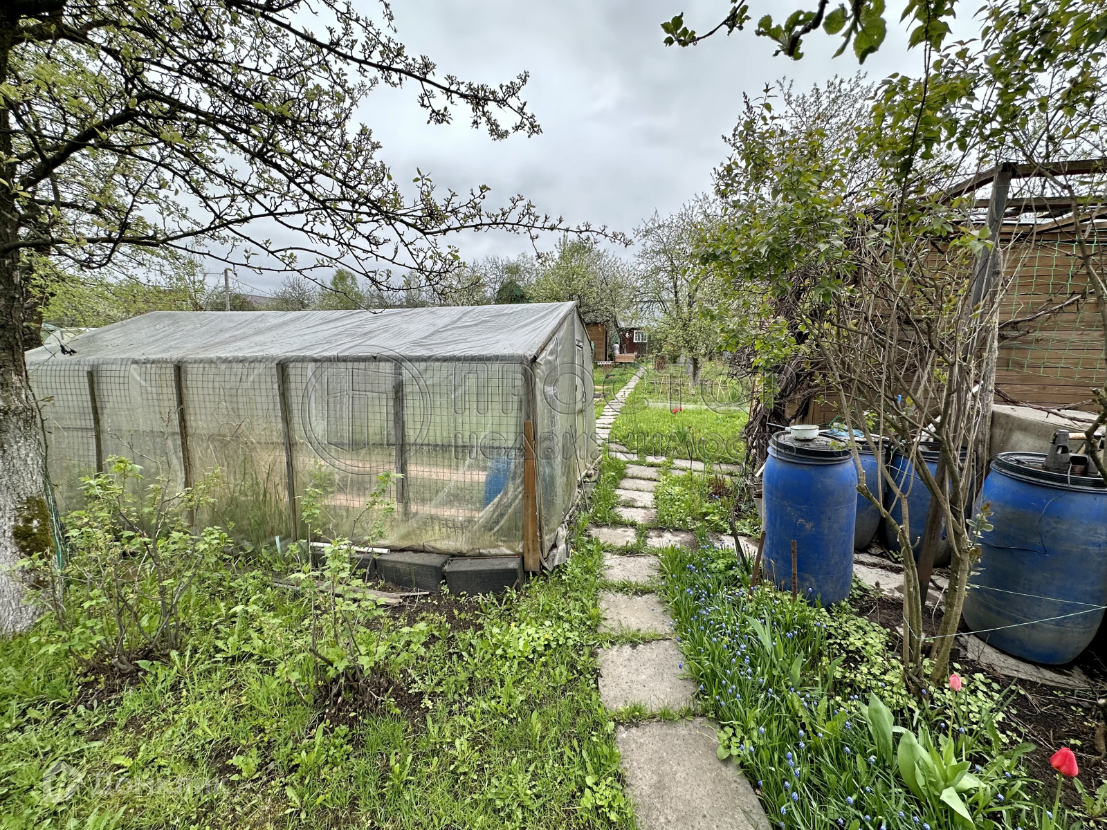 На участке находится кухня совмещённая с беседкой, колодец, система для полива растений, летний душ, парник, хозяйственный блок, есть электричество, интернет.