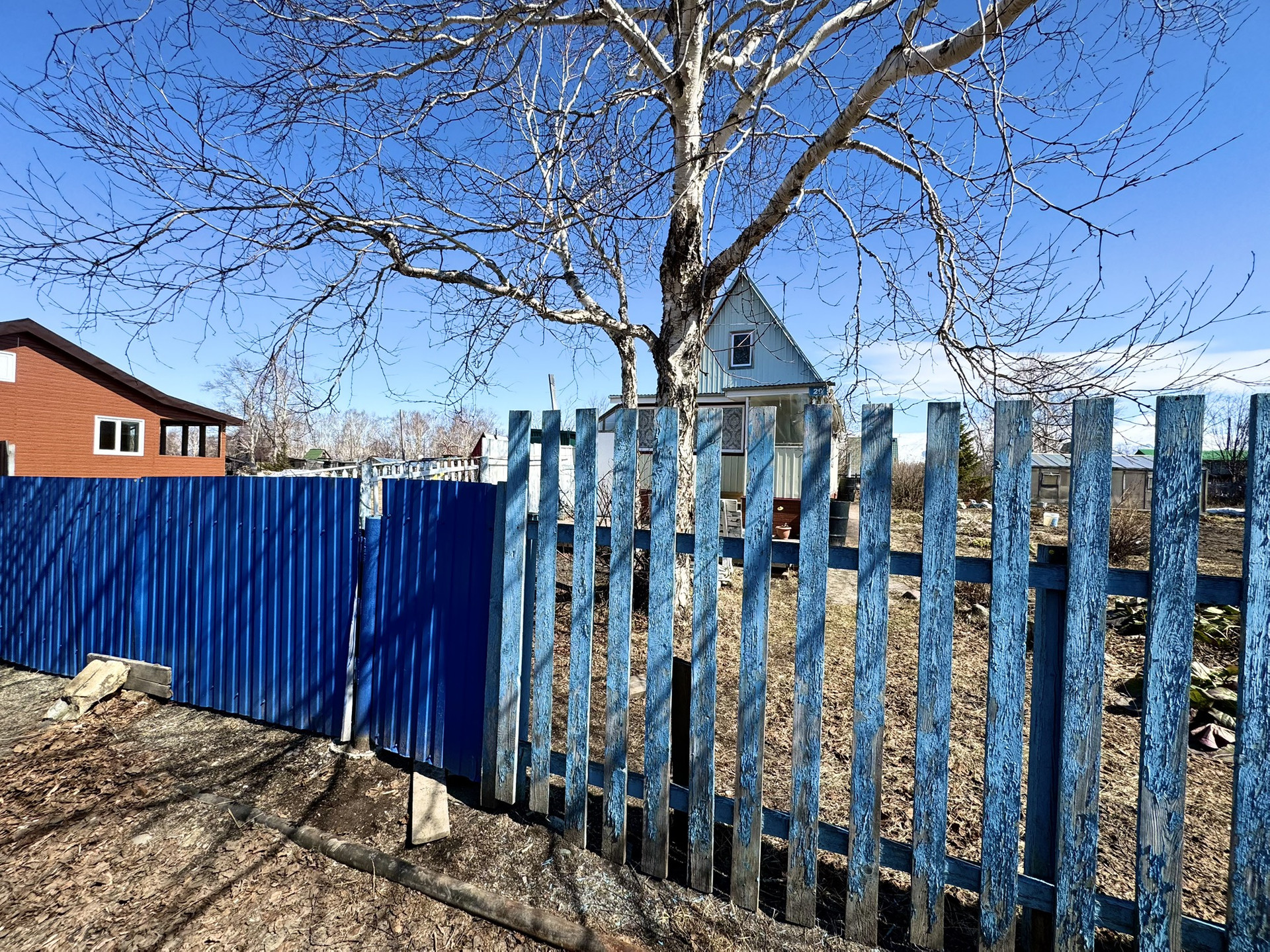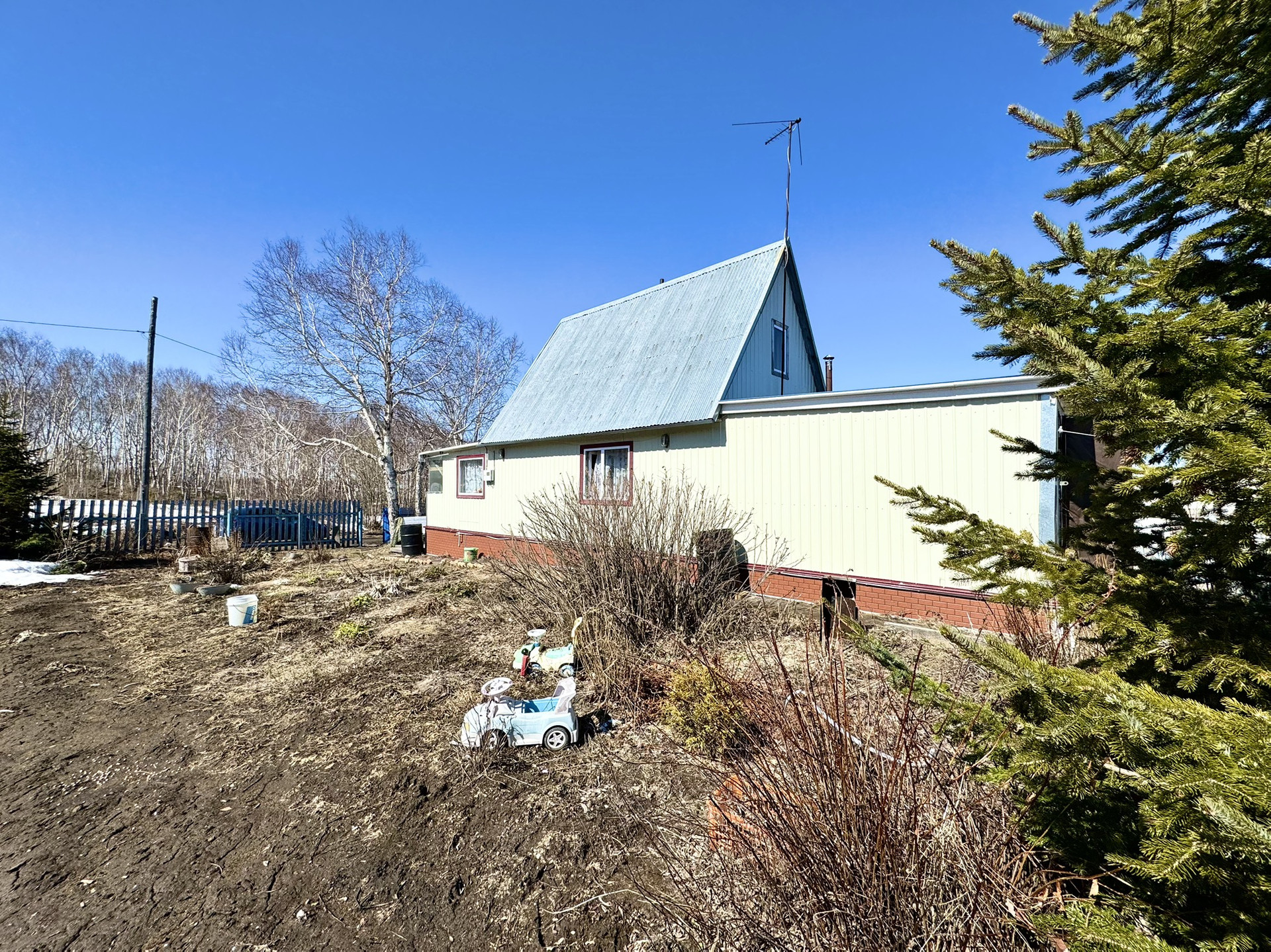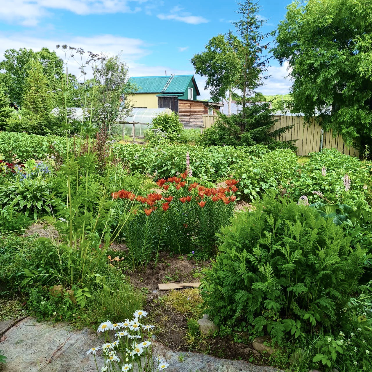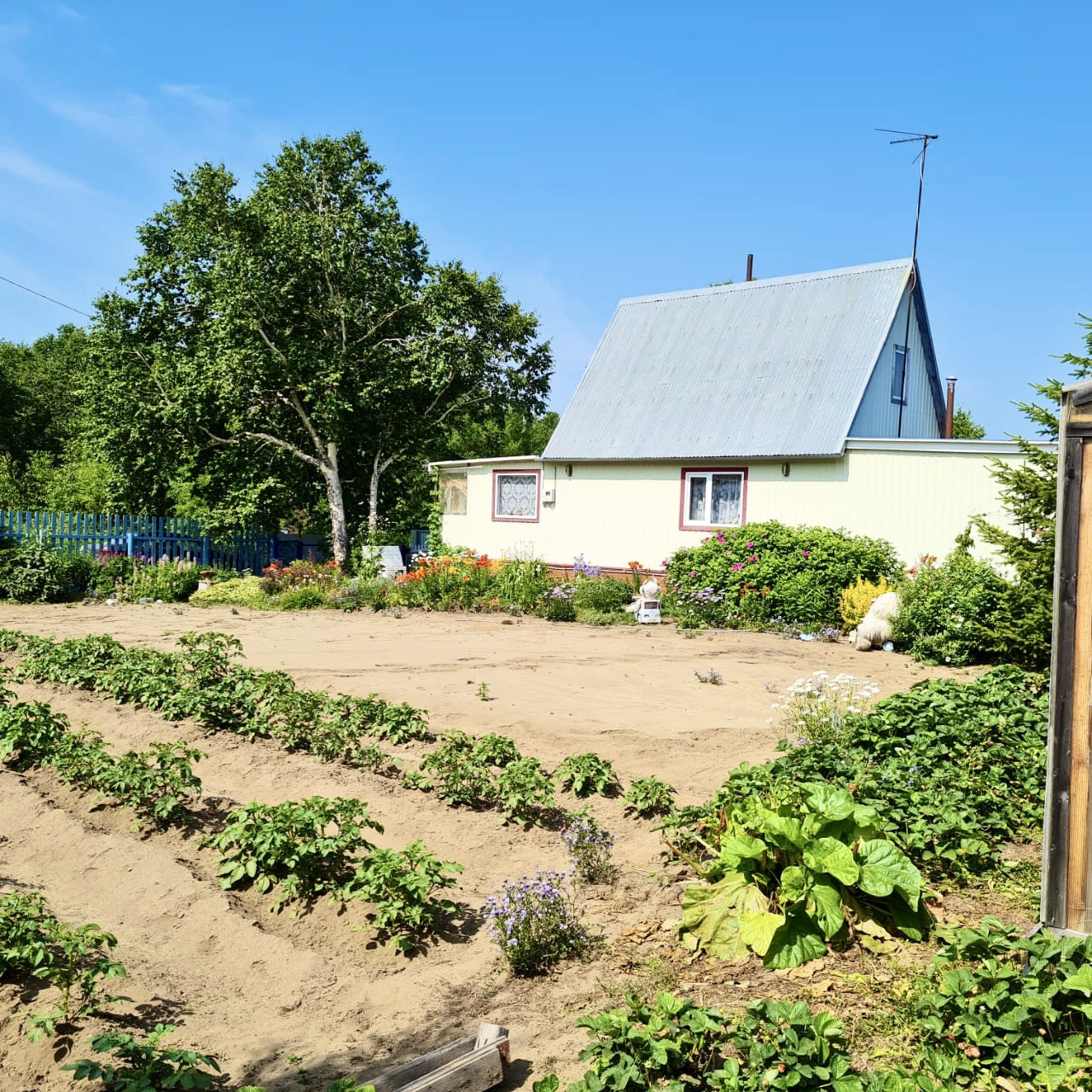 На участке посадки многолетние цветы лилия, колокольчики, кипарис, можжевельник, маки, роза приморская, дикий виноград, хмель, ирга, крыжовник, смородина черная, калина, клубника, малина, 7 высоких елок.