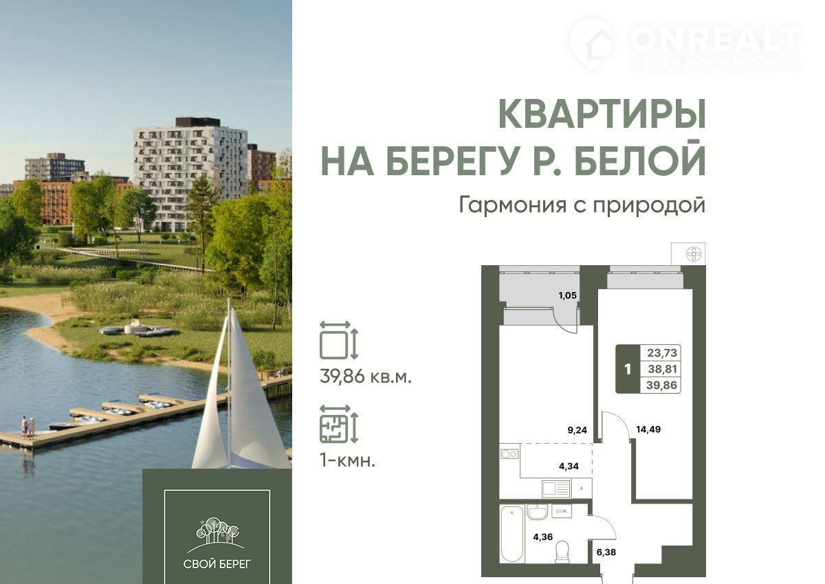 «Свой Берег» — современный жилой комплекс на берегу реки Белой, сочетающий комфорт и близость к природе.