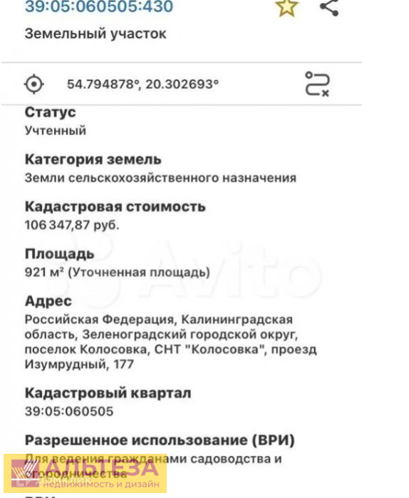 Колосовка, с/о Колосовка, 9.2 сот., Земля в собст., Пустой, Подъездная дорога с грунтовым покрытием, 39:05:060505:430, электричество-есть возможность подкл., газ-нет, водоснабжение-есть возможность подкл., канализация-есть возможность подкл. Звоните, Колосовка снт, продается участок, 9.2 соток, Номер лота: 4039497
