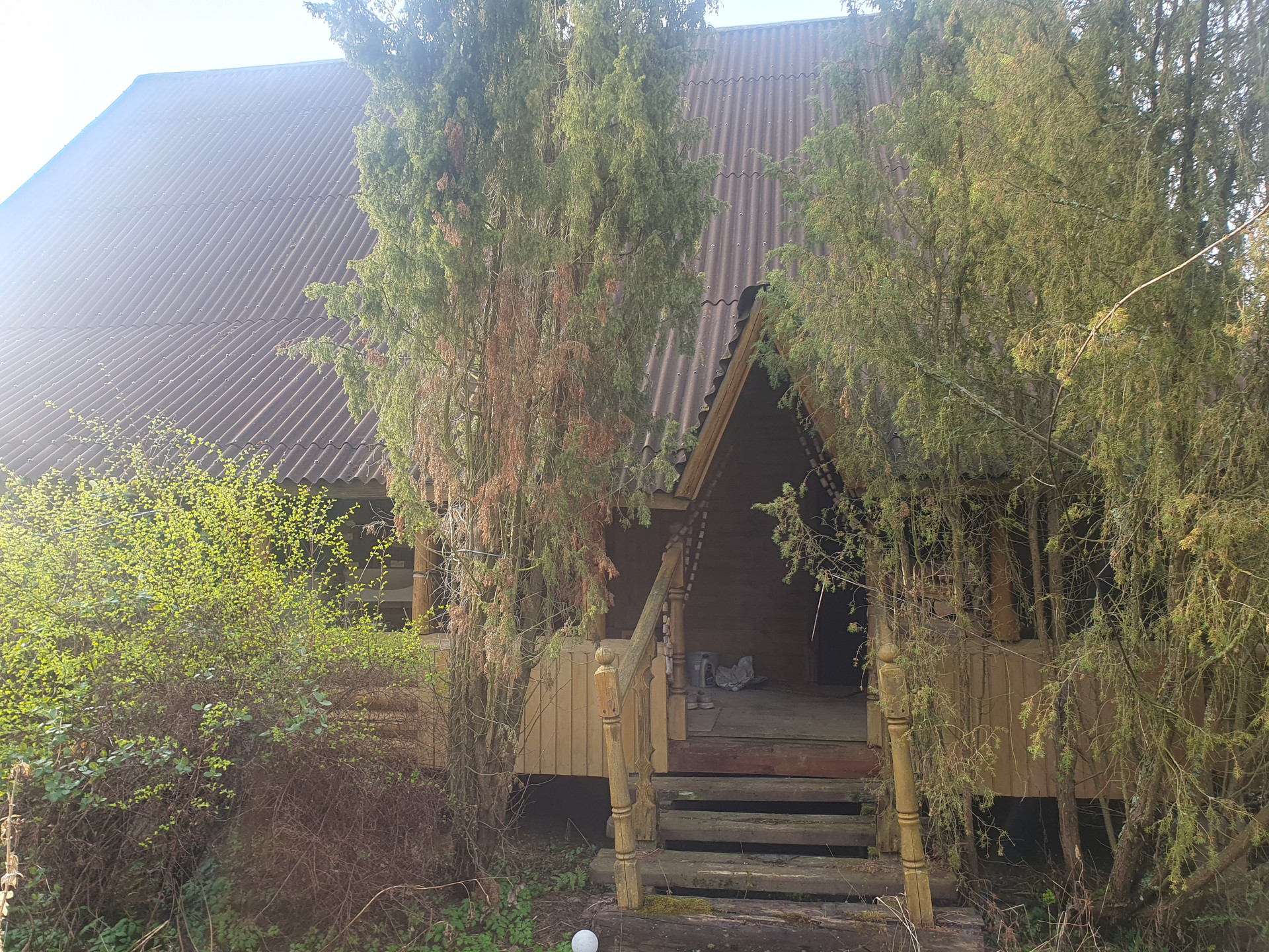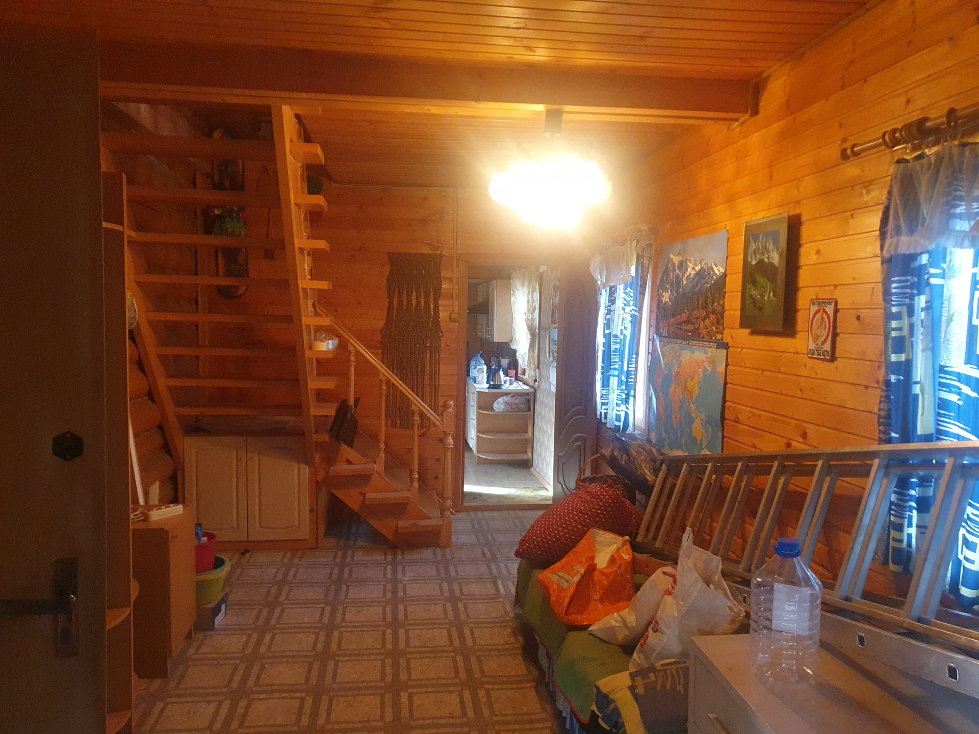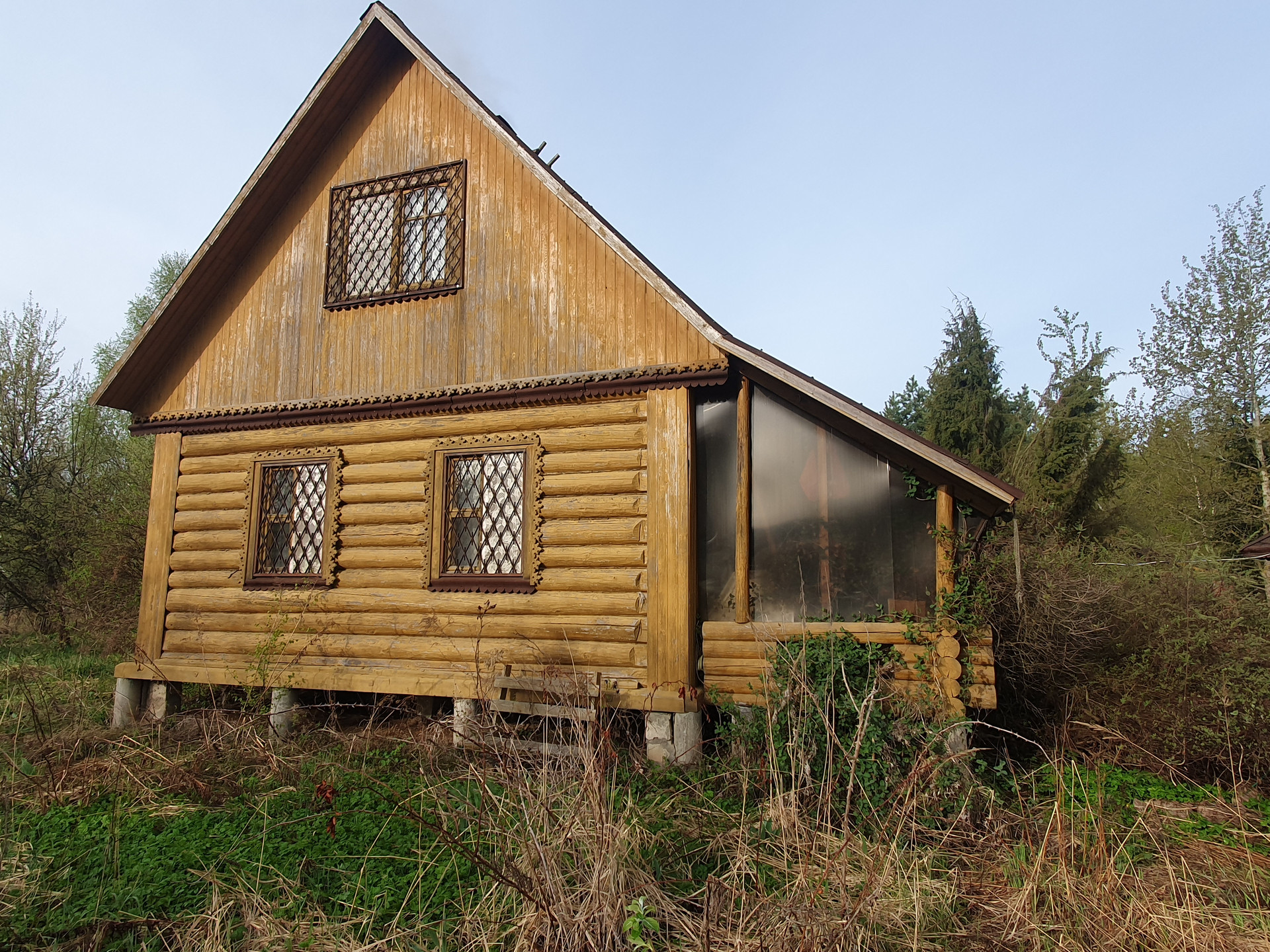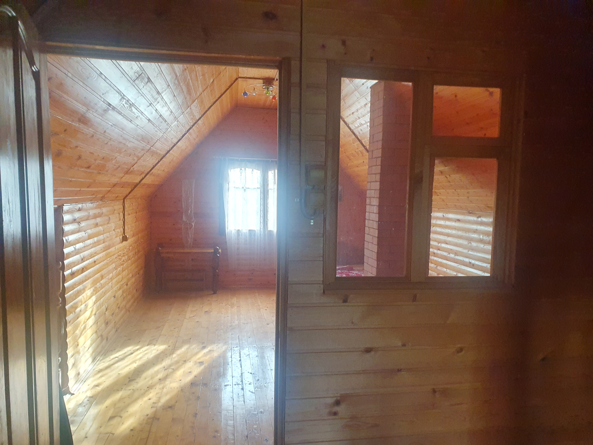 Дом двухэтажный с балконом. Основная комната (с русской печкой) и прихожая-из бревна. Пристройка (кухня и санузел) из бруса. На участке металлический вагончик (можно использовать как сарай). Скважина. Водопровод летний. 3 колодца-отстойника с дренажом (один из туалета, два других-душ и раковины). Санузел на первом этаже.