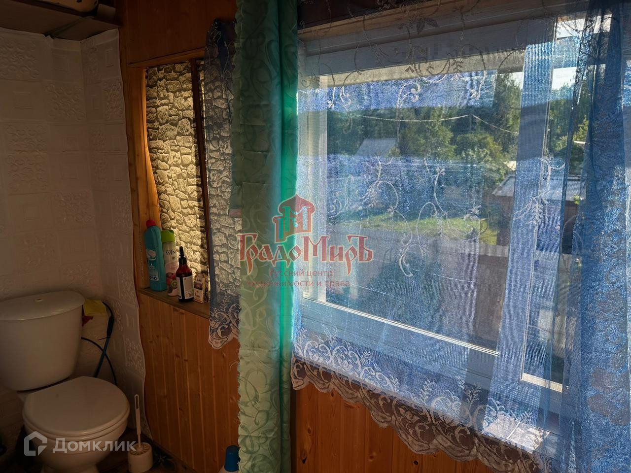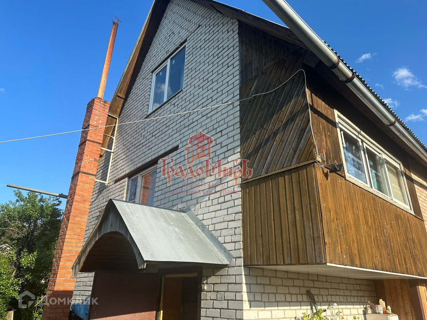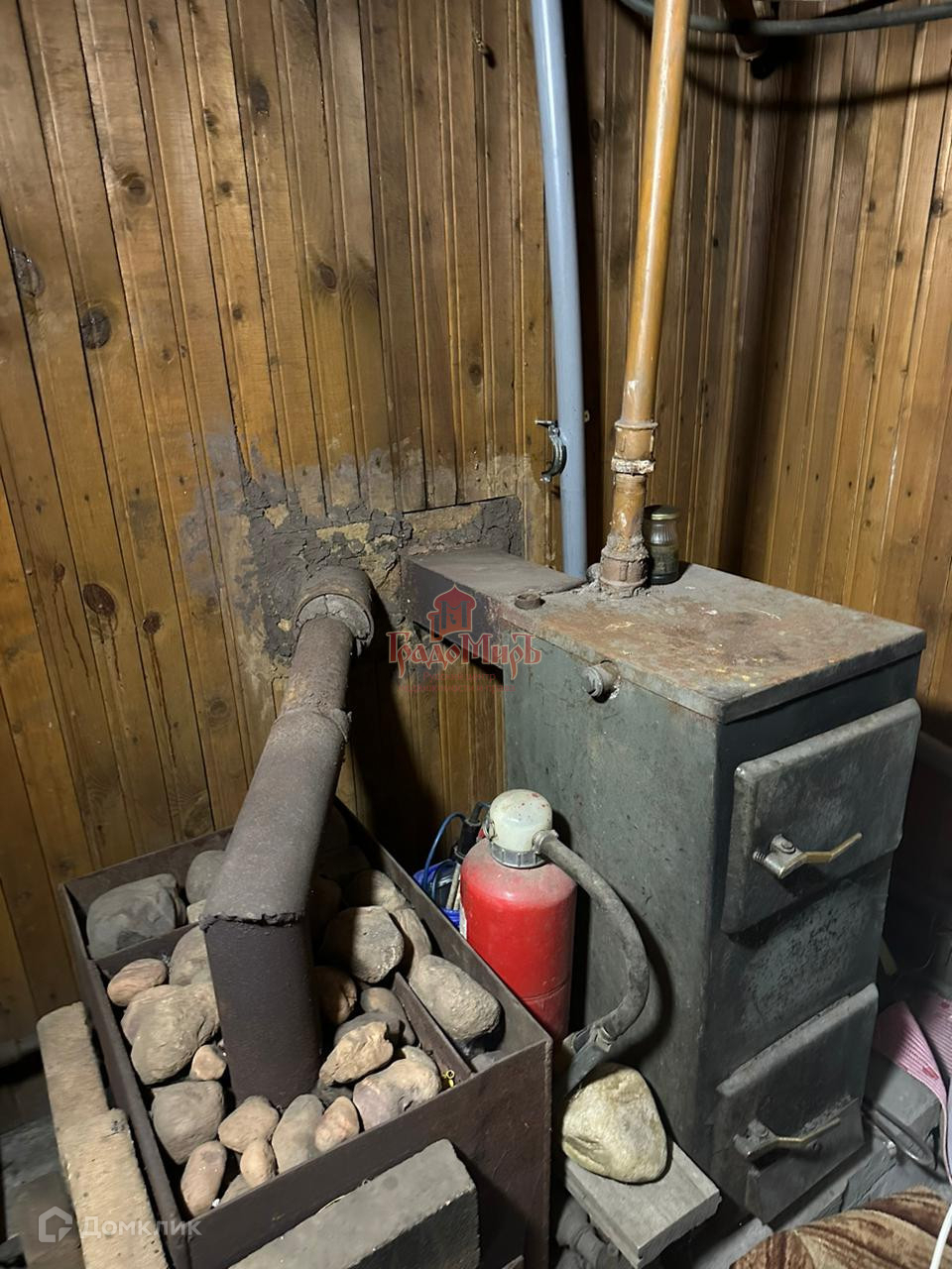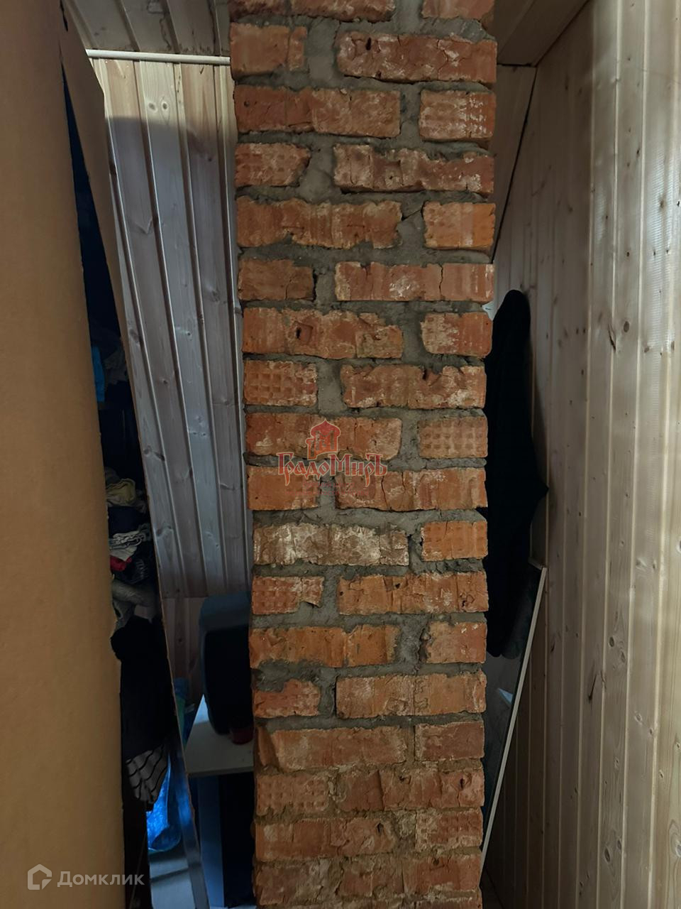 Отделка стен: шлакоблок, обложен кирпичом (толщина стен 40см), внутри: окрашенная вагонка. Крыша из профнастила.