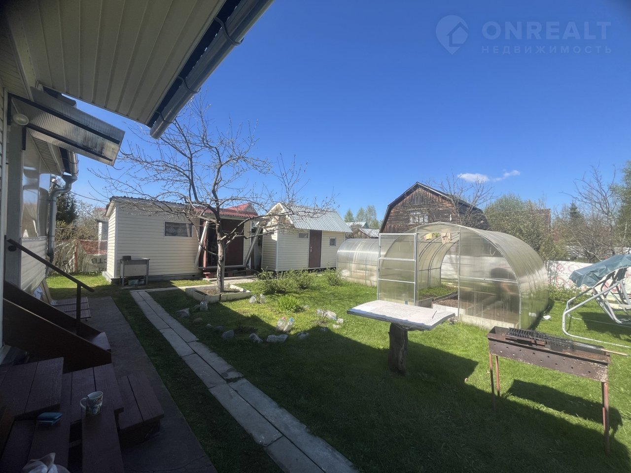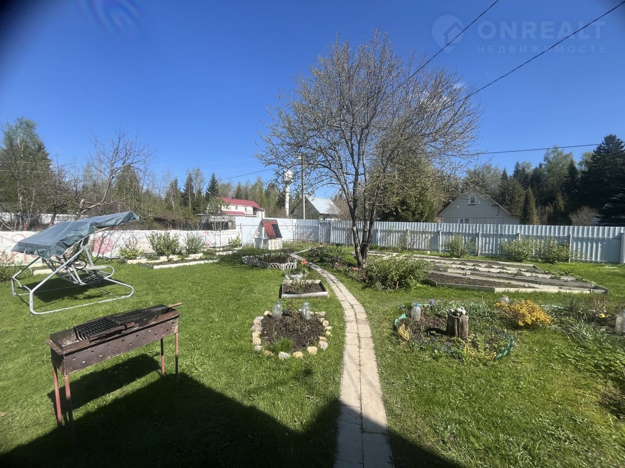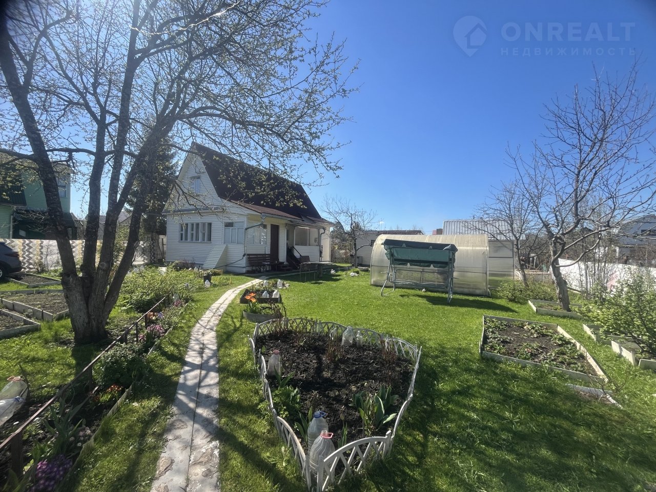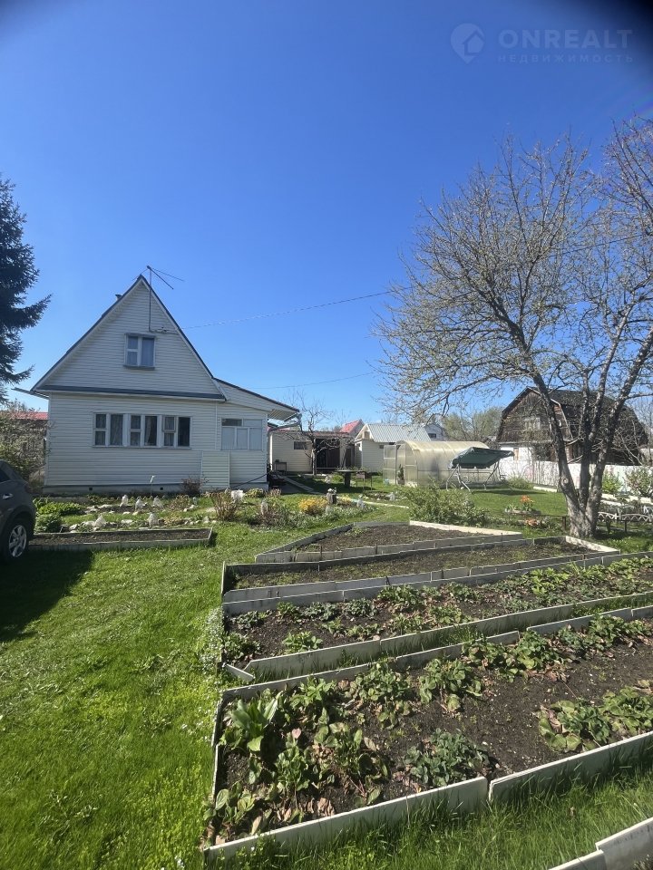 На участке: баня с летней душевой, хозблок, колодец, 2 теплицы, дорожки, оформленные грядки, яблони и плодовые кусты, декоративные цветы