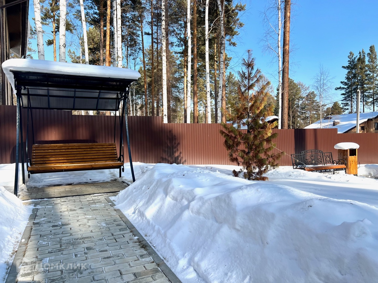 Выполнен ландшафтный дизайн, дорожки, газон, лавочки, беседка, терраса.