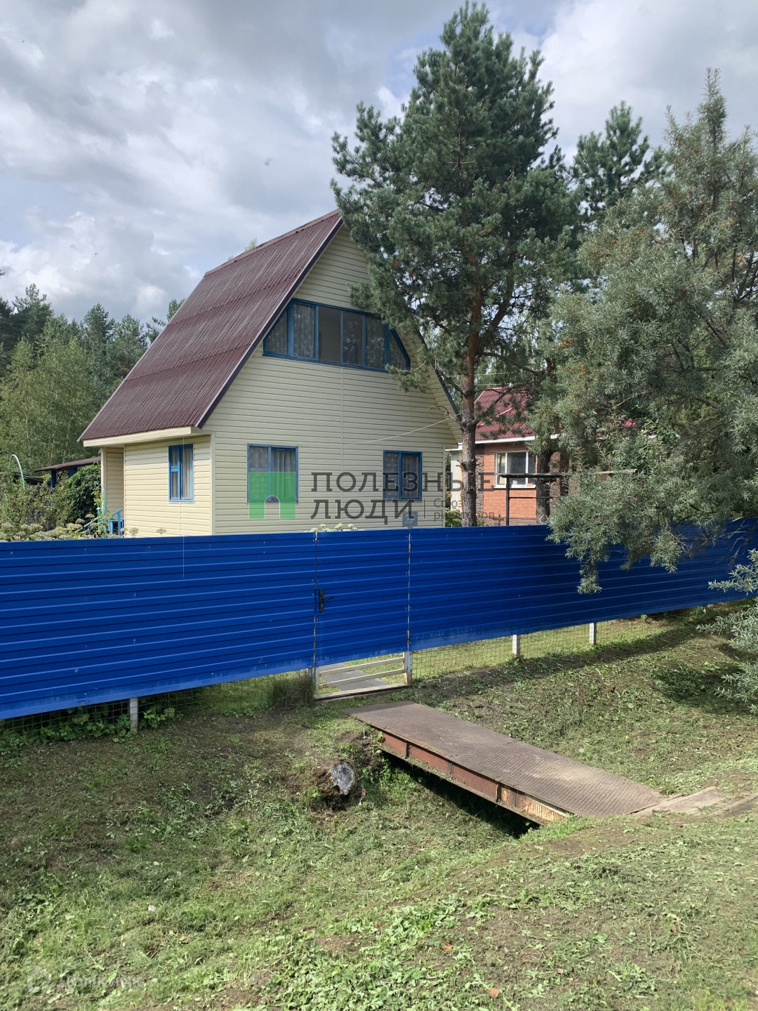 Участок огорожен аккуратным забором из профлиста, есть ворота (заезд) для машины и калитка.