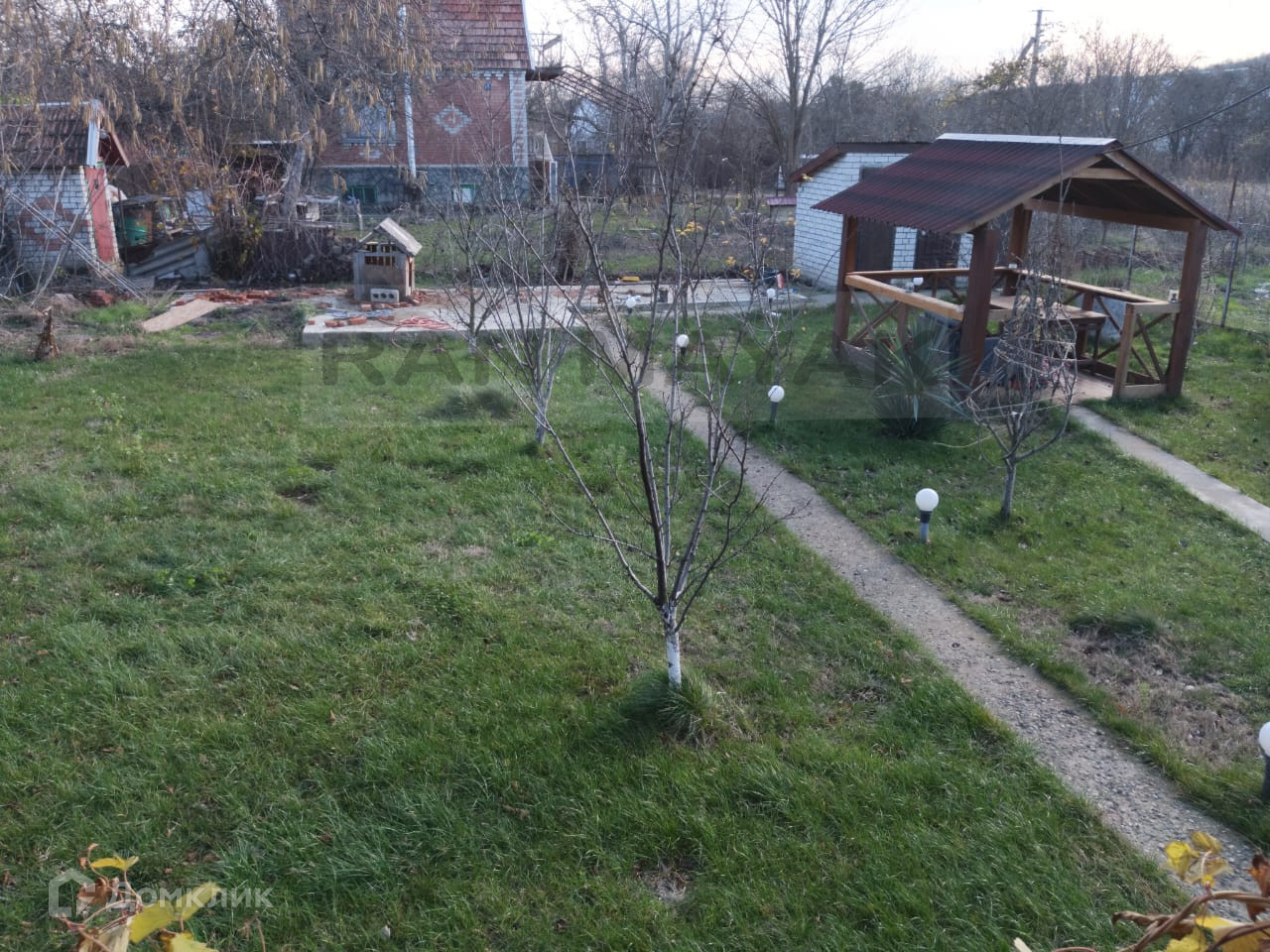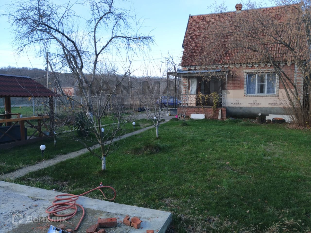 Дом площадь 72 кв.м. и остается много места на участке. Во дворе имеется беседка и залит фундамент под летнюю кухню. Также посажен красивый газон на выравненной земле.