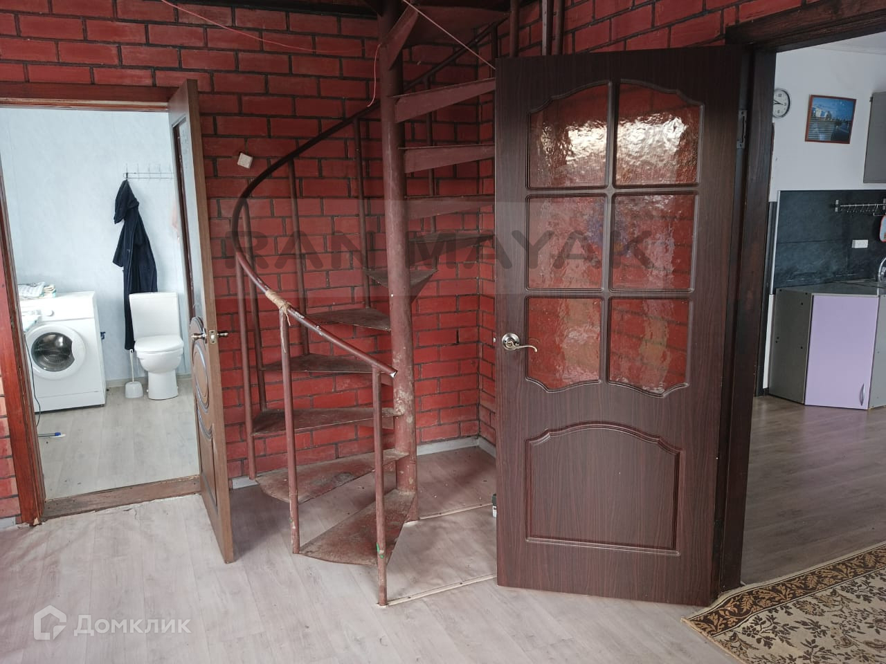 На первом этаже кухня, спальня, прихожая в которой стоит винтовая лестница на второй этаж и совмещенный санузел.