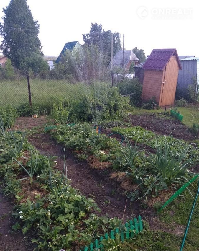 Плодоносные кустарники, смородина, малина, вишня, жимолость. Половина участка грядки, остальное газон. Спокойные, дружелюбные соседи.