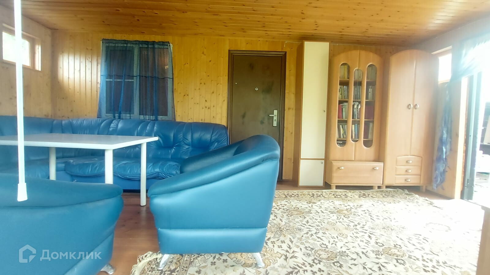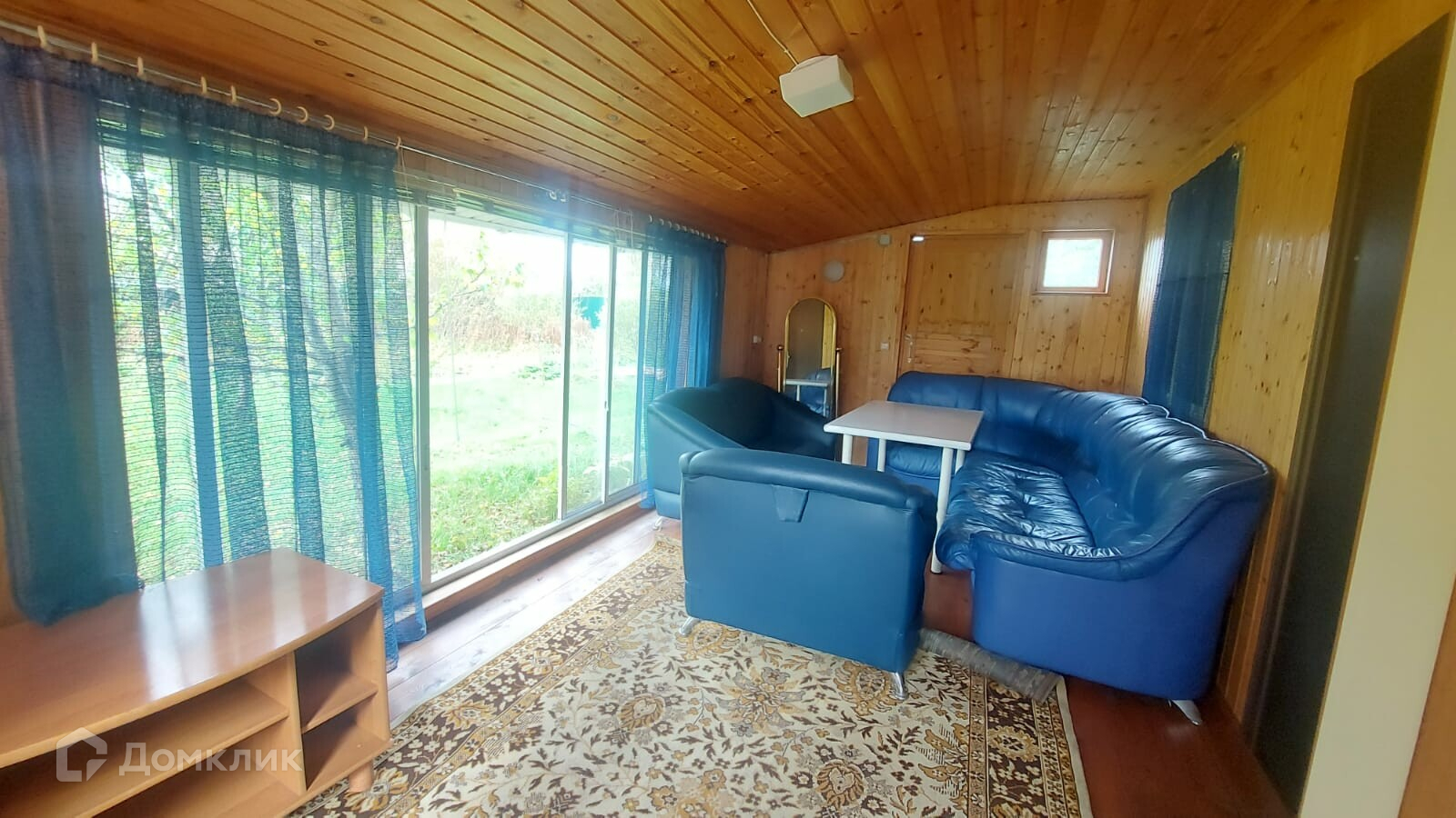 Веранда с панорамными окнами в сад. На веранде кожаная мебель. В дом три входа. Входная железная дверь, железная дверь из веранды в комнату. На окнах установлены стеклопакеты.