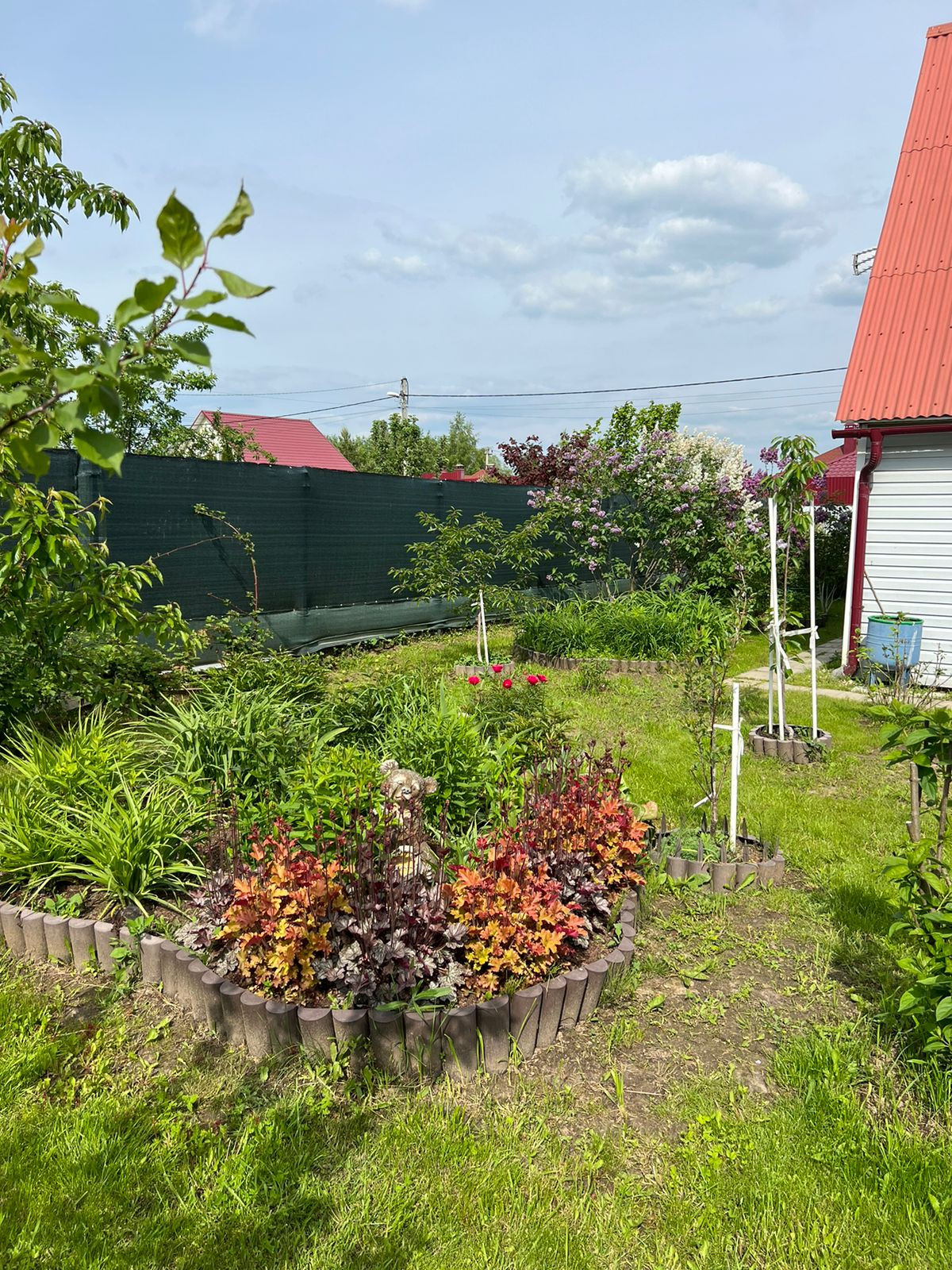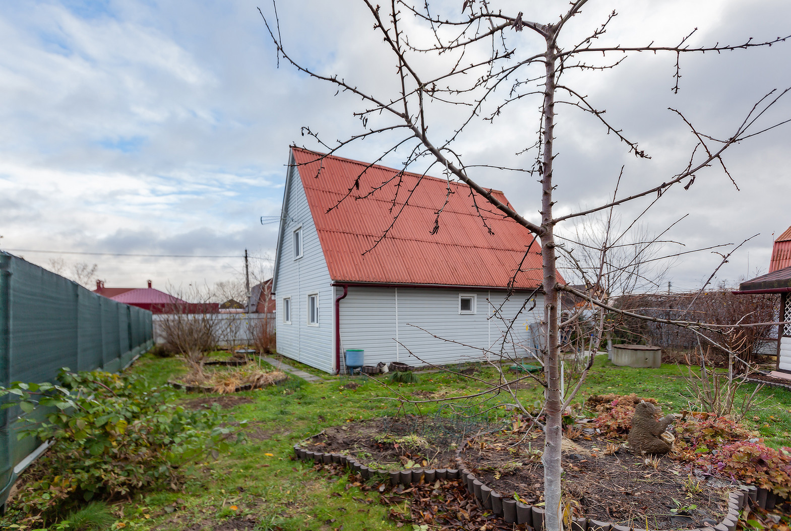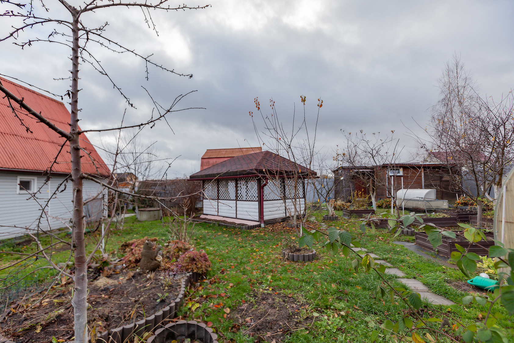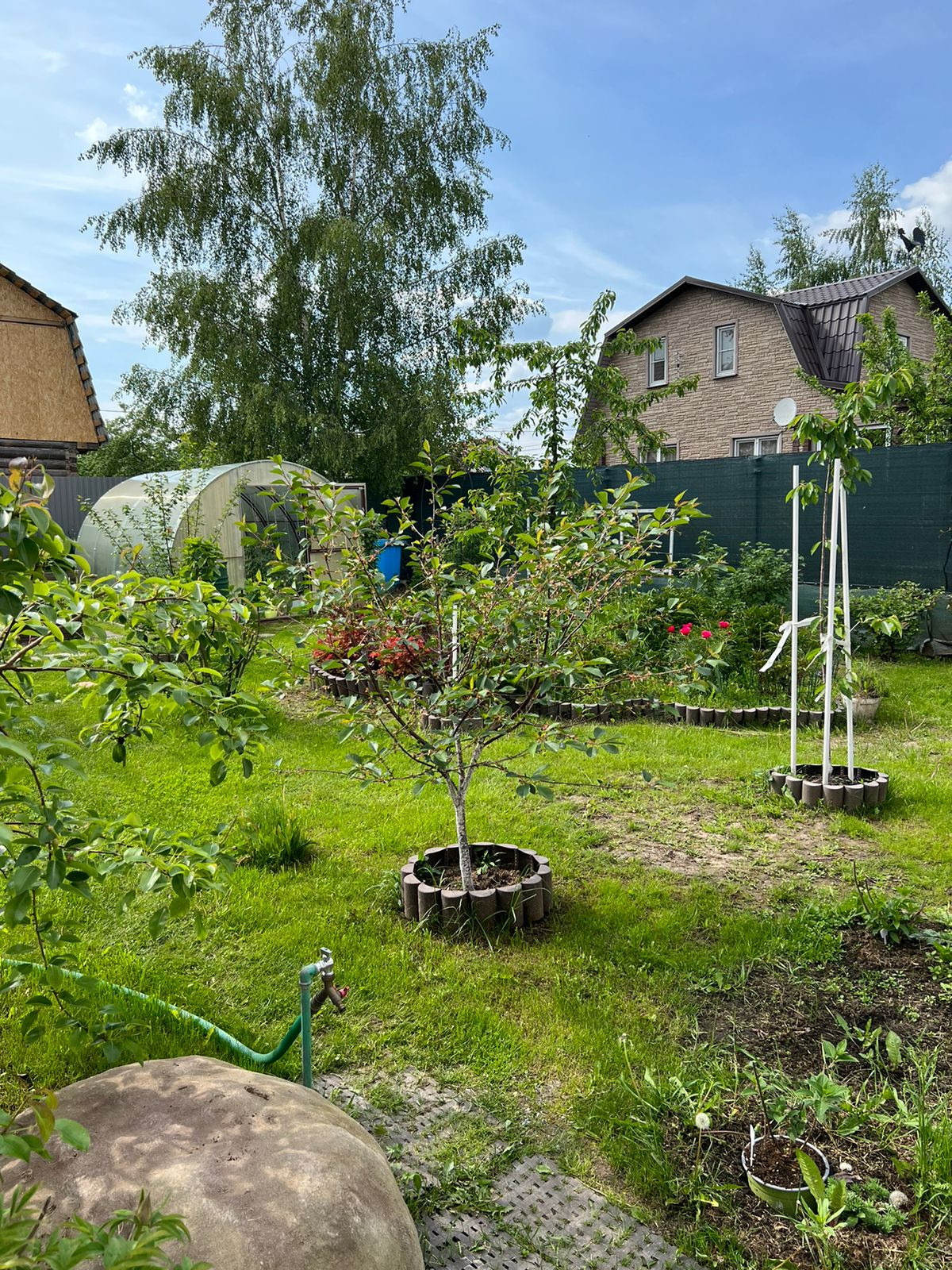 На участке обустроен парник, посажены плодовые деревья (яблони, груши, слива, персик) и кустарники (малина, ежевика). Есть вместительный хозблок, дровник и беседка.