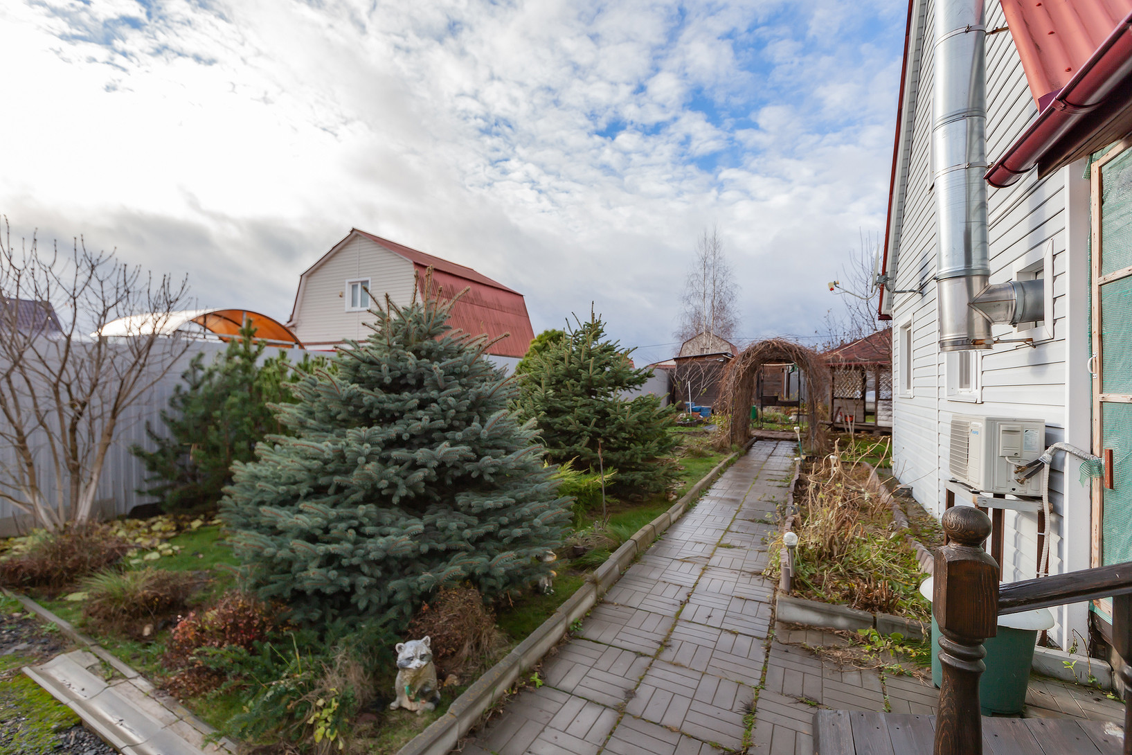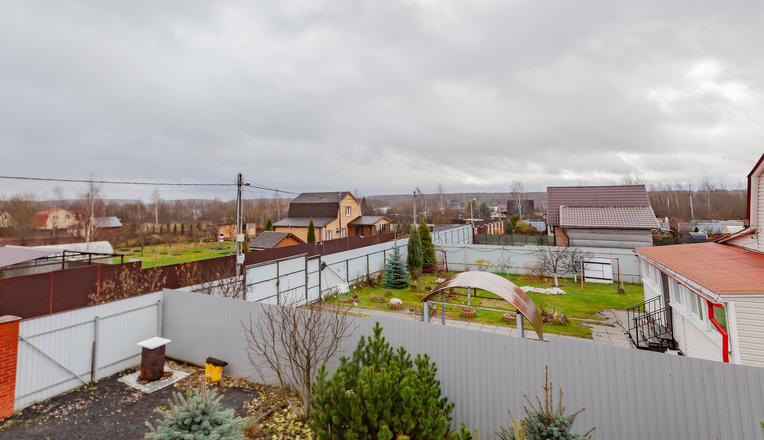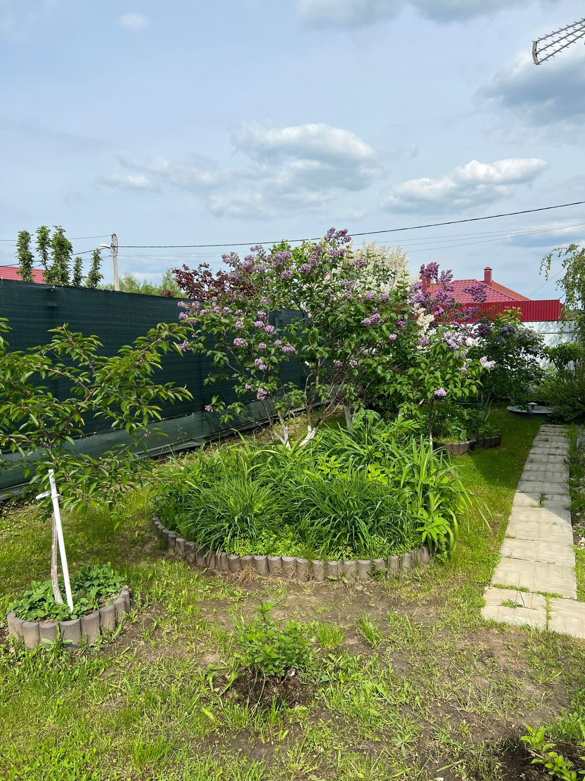 На участке обустроен парник, посажены плодовые деревья (яблони, груши, слива, персик) и кустарники (малина, ежевика). Есть вместительный хозблок, дровник и беседка.