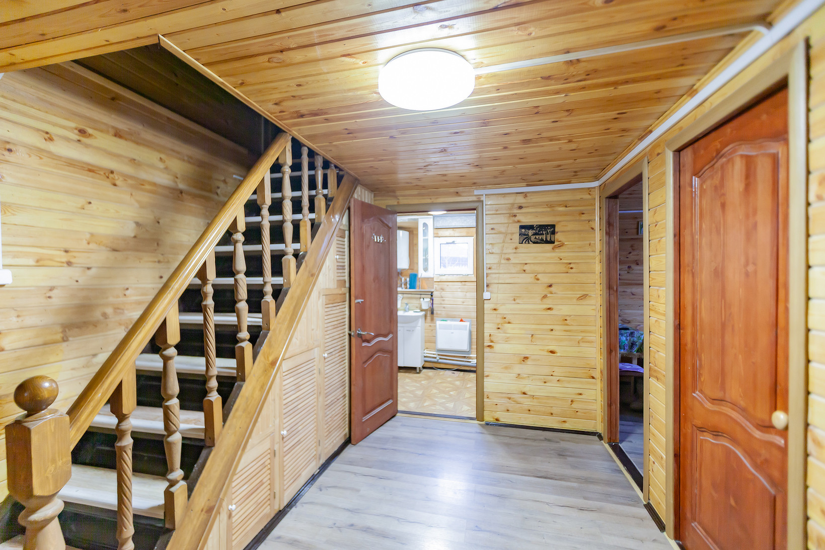 На первом этаже дома расположены: терраса 17 метров, коридор с лестницей на второй этаж 12 кв.м., кухня - гостиная 17 кв.м., санузел 4,8 кв.м. (с душевой, бойлером и стиральной машиной) и две изолированные комнаты по 8,5 метров.