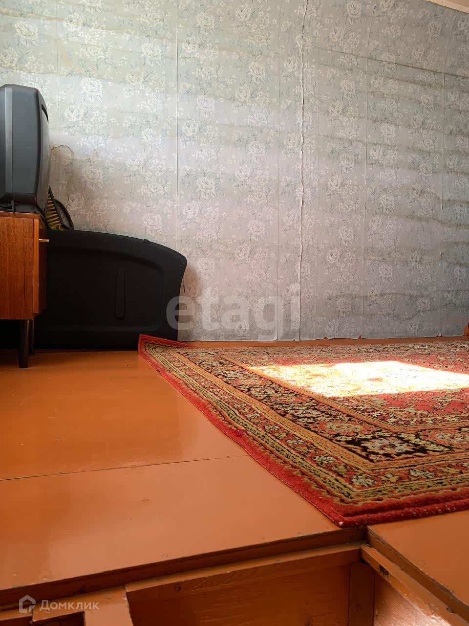 В доме, на первом этаже, расположена комната и кухня, прихожая с лестницей. Этаж отделан вагонкой, частично застелен линолеумом.