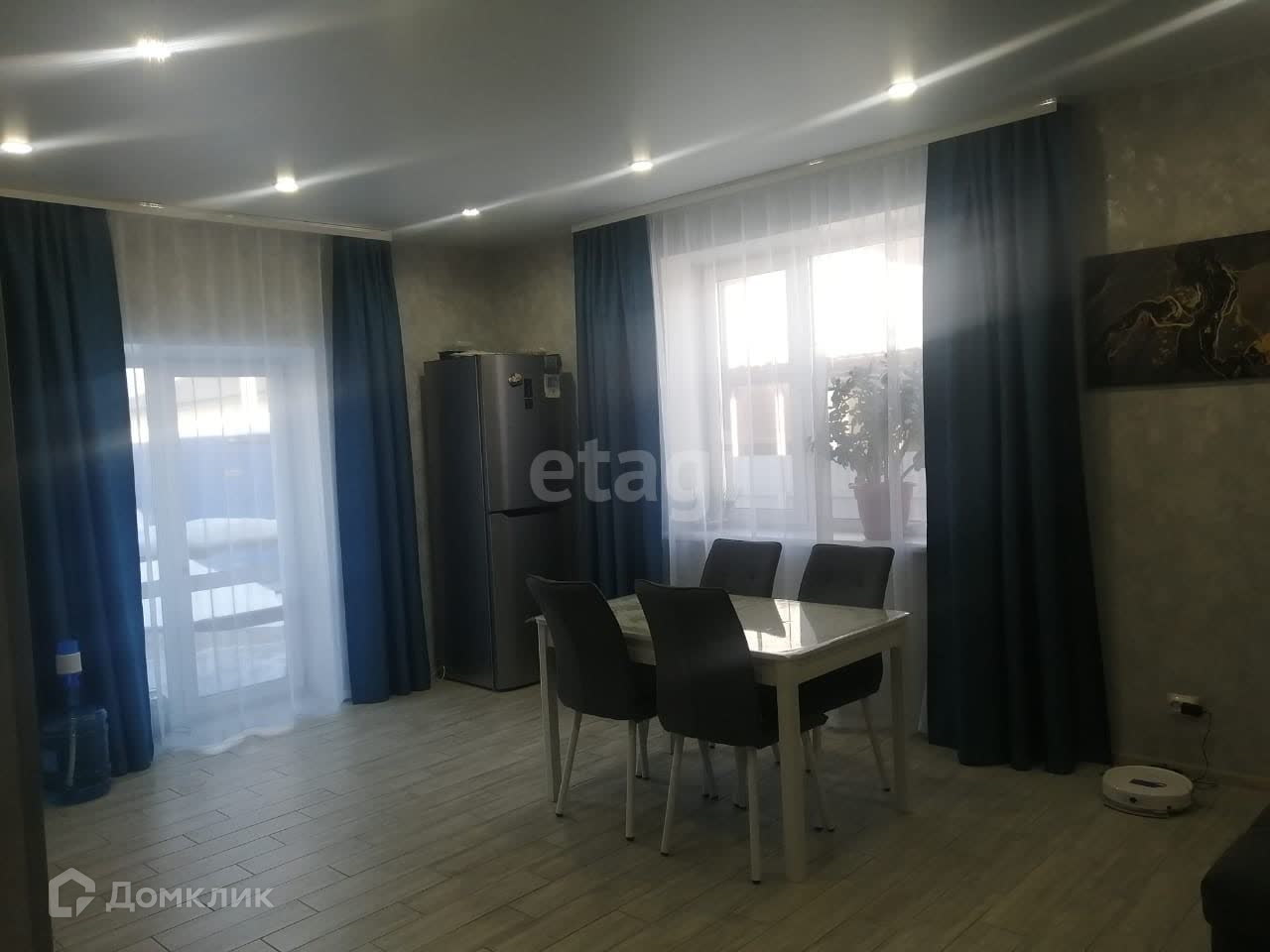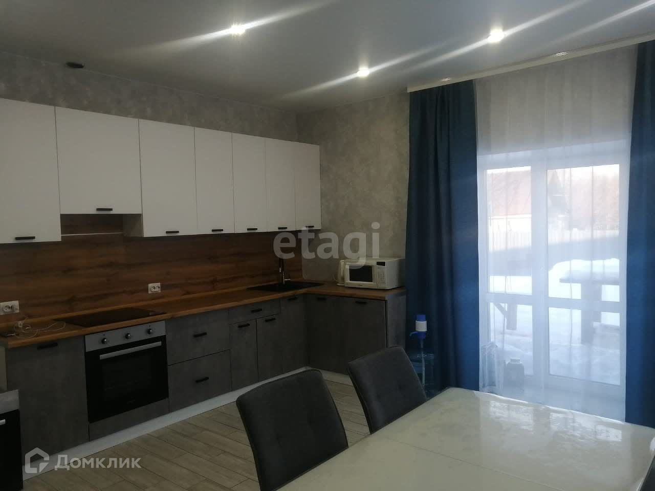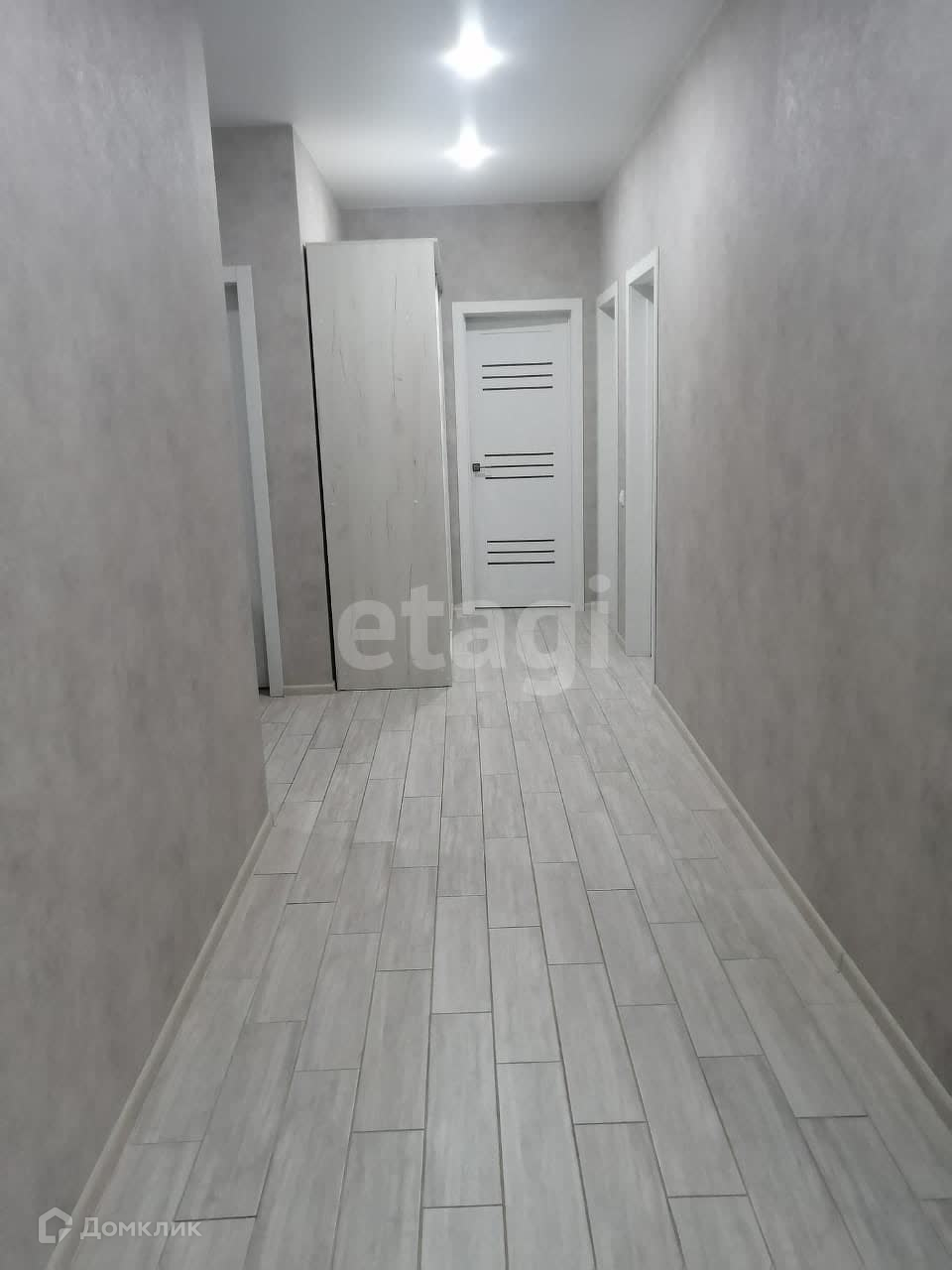 Современный ремонт-натяжные потолки с точечным освещением, на полу керамогранит и ламинат.Установлены межкомнатные двери.Сан узел совмещенный в кафеле.Кухонный гарнитур со встроенной техникой остается (дух шкаф, посудомоечная машина)