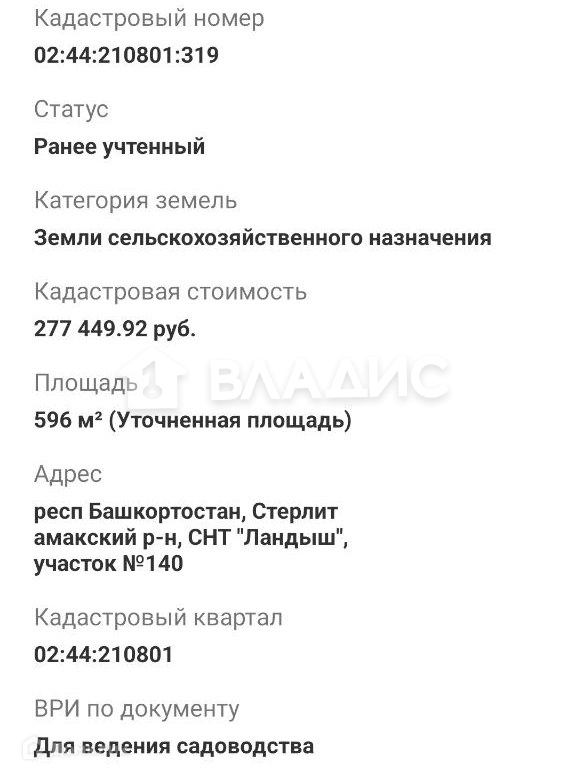 Продается земельный участок 5,96 соток в СНТ Ландыш. Статус участка - садоводство. Дорога грунт. Есть возможность подключения электричества.  Возможна ипотека под строительство. Звоните в любое время и записывайтесь на просмотр. Кадастровый номер: 02:44:210801:319   Ширина 19м, длина 31м.