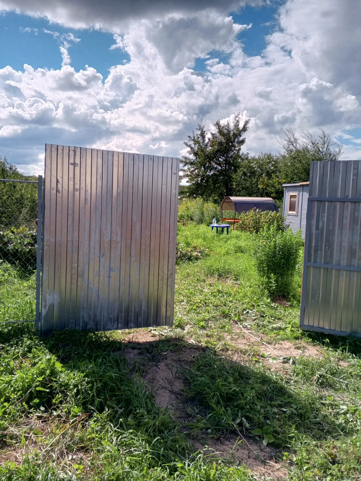 Выездные ворота 3 метра,на участке много плодовых деревьев,кустов и цветов.Некоторые соседи живут круглогодично.Торг