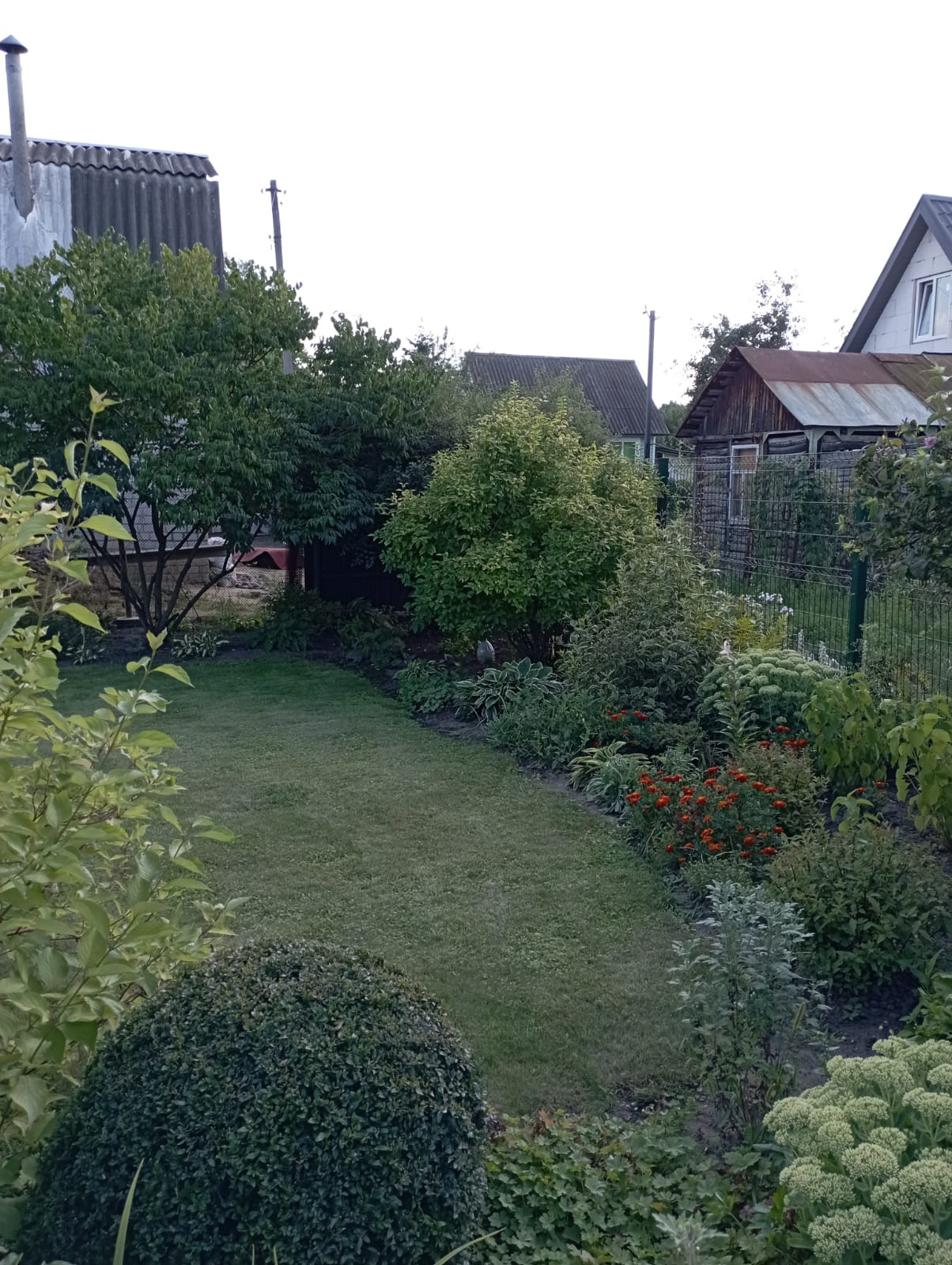 Ухоженный участок газон, декоративные кустарники и деревья(спирея японская, барбарис, гортензии, хвойные туи, можжевельники, ива хакуро), плодовые насаждения(слива, яблони и др), цветы(многлетние хосты, пионы, розы, лилейники и другие).