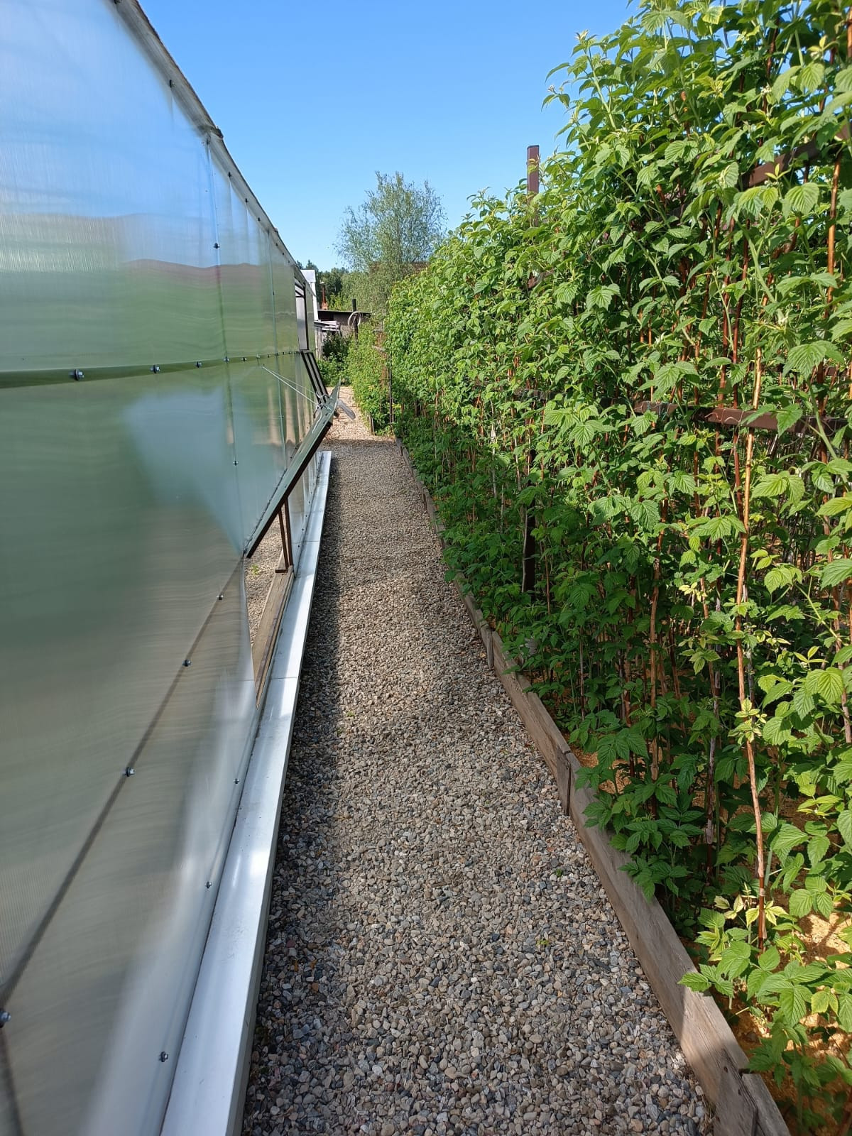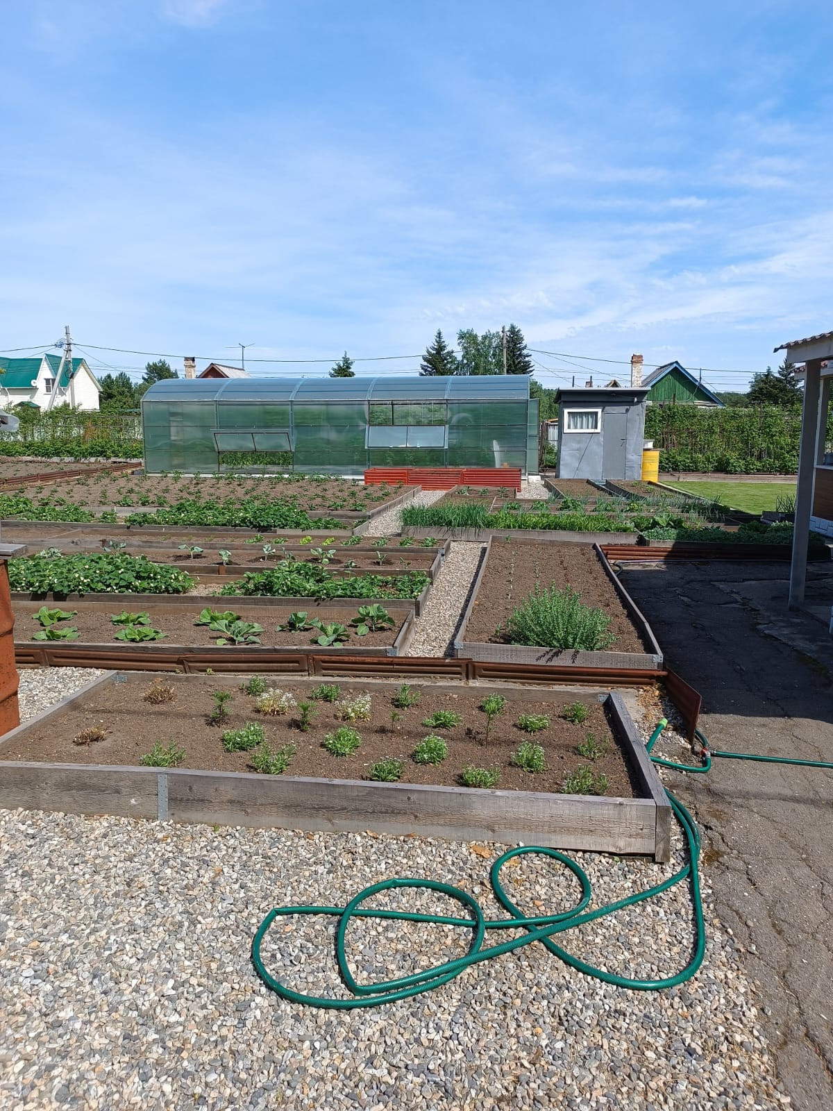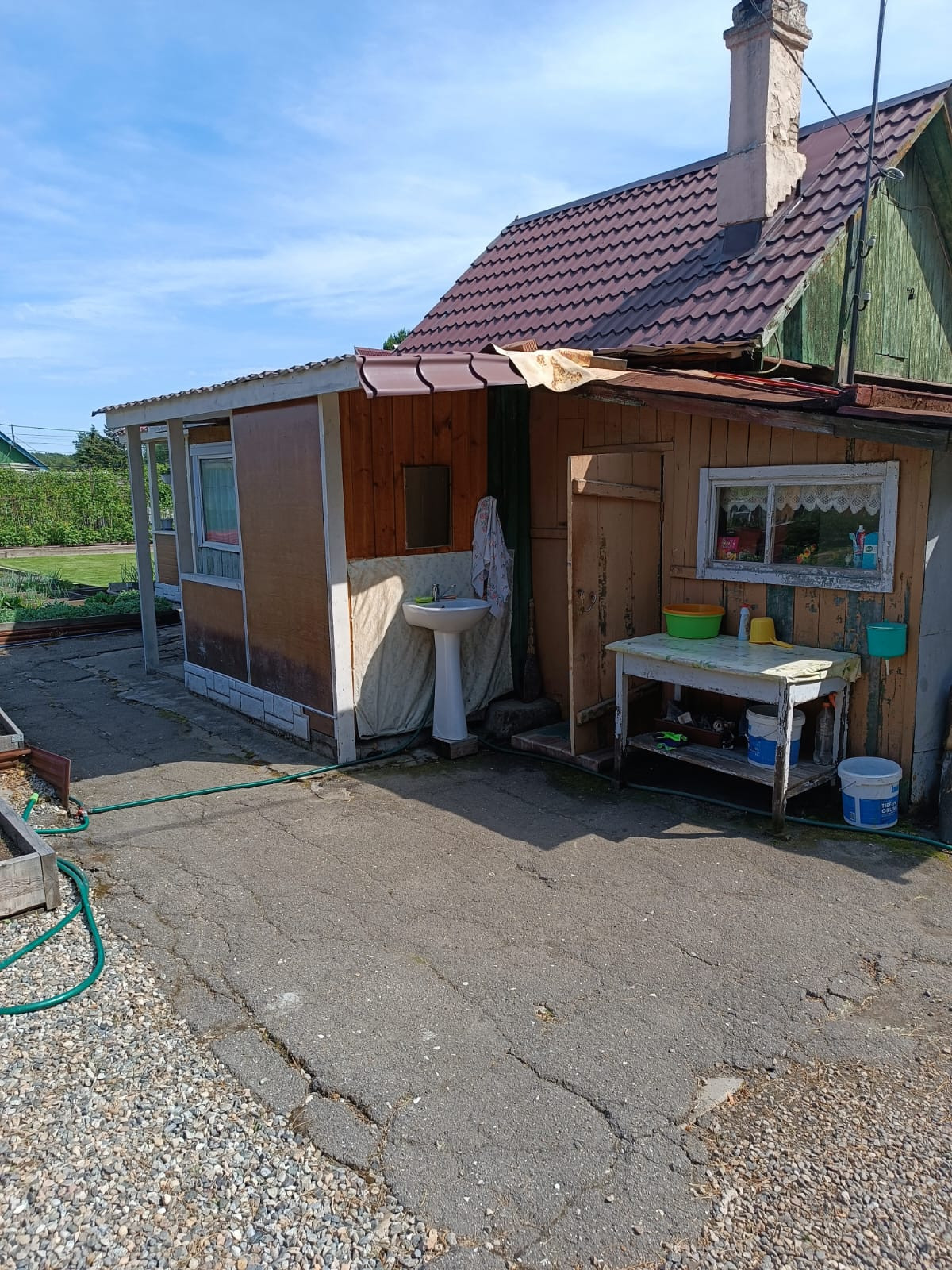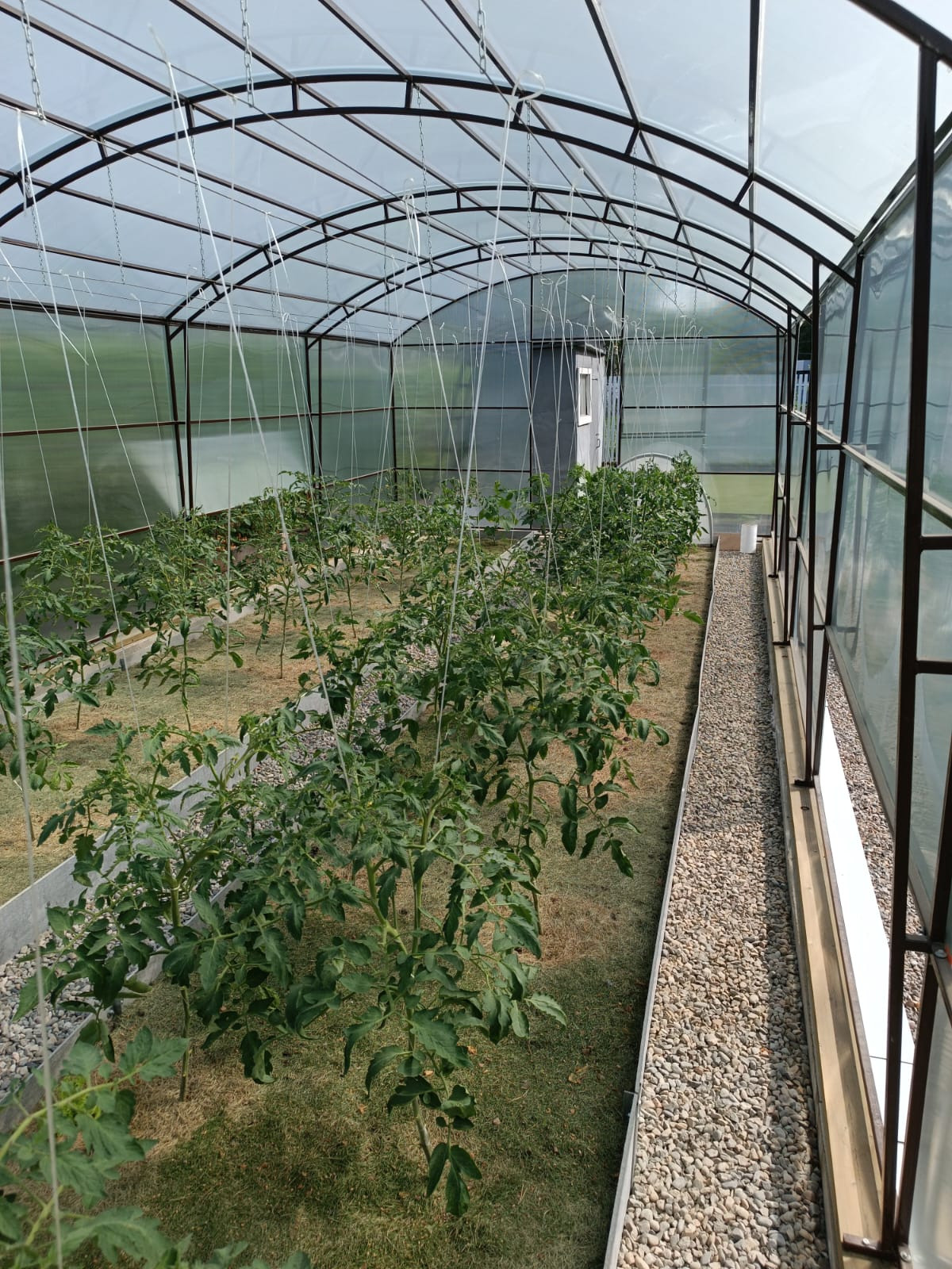 Добротная, новая теплица на фундаменте размером 4х10 установлена в 2022 году, посажены помидоры, огурцы. Уточнение, бани нет. Есть летний душ.
