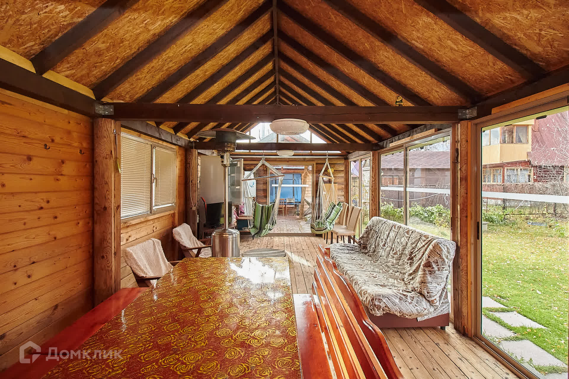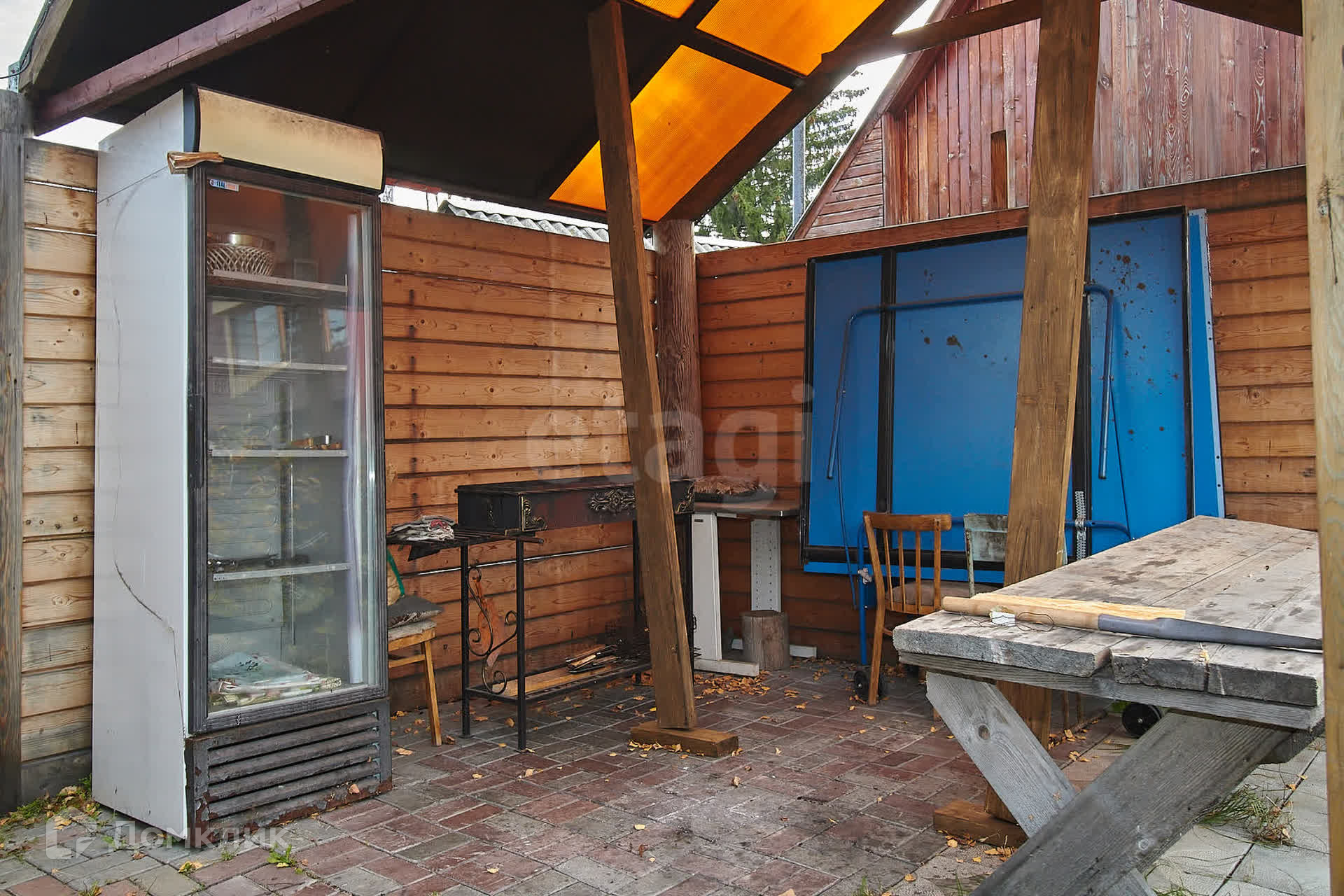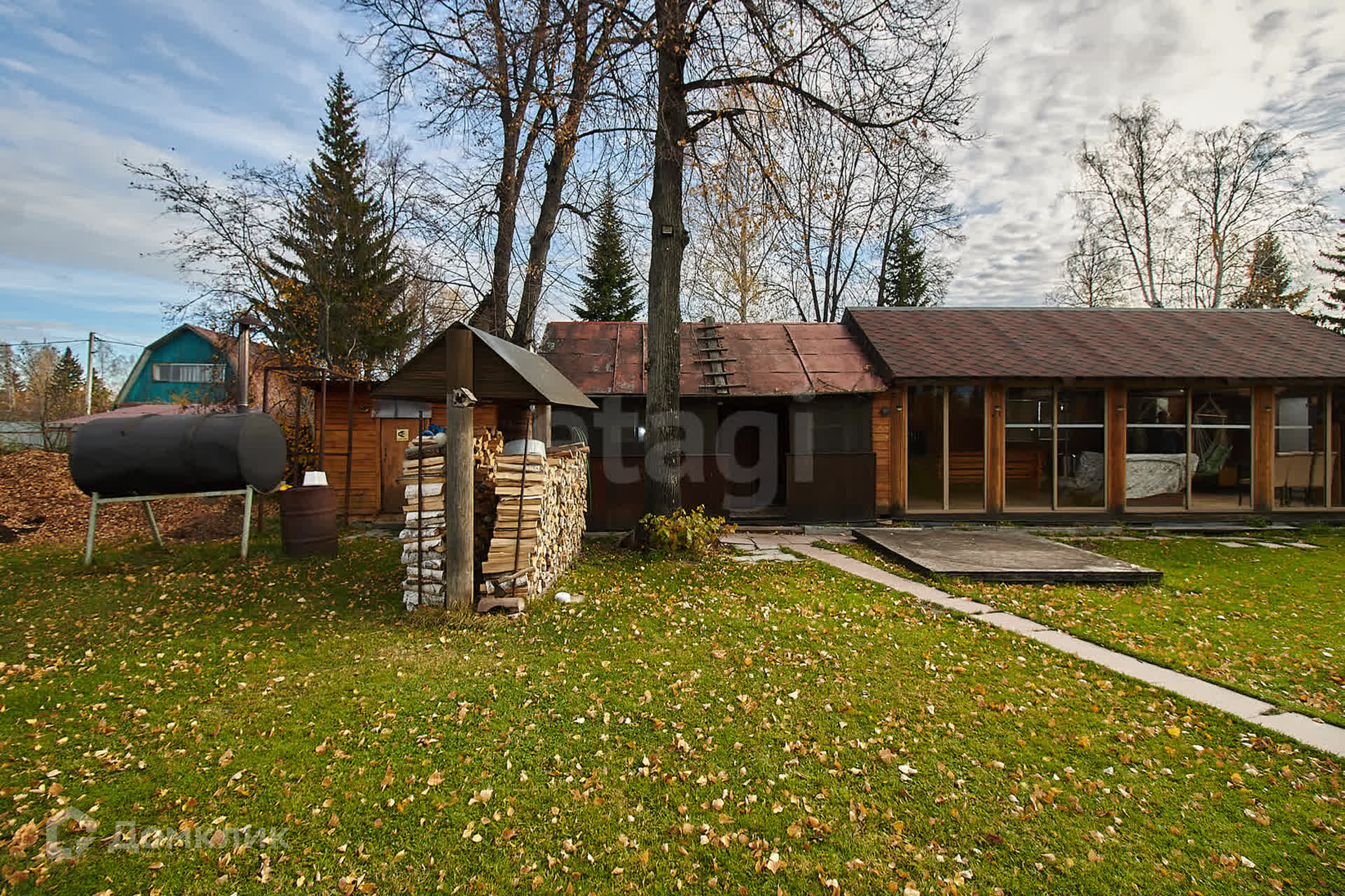 Дополнительные постройки включают в себя уютную баню с выходом на веранду, оформленную витражным остеклением. На веранде расположены зоны отдыха, кухни и мангала, что делает это место идеальным для дружеских встреч и семейных праздников. Также на участке имеется старый домик, который можно использовать как сарай или для хранения.
