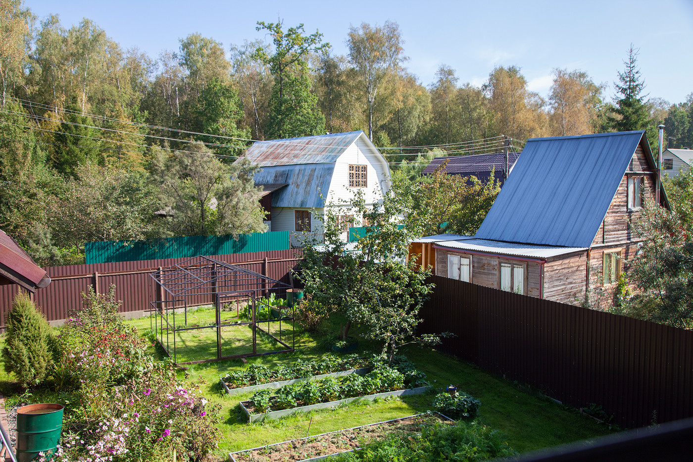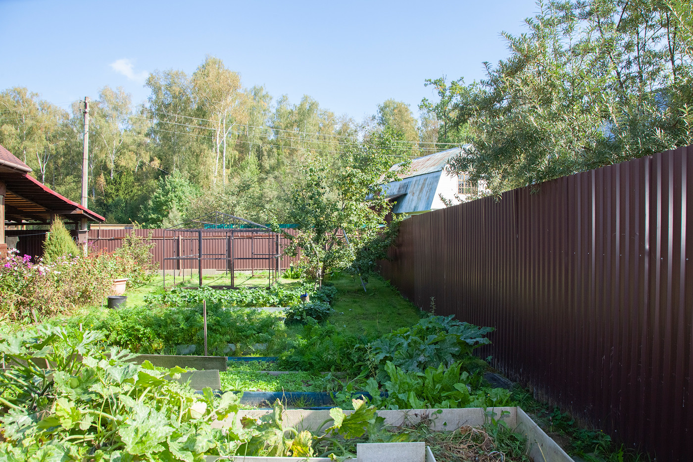 На участке за домом разработаны грядки, а также плодово-ягодные деревья и кустарники.