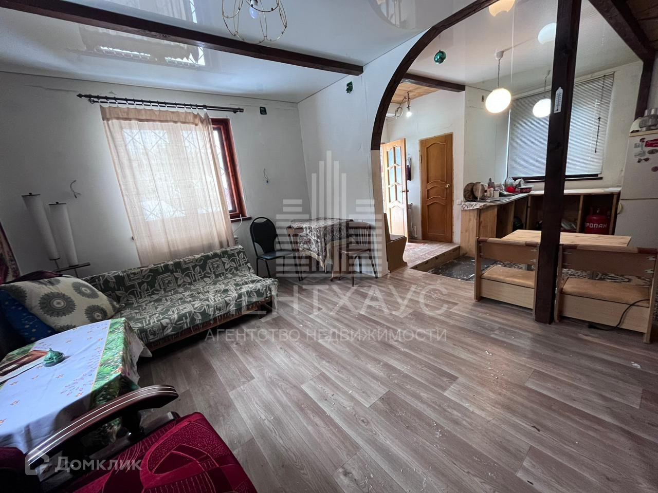 1 этаж: Кухня- гостиная в виде студии. В гостиной натяжной потолок, на полу линолеум.