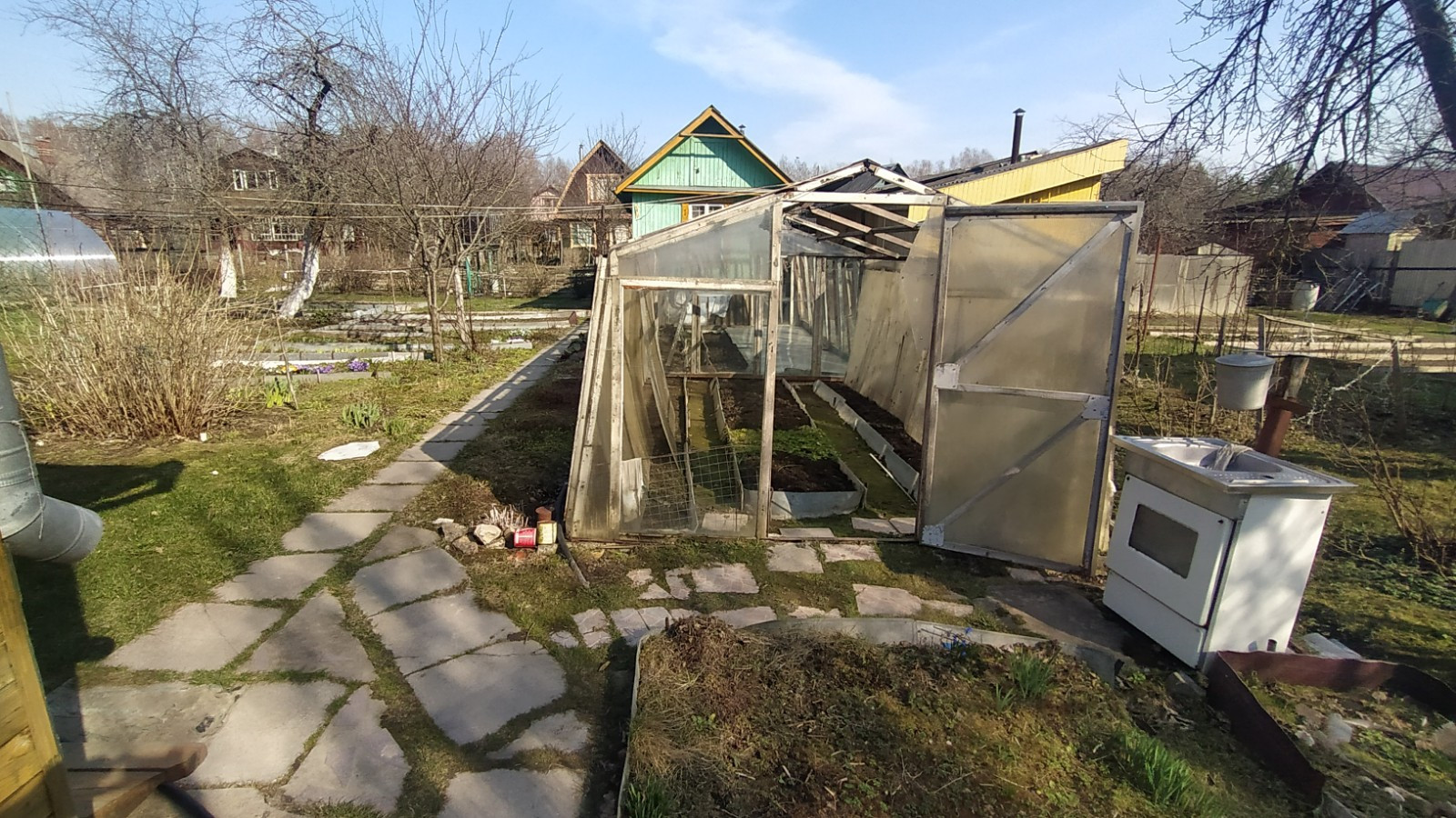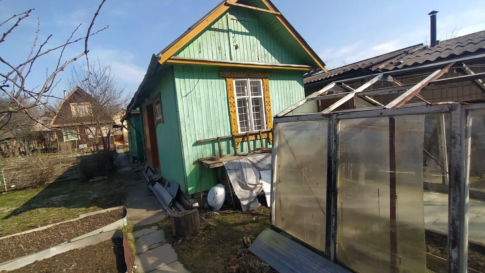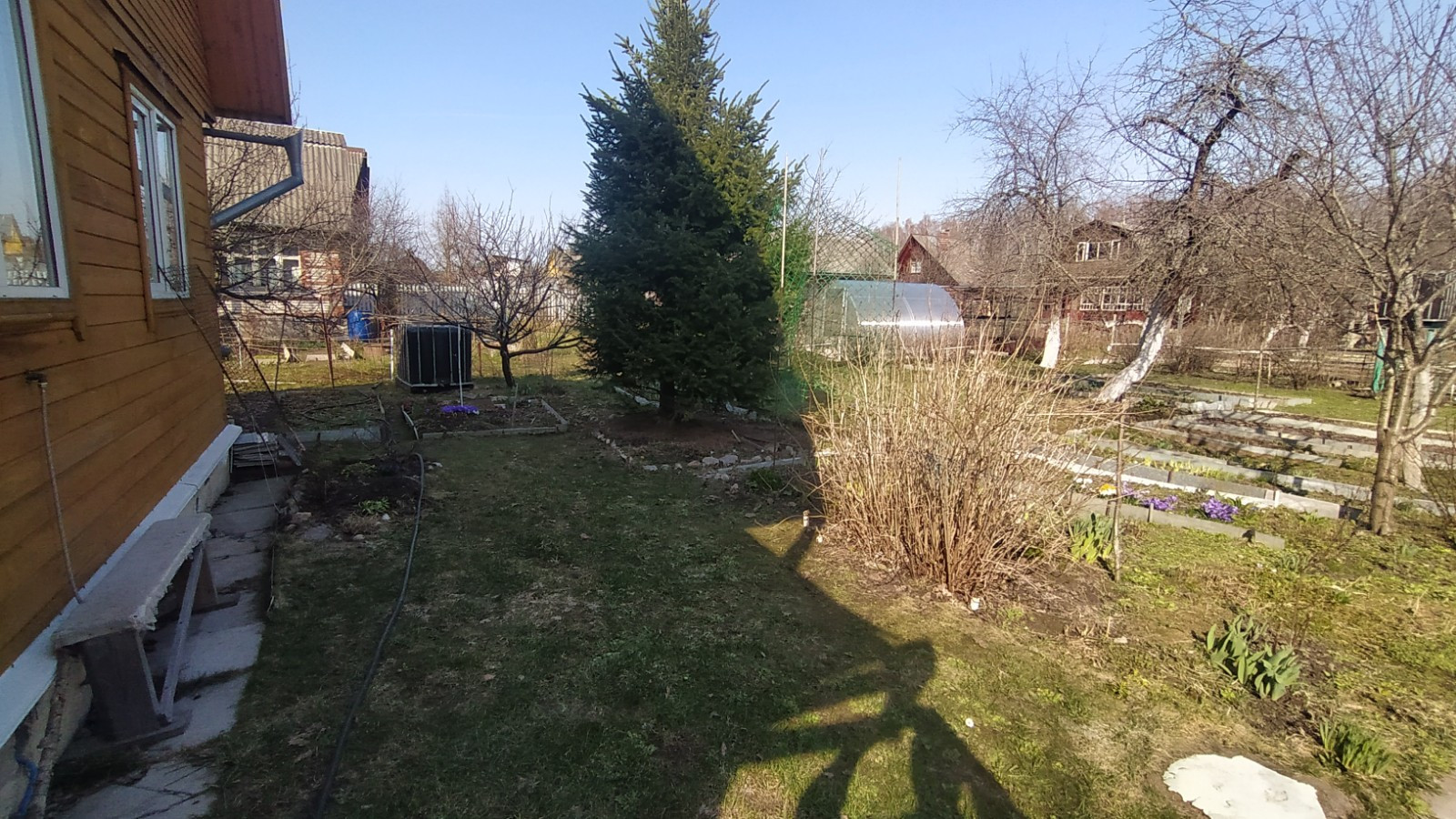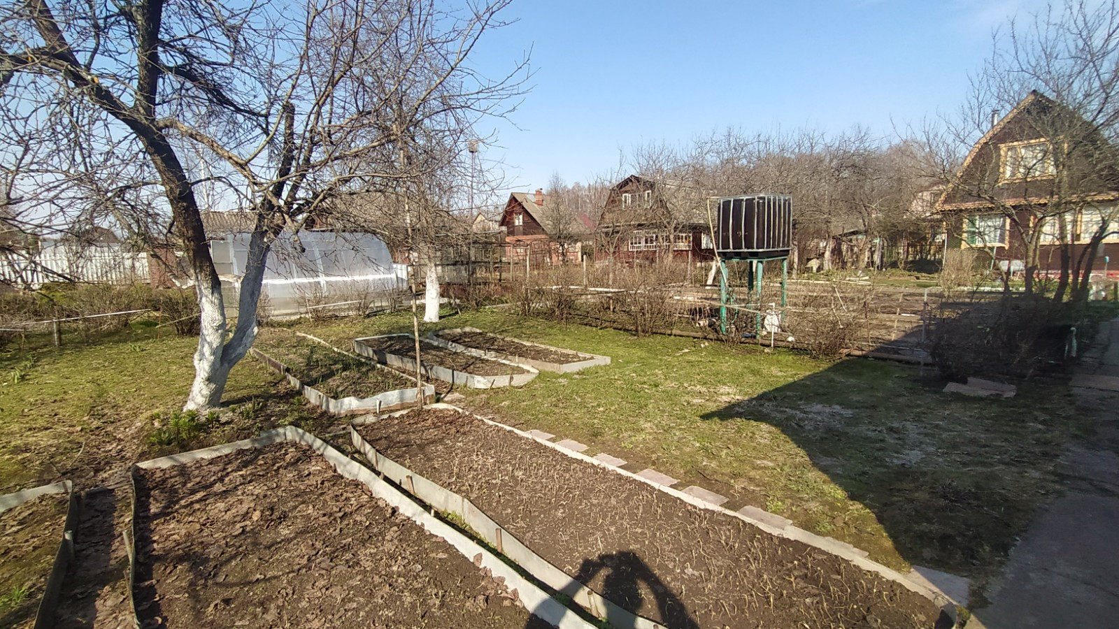 Участок: Земли населенных пунктов. Участок ровный, прямоугольной формы, На участке растут яблони, слива, вишня, цветы. Есть большая теплица.