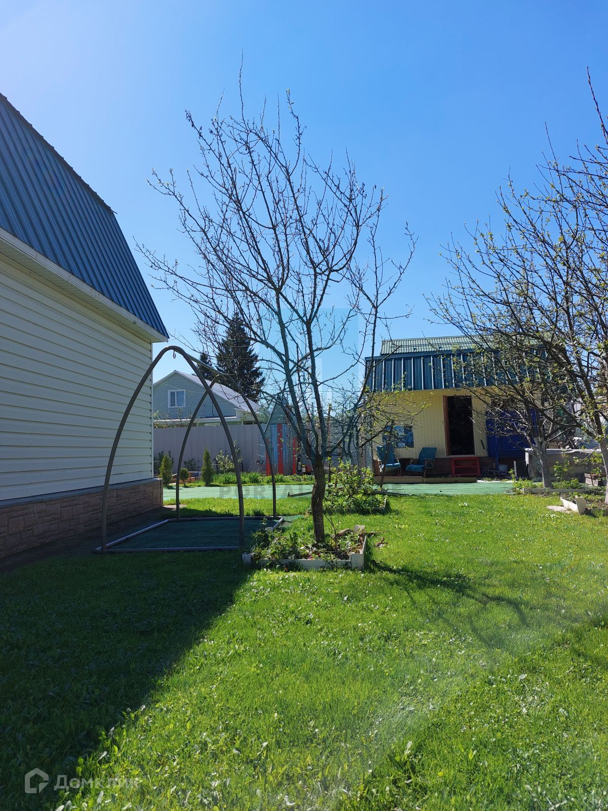 Участок правильной формы 30х30 м (состоит из двух участков 5,79 + 3 сотки), огорожен забором из профнастила с калиткой и воротами, без уклонов с отличным газоном.