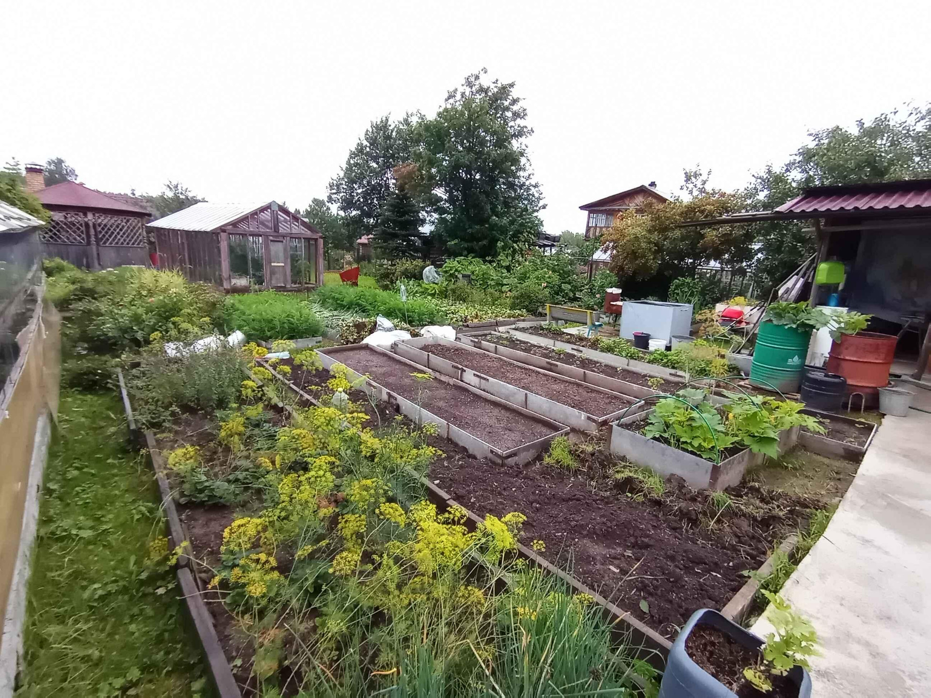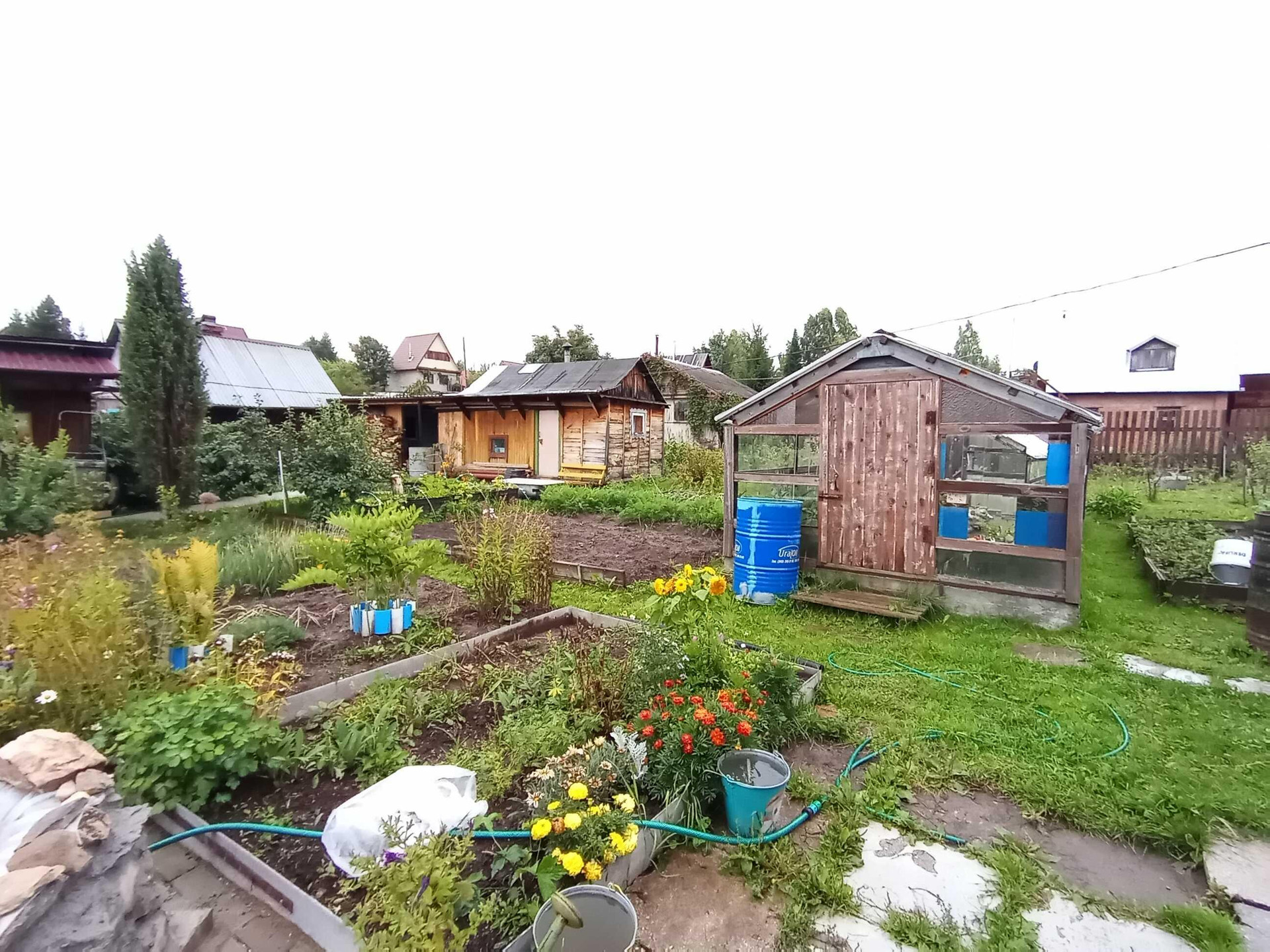 На участке имеется  большой плодовый сад с разнообразными фруктовыми деревьями, кустами и ягодами (яблони, груши, вишня, облепиха, смородина, жимолость, грядки с клубникой, малина). Все грядки отделаны плоским шифером. 2 теплицы на фундаменте, 1 теплица каркасная из поликарбоната.