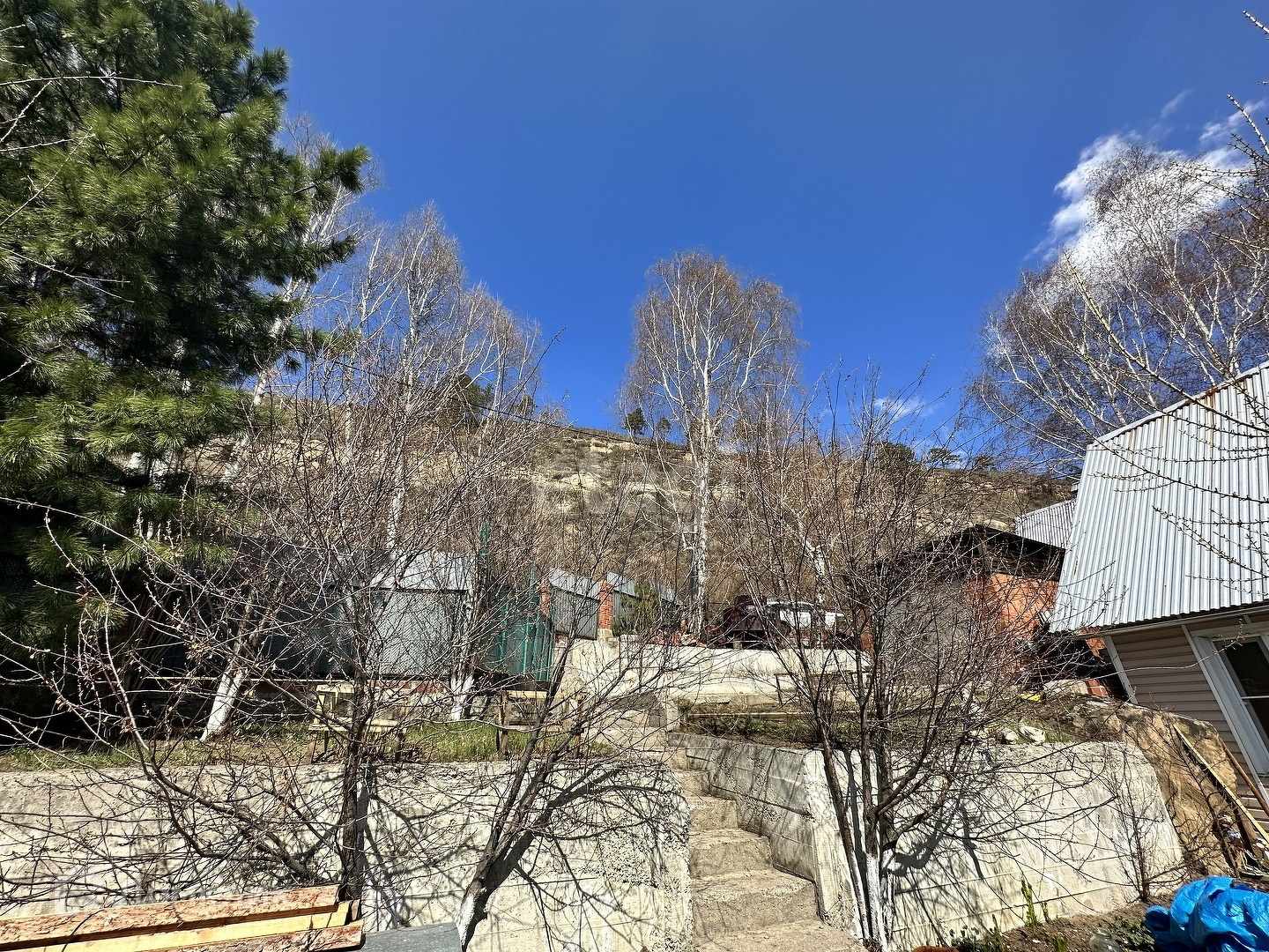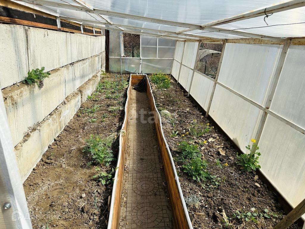 Подпорные стены, дорожки, лестницы, цветники выполнены из бетона. На территории участка имеется теплица, сформированы аккуратные грядки.