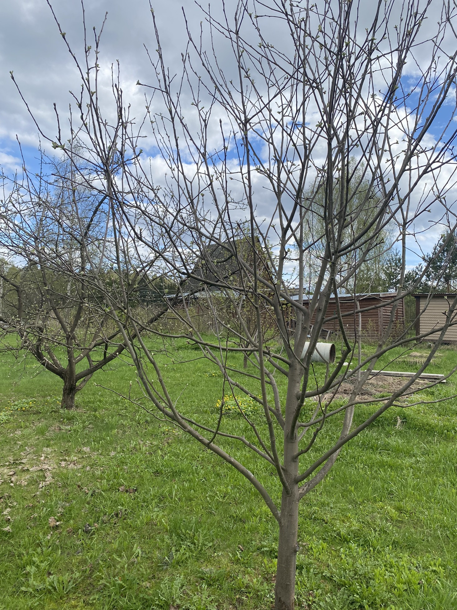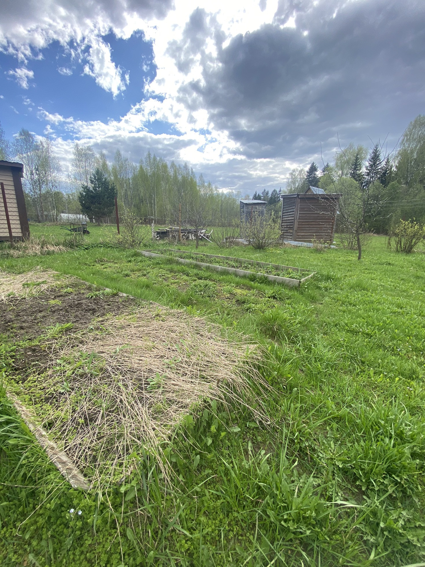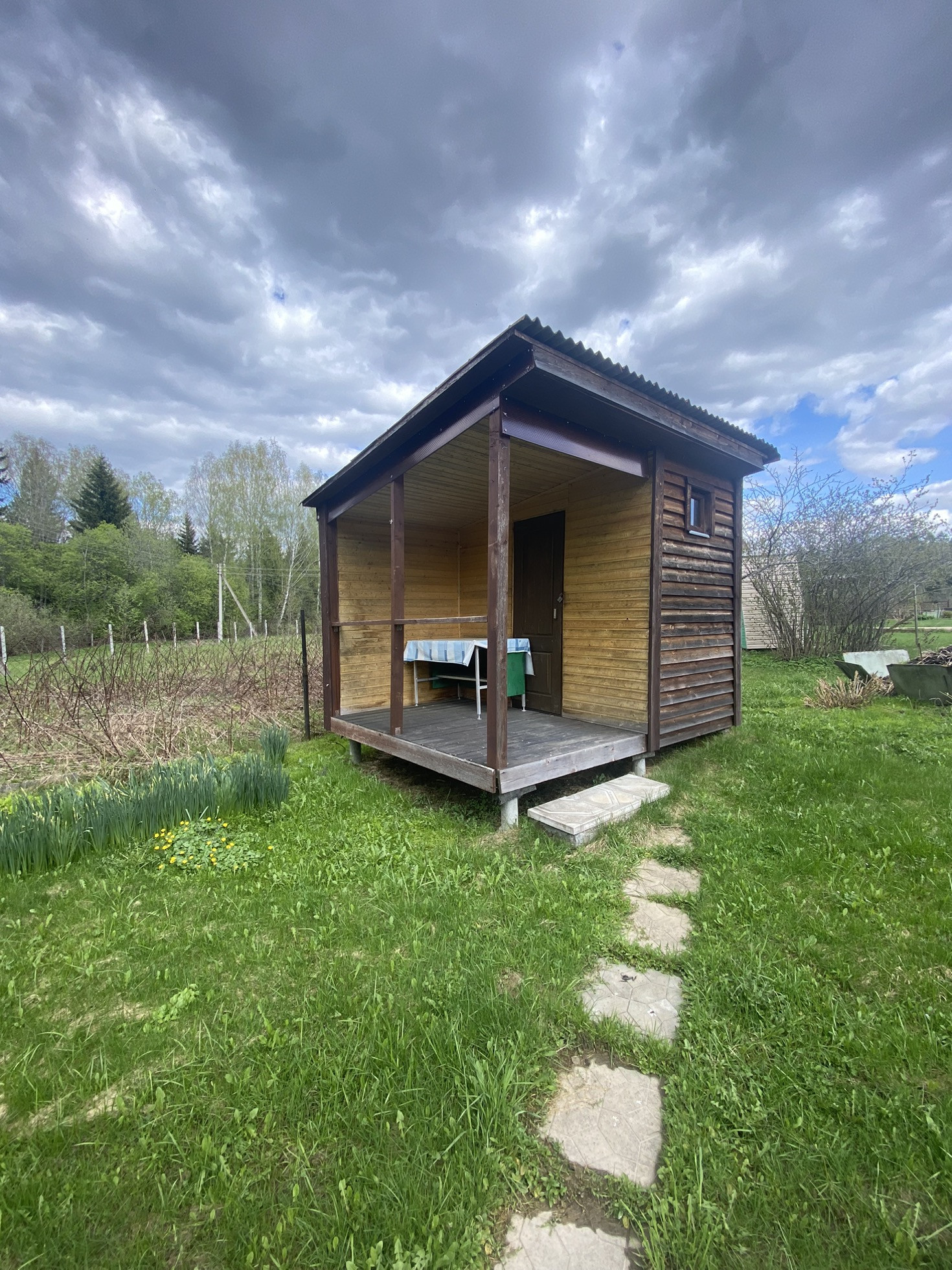 Бытовка для садового инвентаря. Плодовые насаждения: малина, смородина, сливы, яблони.