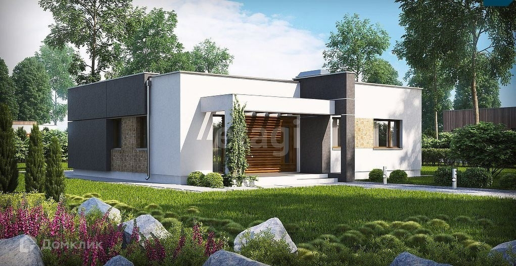 Элегантный, уютный, практичный и экономичный дом в стиле хай-тек небольшой по размеру. Изысканный стиль дома подчёркивает не только кубическая форма в основе, но и внешняя отделка, для которой используются белый и серый цвет, а так же элементы каменной кладки тёплого песочного оттенка. Большая гостиная рассчитана как на приёмы для гостей, так и на тихие семейные вечера, согретые теплом камина. Гостиная имеет выход на большую крытую террасу. В этом проекте гостиная соединена со столовой, а столовая, в свою очередь, имеет собственный выход на боковую террасу, а так же из неё можно попасть в уютную кухню. В левой части дома расположены две спальни, одна из которых имеет собственный выход на террасу. Спальни расположены так, чтобы каждый человек чувствовал себя уединенно и независимо. Так же в левой части дома размещён большая ванная комната. Главные достоинства этого дома – простота, минимализм, рациональное использование каждого квадратного метра и возможность экспериментировать с внутренними перегородками.