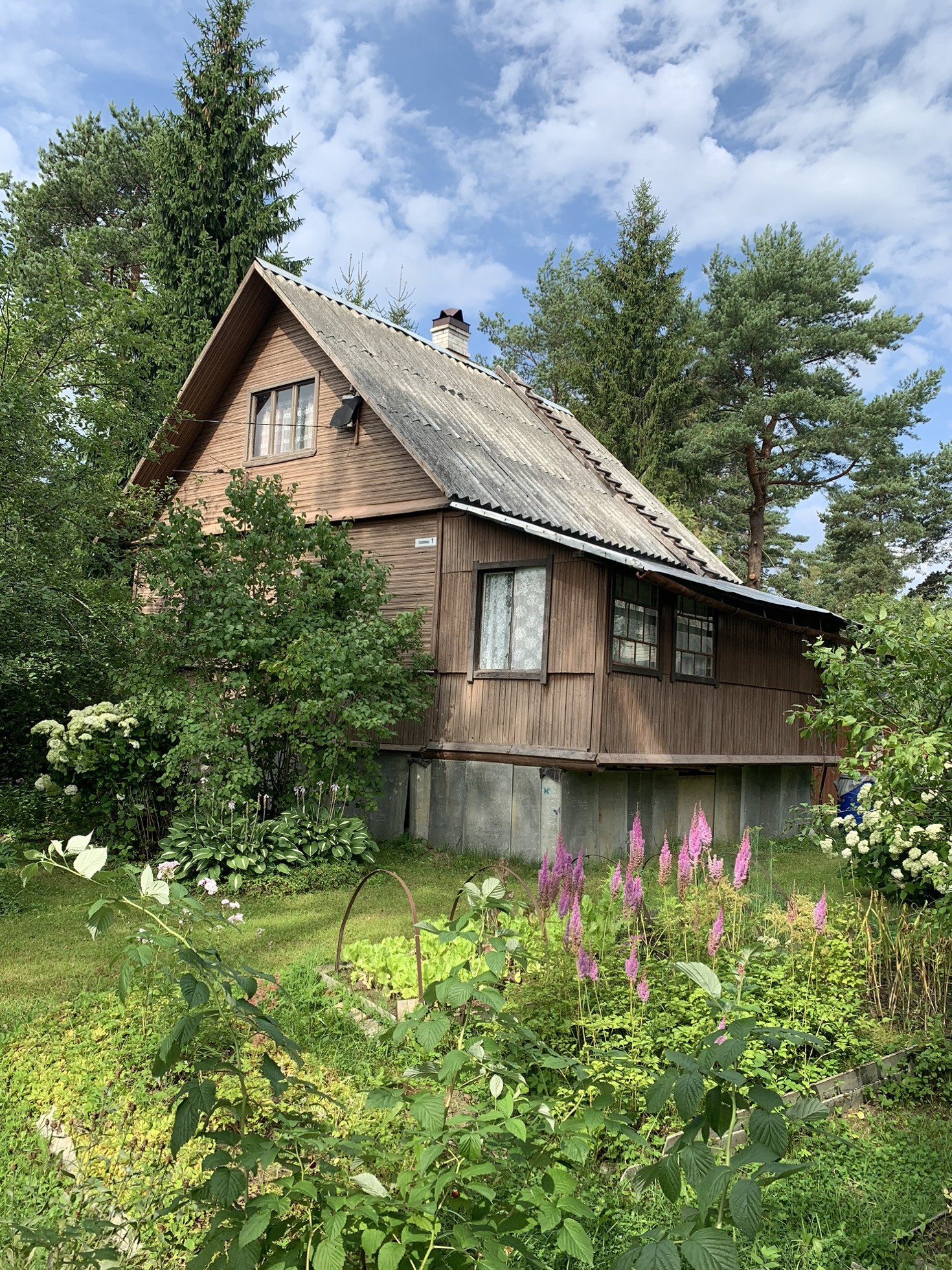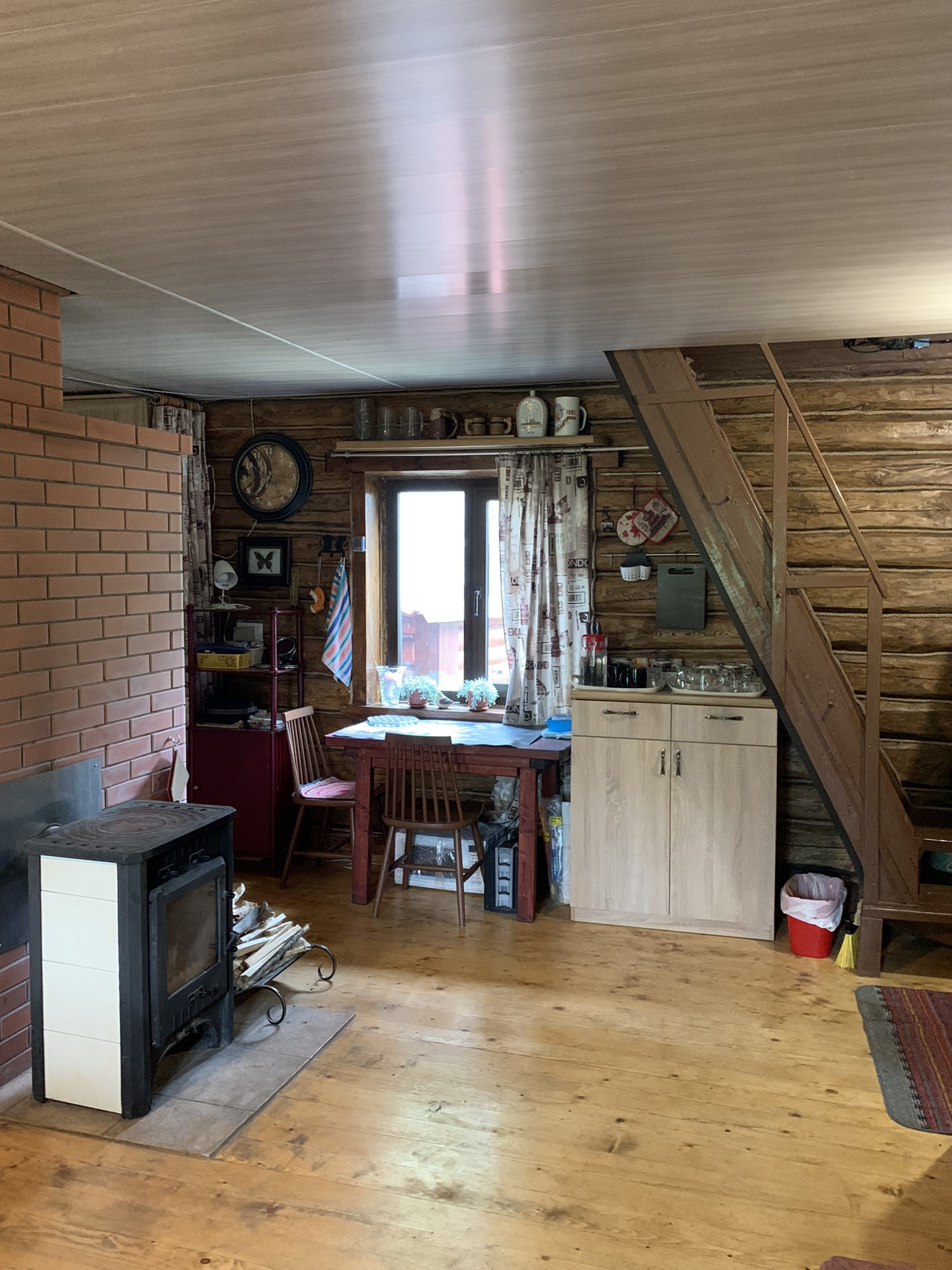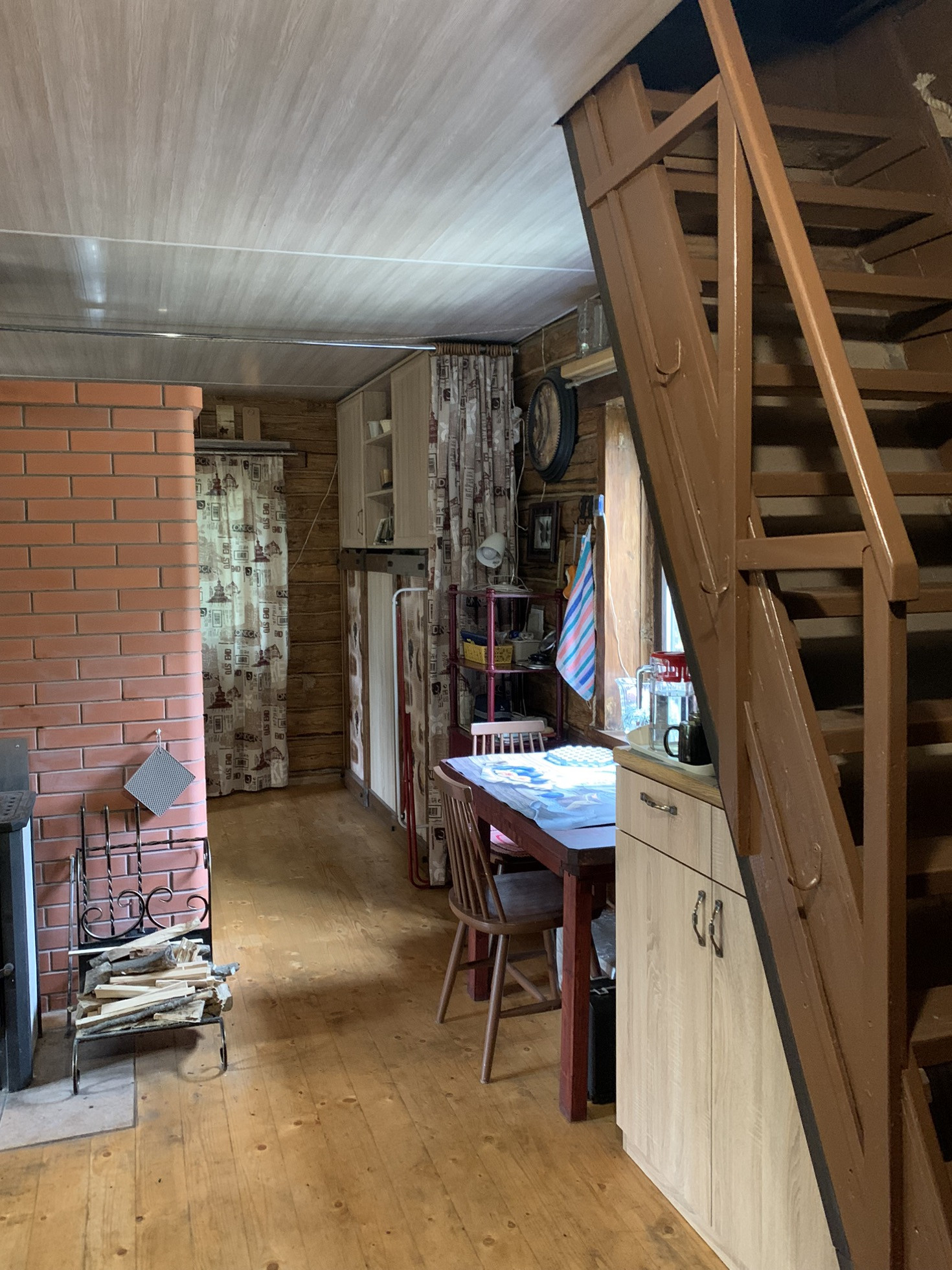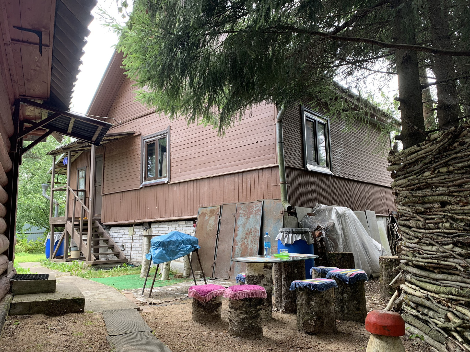 Дом :деревянный (Бревно) 1-но этажный с высоким чердаком. Этаж - высокий. Дом стоит на капитальных железобетонных сваях , В Доме расположены: веранда, кухня и  просторная гостиная, в которой  2-е откидные 2-х спальные кровати. ( на время сна пространство зонируется). На чердаке большая спальня и небольшая комнатка . Окна ПВХ пластик.