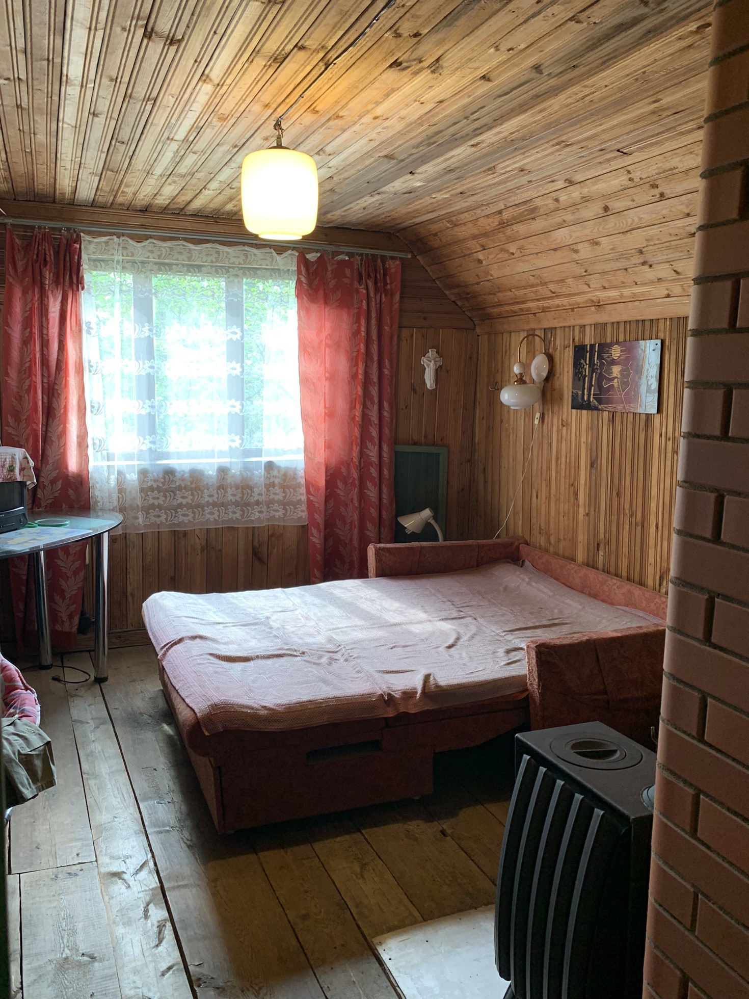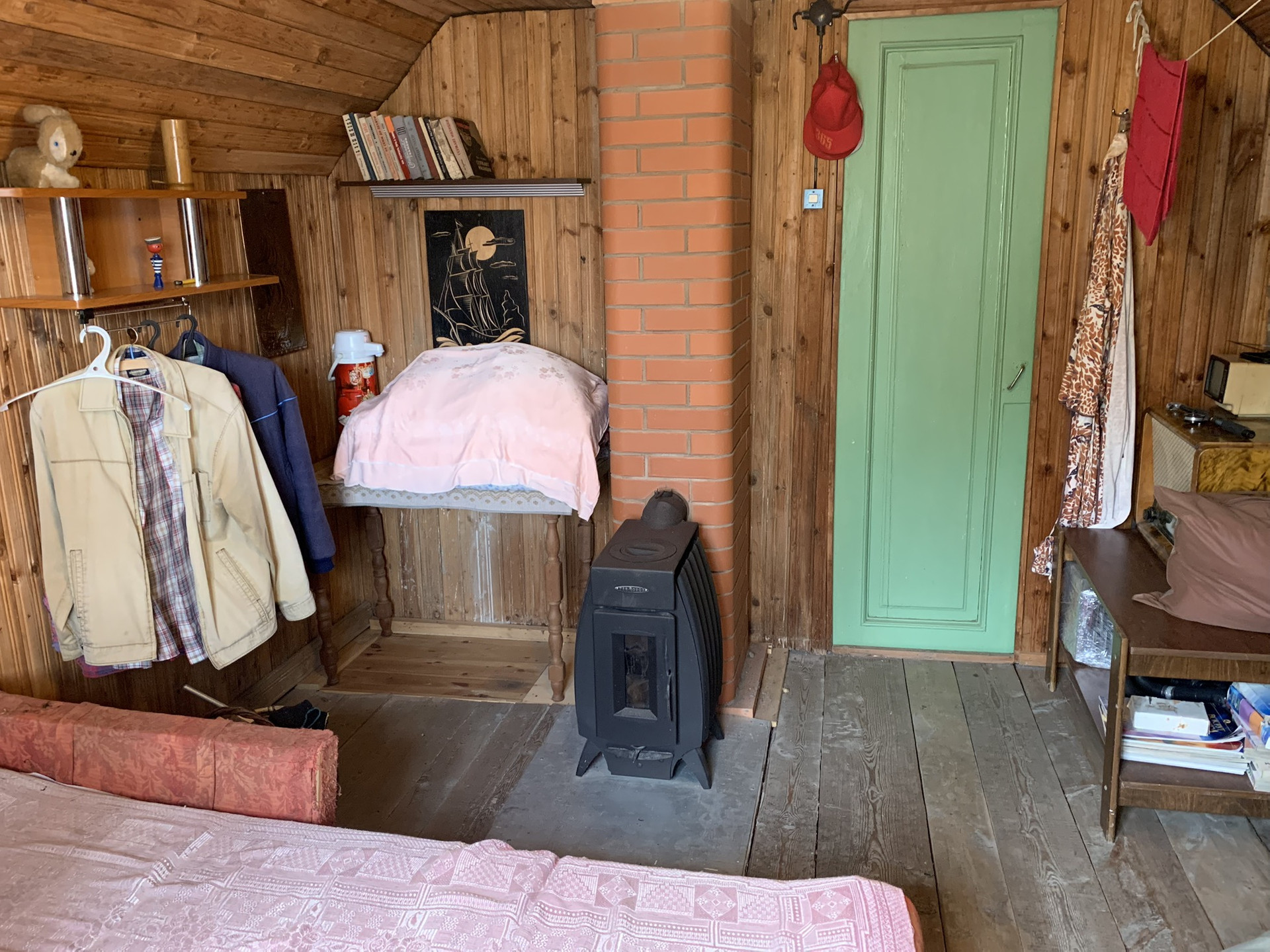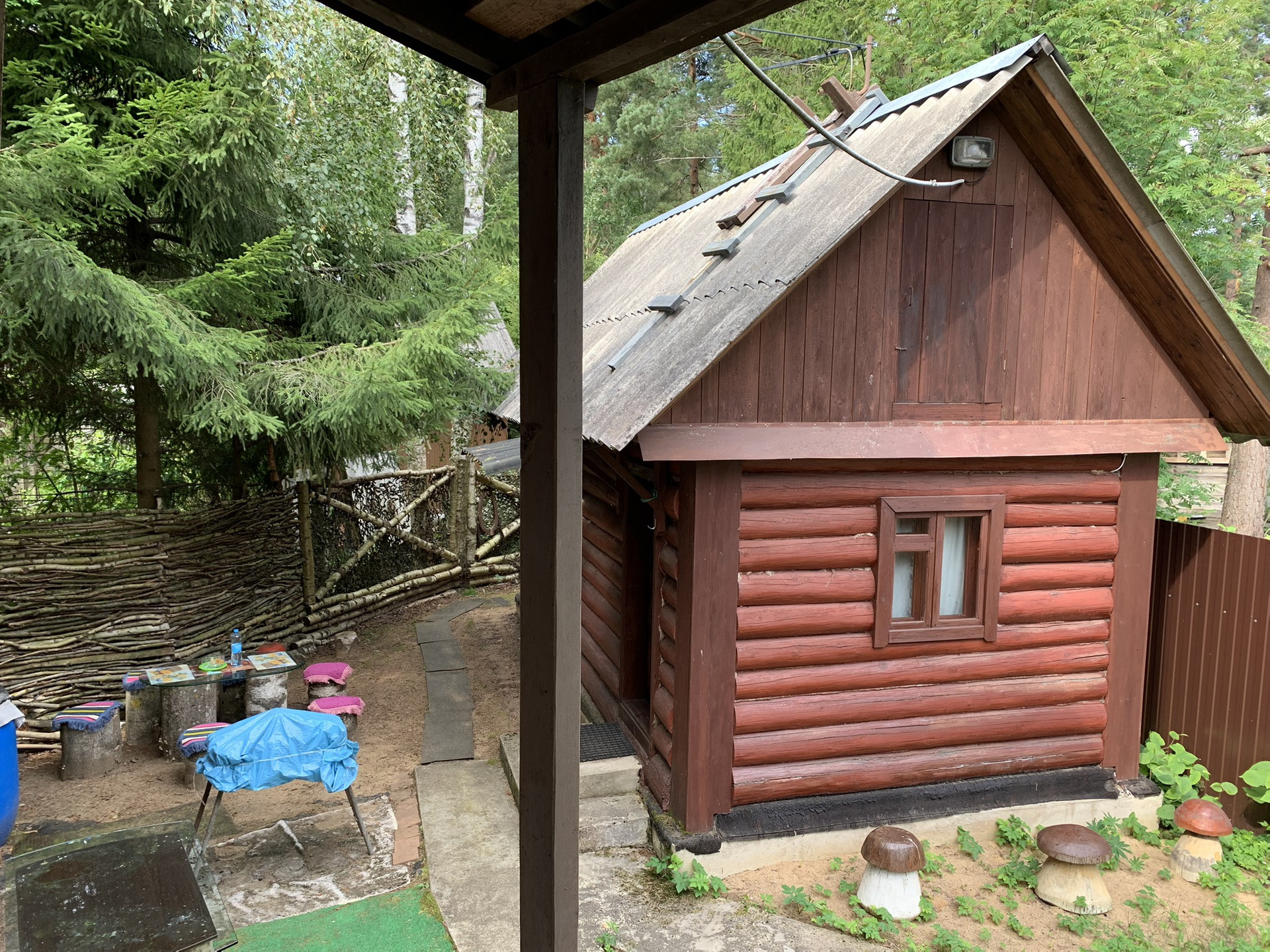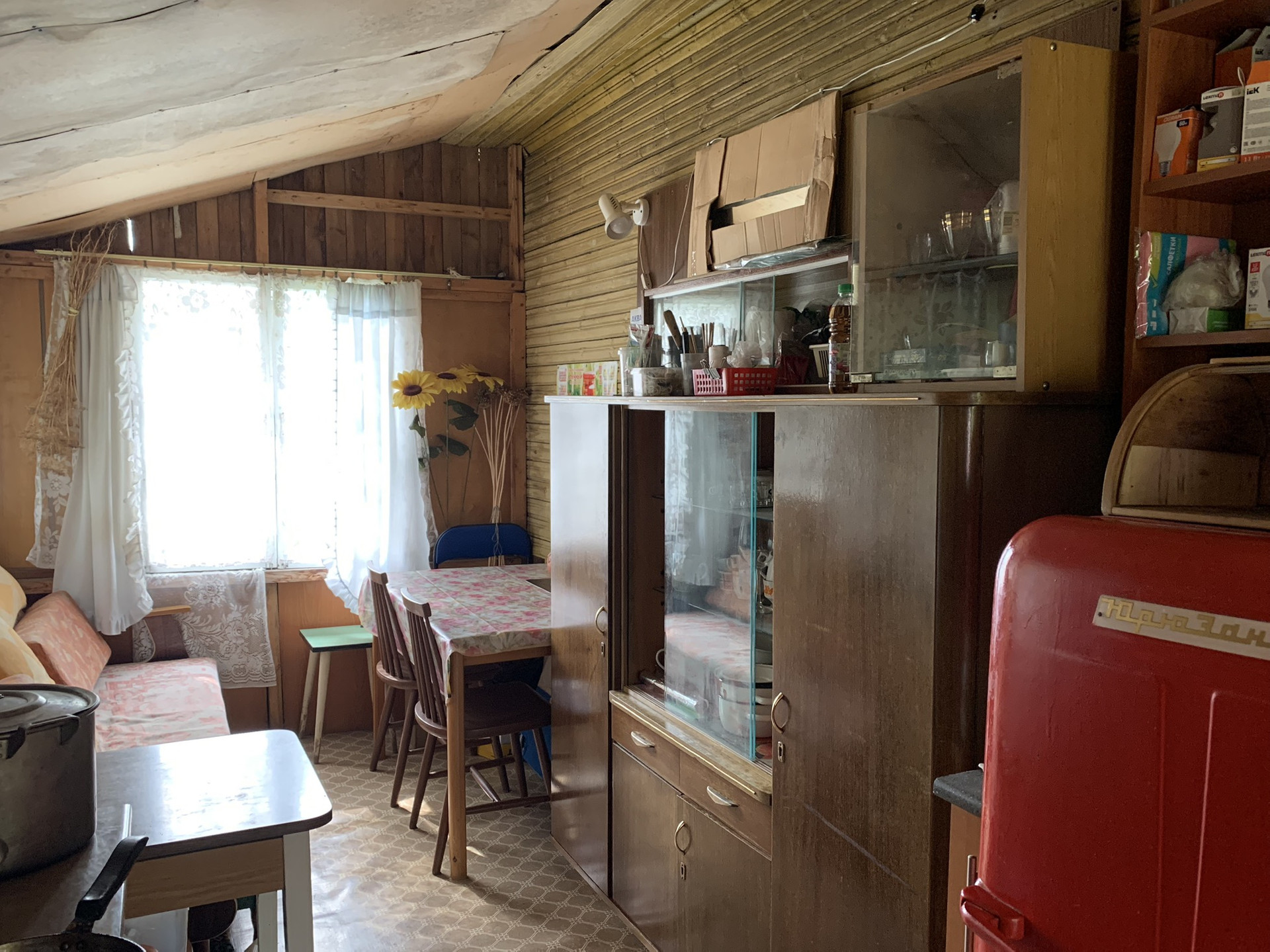 Дом :деревянный (Бревно) 1-но этажный с высоким чердаком. Этаж - высокий. Дом стоит на капитальных железобетонных сваях , В Доме расположены: веранда, кухня и  просторная гостиная, в которой  2-е откидные 2-х спальные кровати. ( на время сна пространство зонируется). На чердаке большая спальня и небольшая комнатка . Окна ПВХ пластик.
