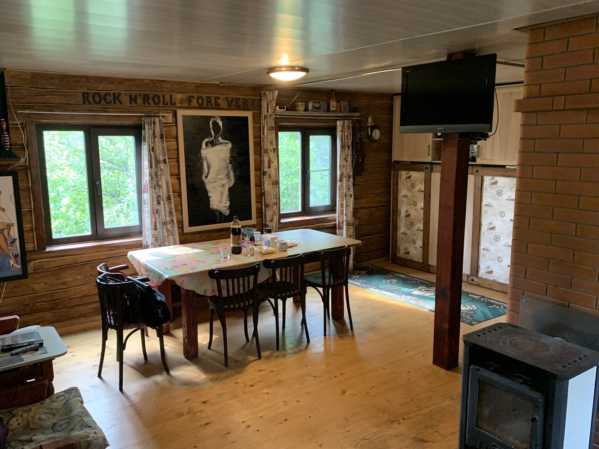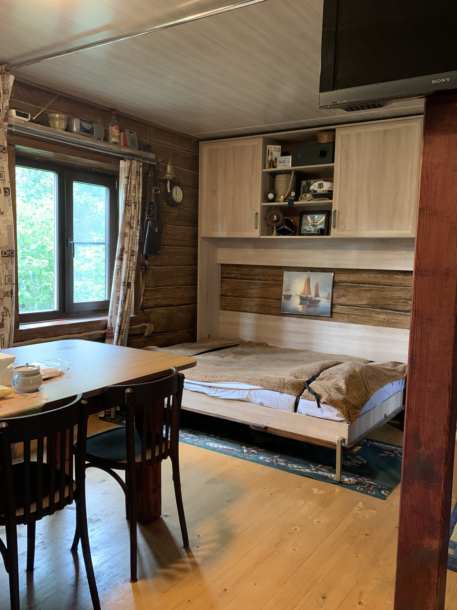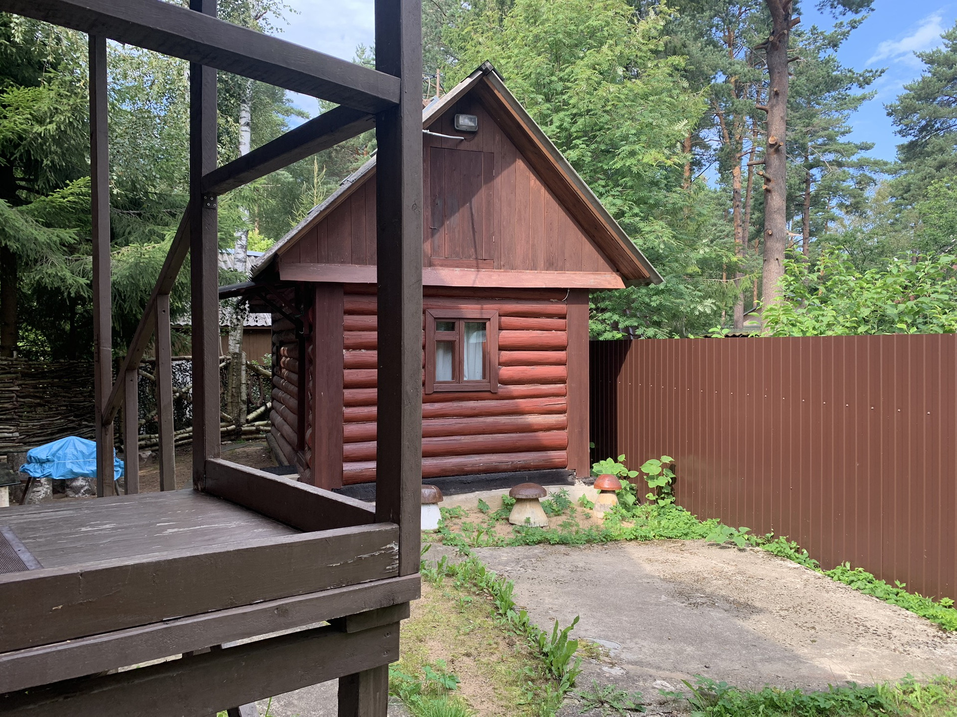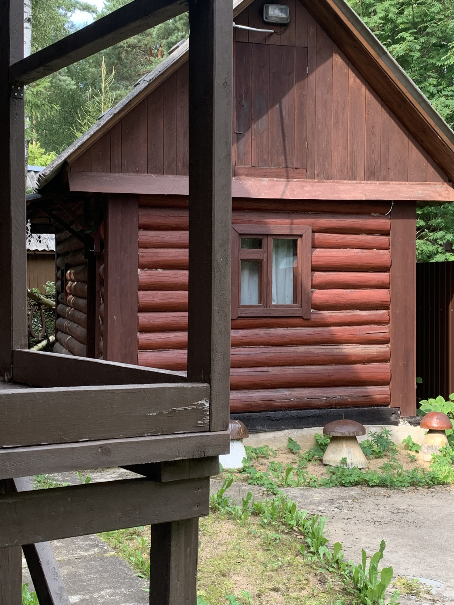 Дом :деревянный (Бревно) 1-но этажный с высоким чердаком. Этаж - высокий. Дом стоит на капитальных железобетонных сваях , В Доме расположены: веранда, кухня и  просторная гостиная, в которой  2-е откидные 2-х спальные кровати. ( на время сна пространство зонируется). На чердаке большая спальня и небольшая комнатка . Окна ПВХ пластик.