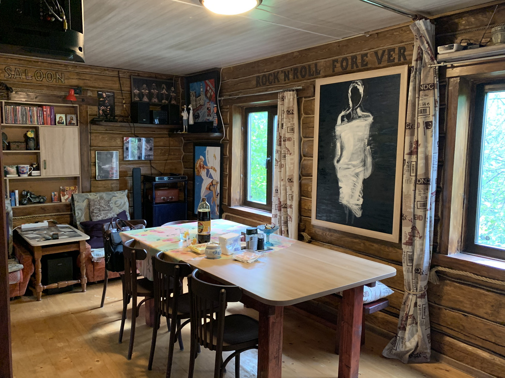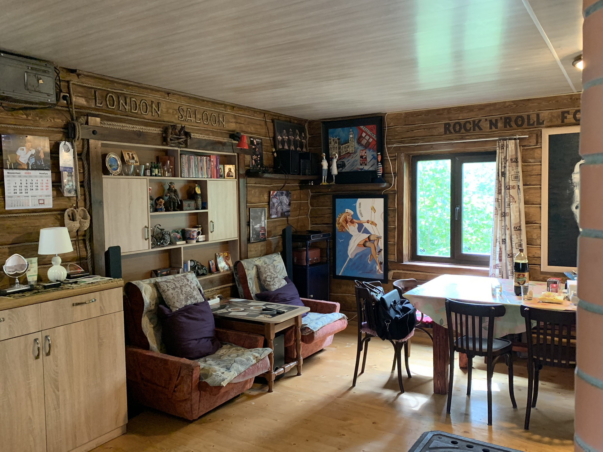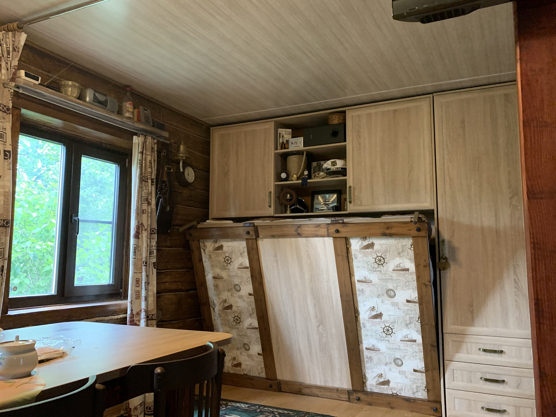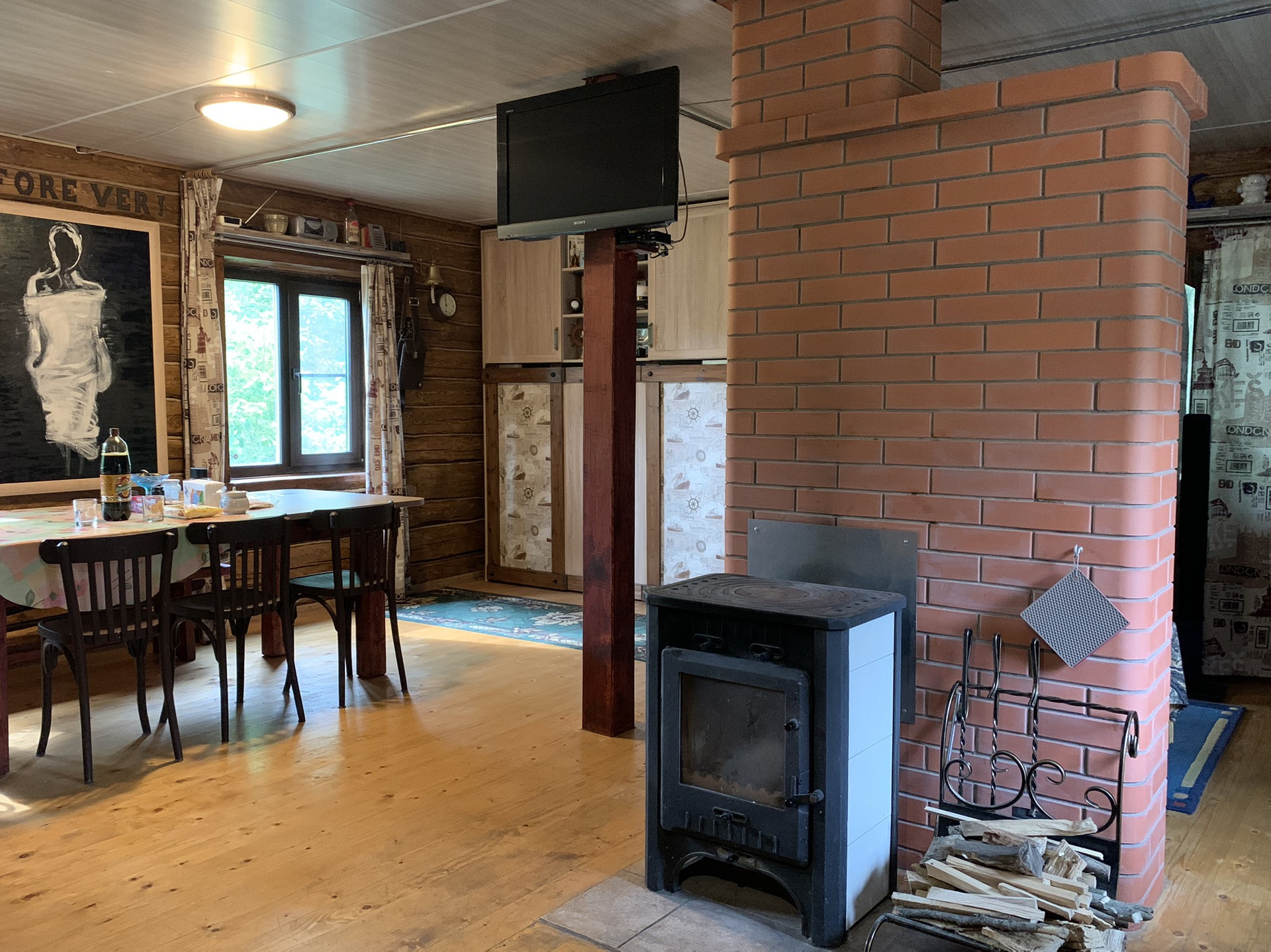 Дом :деревянный (Бревно) 1-но этажный с высоким чердаком. Этаж - высокий. Дом стоит на капитальных железобетонных сваях , В Доме расположены: веранда, кухня и  просторная гостиная, в которой  2-е откидные 2-х спальные кровати. ( на время сна пространство зонируется). На чердаке большая спальня и небольшая комнатка . Окна ПВХ пластик.