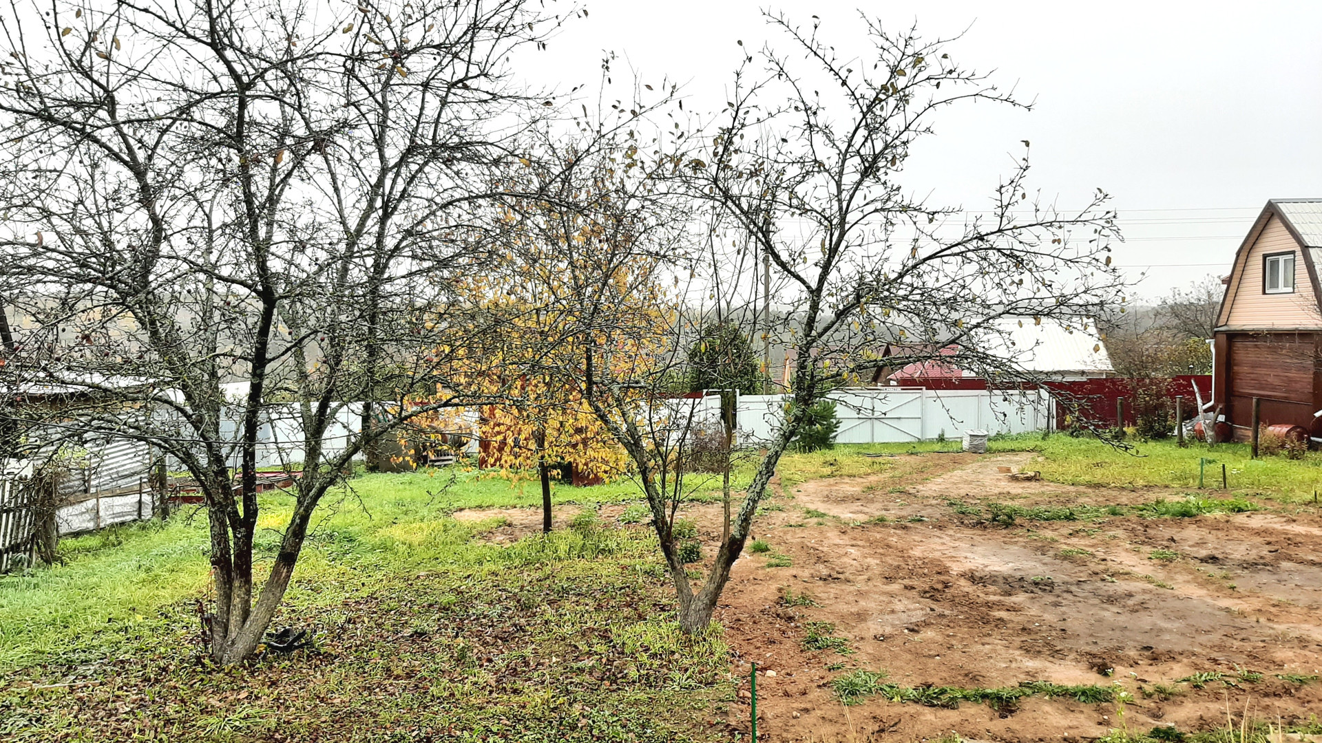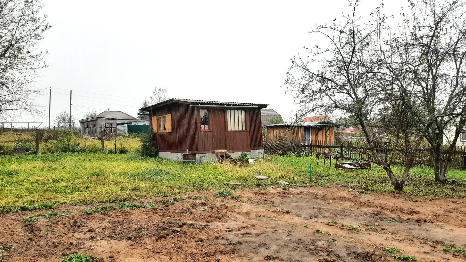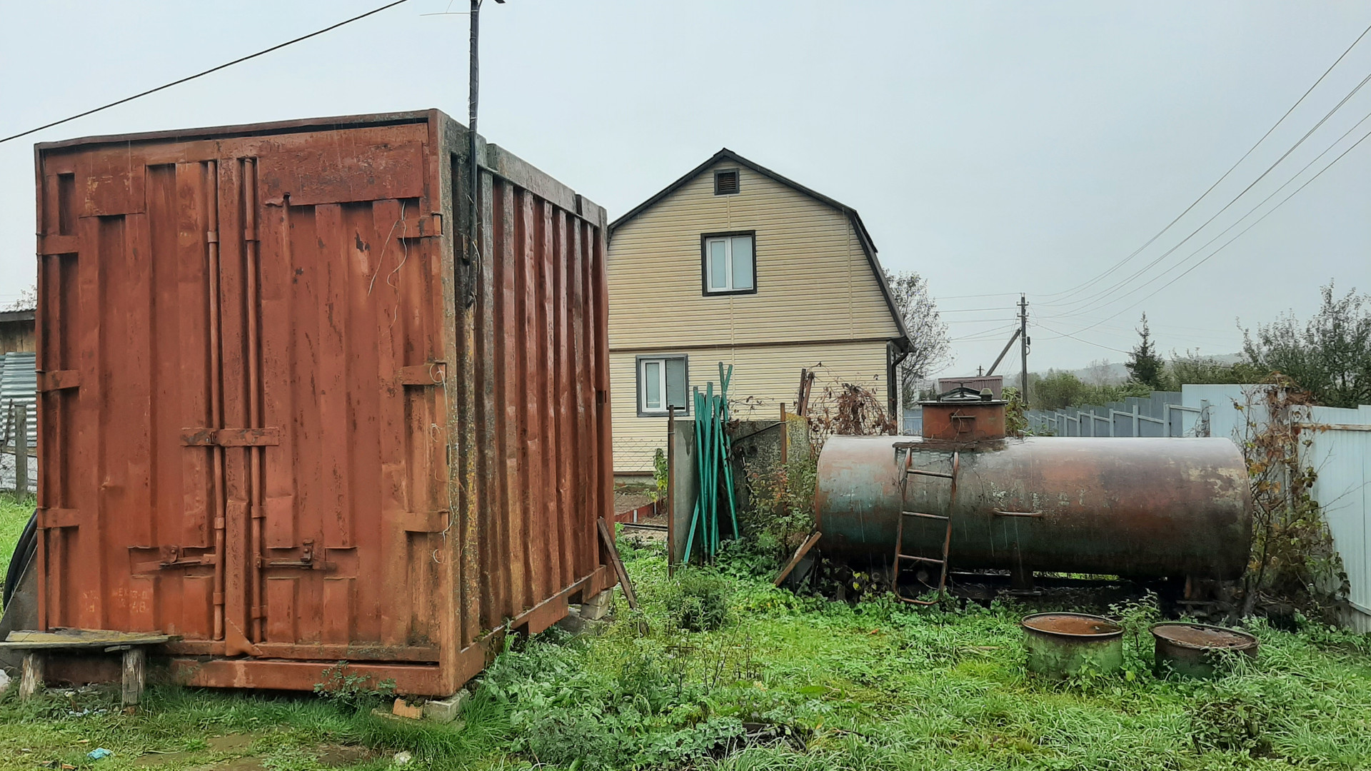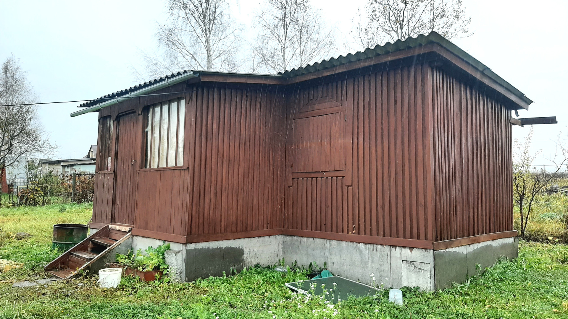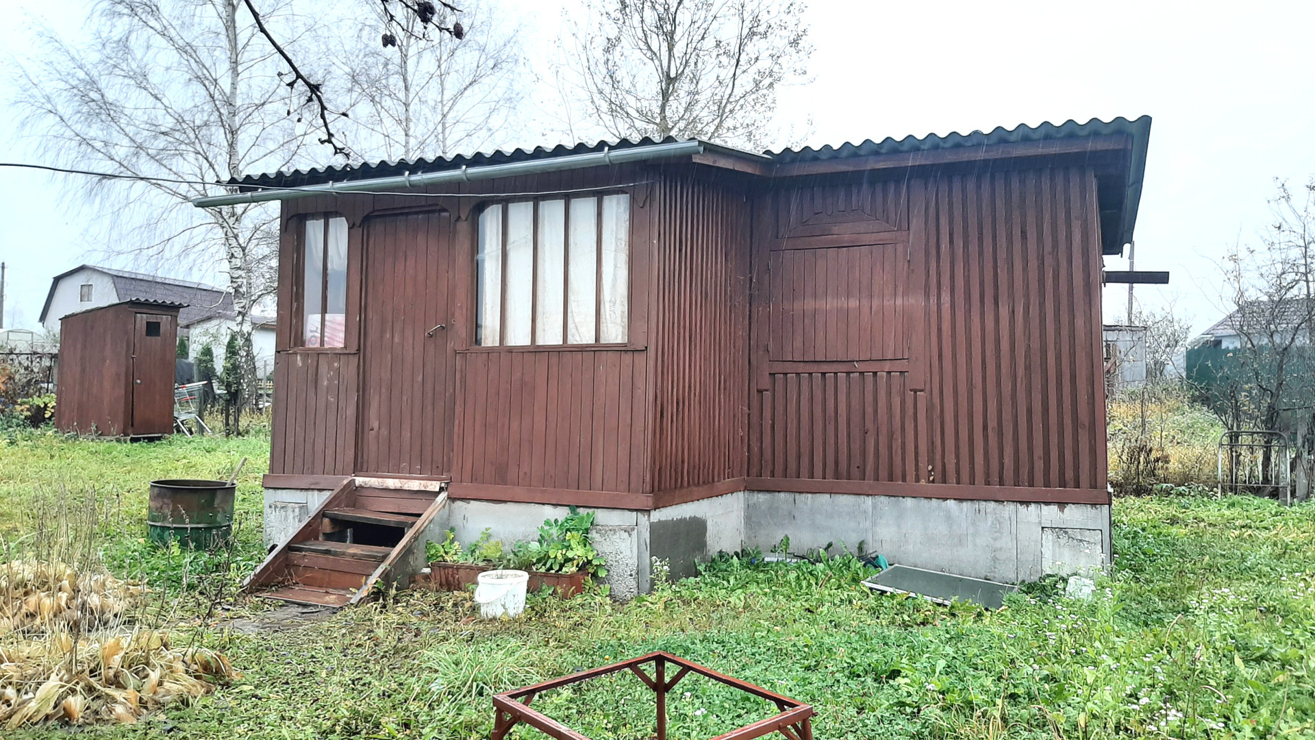 Участок 8 соток, сухой, ровный, имеет небольшой уклон. Огорожен, есть калитка и ворота. На участке туалет, скважина 25 м, металлический контейнер и бочка для воды.