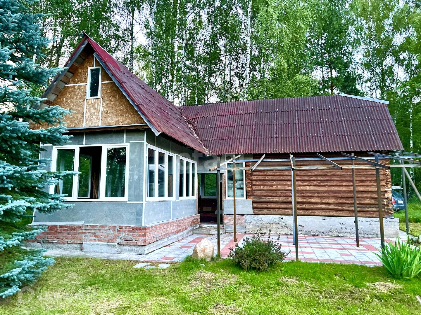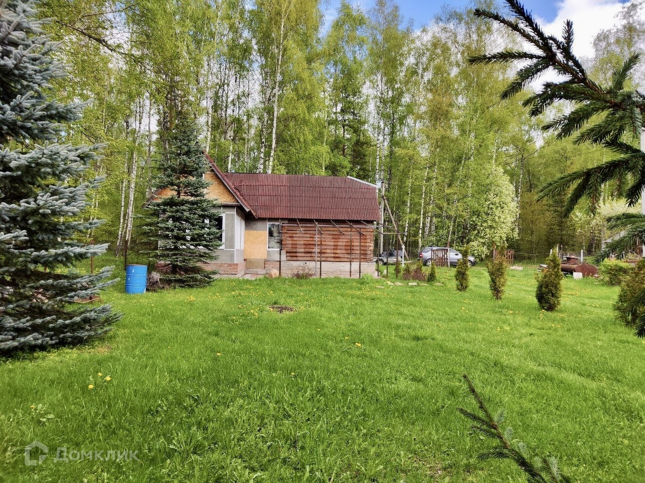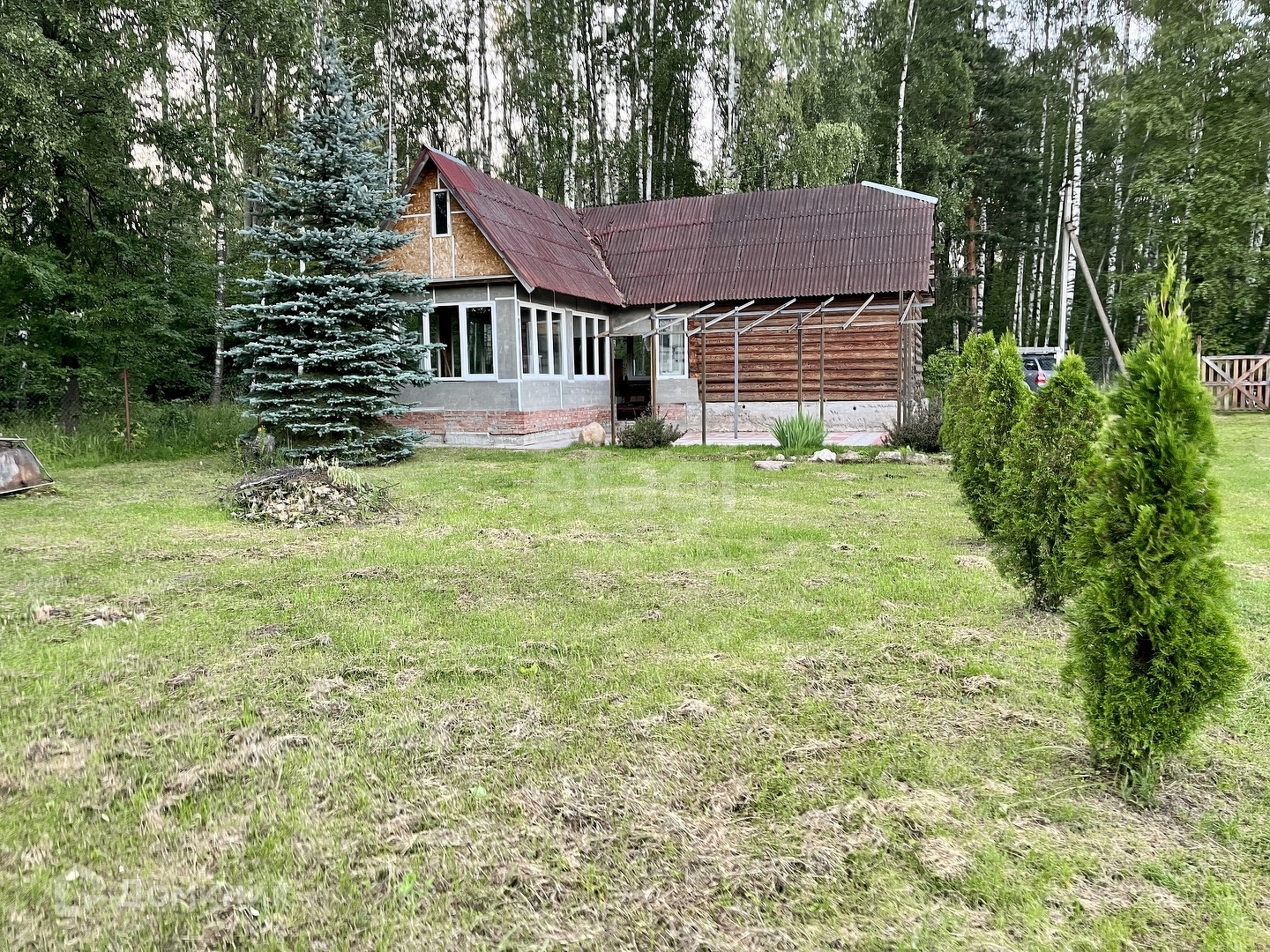 Окна дома – пластиковые, обеспечивая отличную звукоизоляцию и сохранение тепла. Внутри дома использована экологически чистая вагонка, создавая уютную и приятную атмосферу для жизни. На участке также расположены два нежилых строения. Первое из них – не законченный проект бани с летней кухней, которая примыкает к просторному навесу. Второе – хозяйственный блок, включающий летний душ, туалет и дровницы.