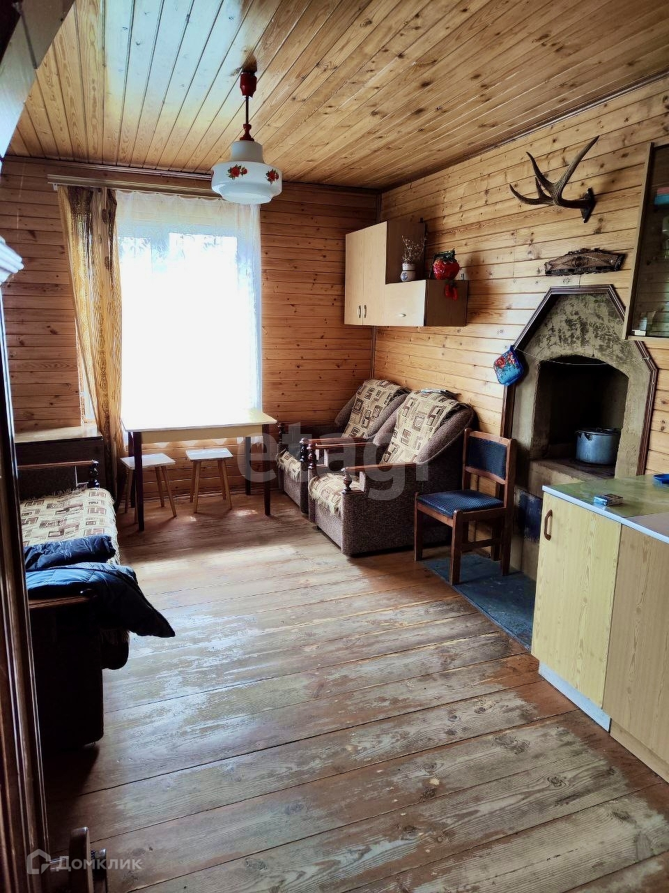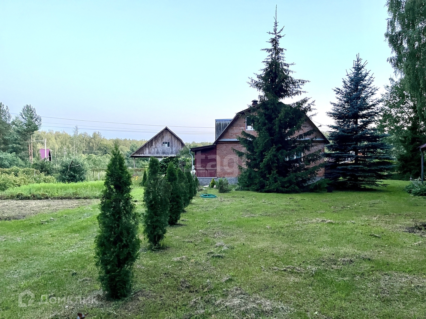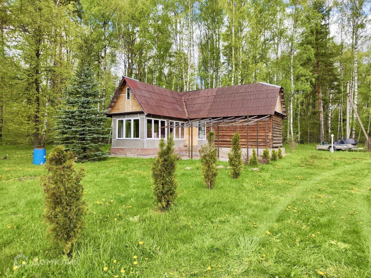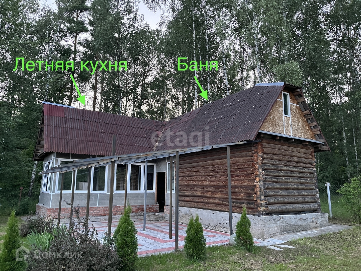 Окна дома – пластиковые, обеспечивая отличную звукоизоляцию и сохранение тепла. Внутри дома использована экологически чистая вагонка, создавая уютную и приятную атмосферу для жизни. На участке также расположены два нежилых строения. Первое из них – не законченный проект бани с летней кухней, которая примыкает к просторному навесу. Второе – хозяйственный блок, включающий летний душ, туалет и дровницы.