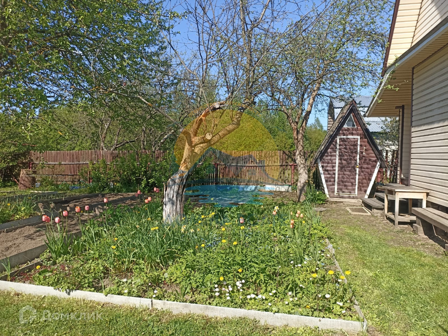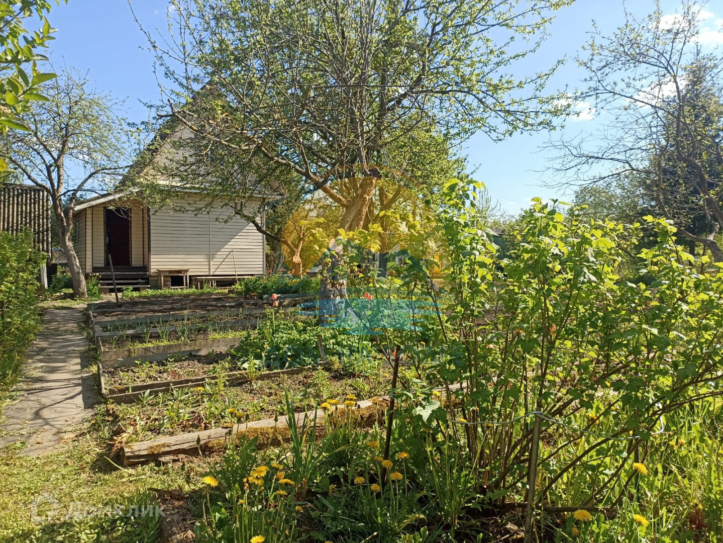 На участке яблони, вишня, кусты смородины, крыжовника, разнообразные цветы