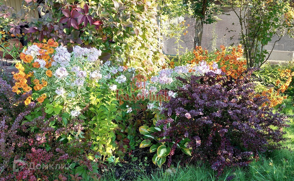 Растут плодовые деревья, кустарники, множество декоративных кустов и